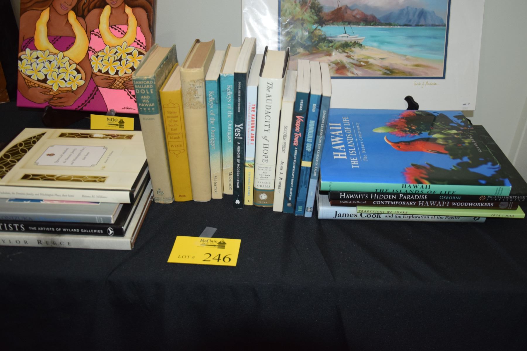 ASSORTED BOOKS INCLUDING "OBAMA AUDACITY OF HOPE", "JAMES COOK EXPLORATION OF THE PACIFIC", "THE KAHUNA & I", KIM TAYLOR REECE - HAWAII'S HIDDEN PARADISE", CONTEMPORY HAWAIIAN WOODWORKERS" (21 PCS)