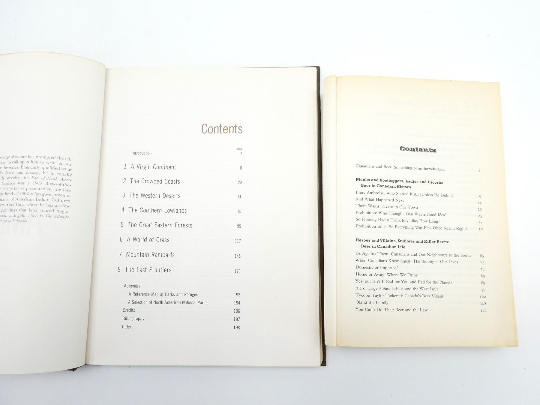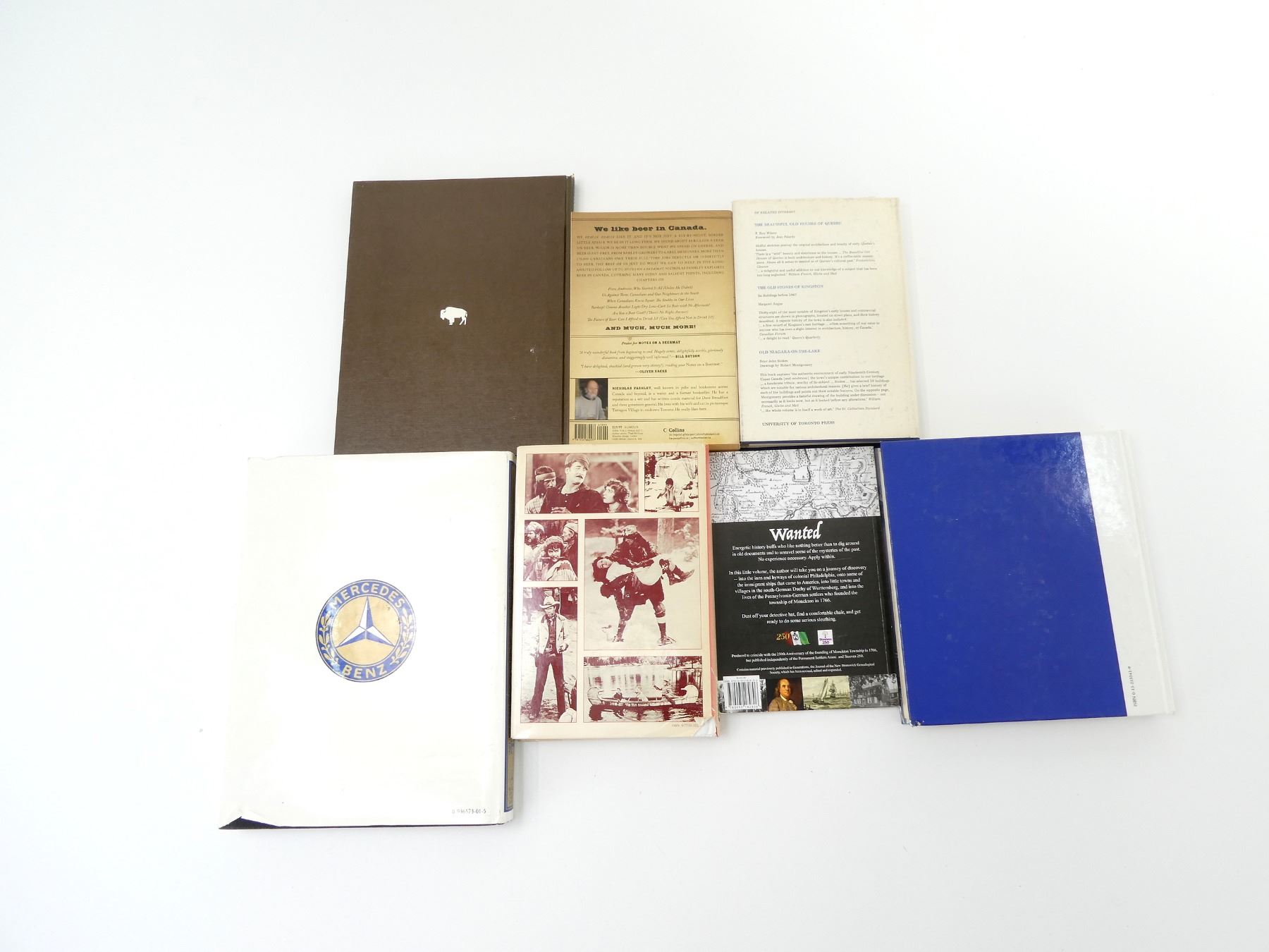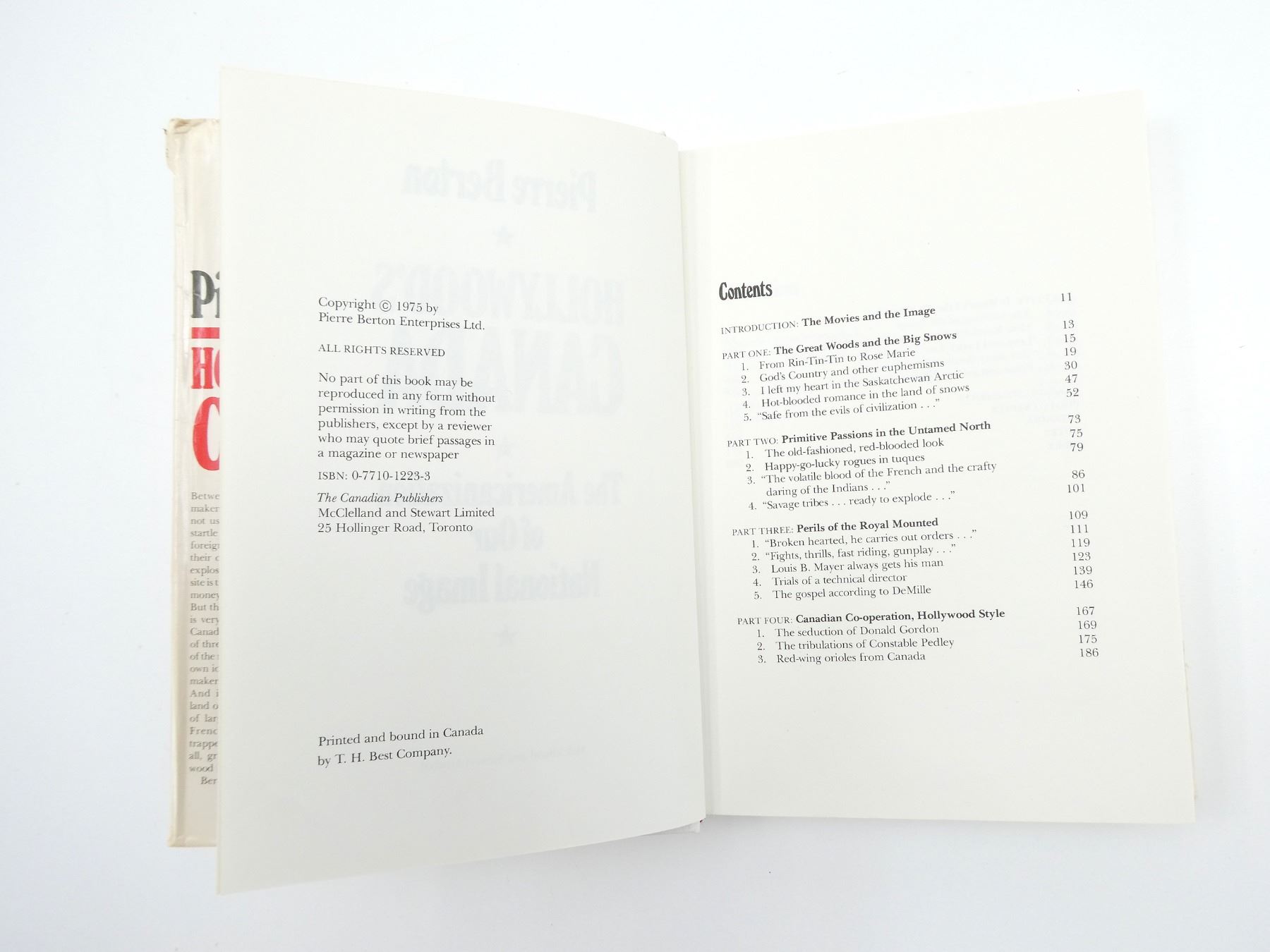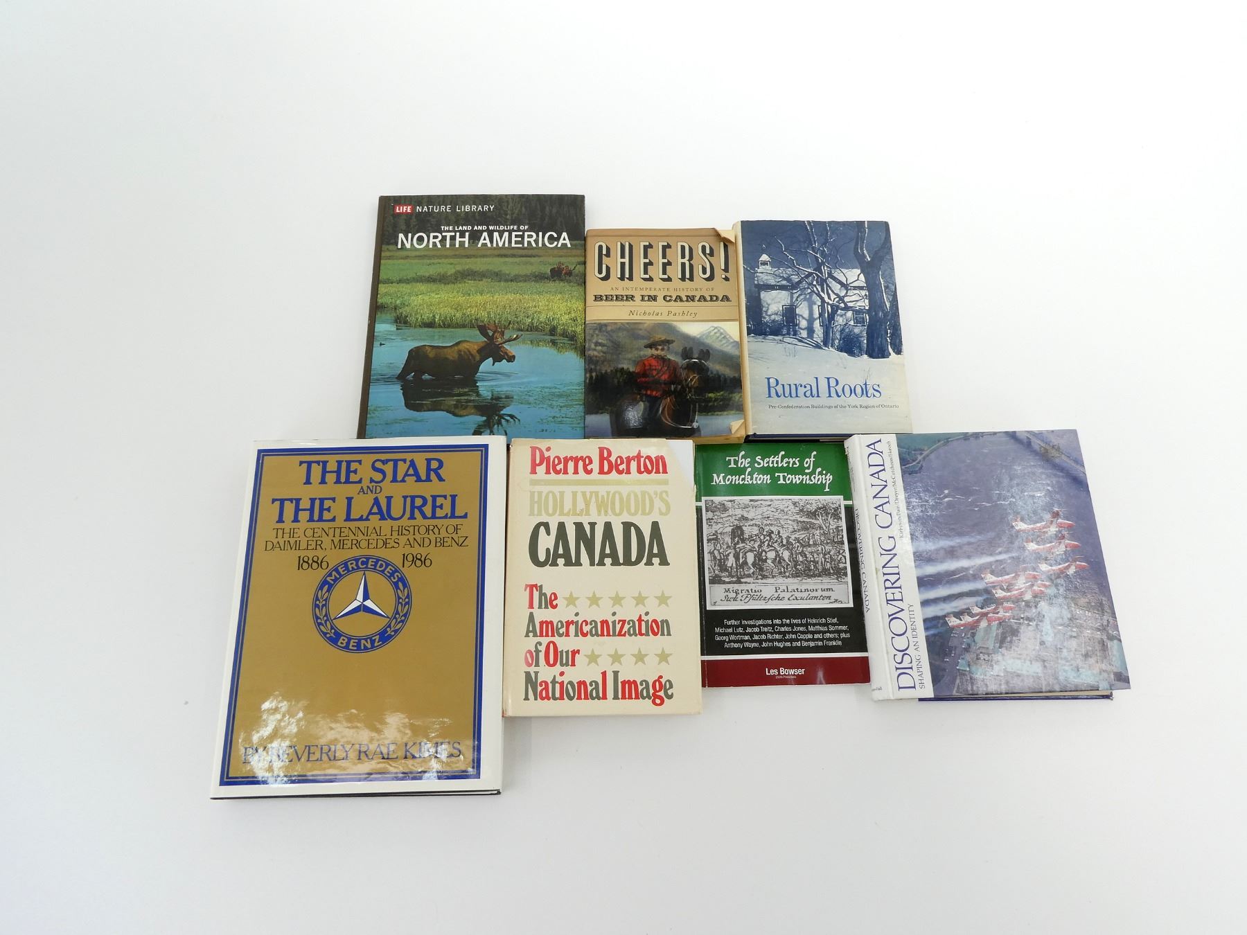 LOT INCLUDES; (1) "THE STAR AND THE LAUREL" BOOK, BY BEVERLY RAE KIMES, HARD COVER WITH DUST COVER, ISBN 0-936573-01-5, (1) "THE LAND AND WILDLIFE OF NORTH AMERICA" BOOK, BY PETER FARB, COPYRIGHT 1966, (1) "DISCOVERING CANADA SHAPING AN IDENTITY" BOOK, EDITED BY RONALD C. KIRBYSON, HARD COVER, ISBN 0-13-215541-9, (1) "THE SETTLERS OF MONCKTON TOWNSHIP" BOOK, BY LES BOWSER, SOFT COVER, ISBN 0-978-0-9951828-0-6, (1) "RURAL ROOTS" BOOK, BY MARY BYERS, JAN KENNEDY & MARGARET MCBURNEY, HARD COVER WITH DUST COVER, ISBN 0-8020-2230-8, (1) "HOLLYWOOD'S CANADA" BOOK, BY PIERRE BERTON, HARD COVER WITH DUST COVER, ISBN 0-7710-1223-3, (1) "CHEERS! A INTEMPERATE HISTORY OF BEER IN CANADA" BOOK, BY NICHOLAS PASHLEY, SOFT COVER, ISBN 978-55468-257-7. SEE PHOTOS.