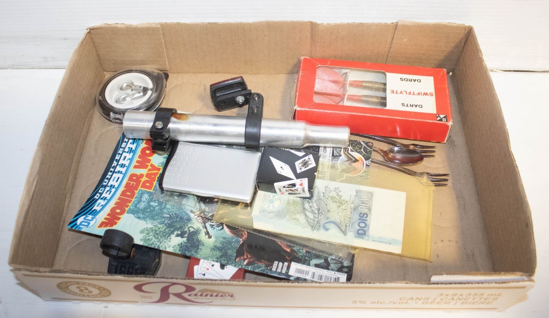 EAR PHONES, 2$ BRAZILIAN DOLLAR BILL, 3 DARTS, SILVERWARE, COMIC BOOK