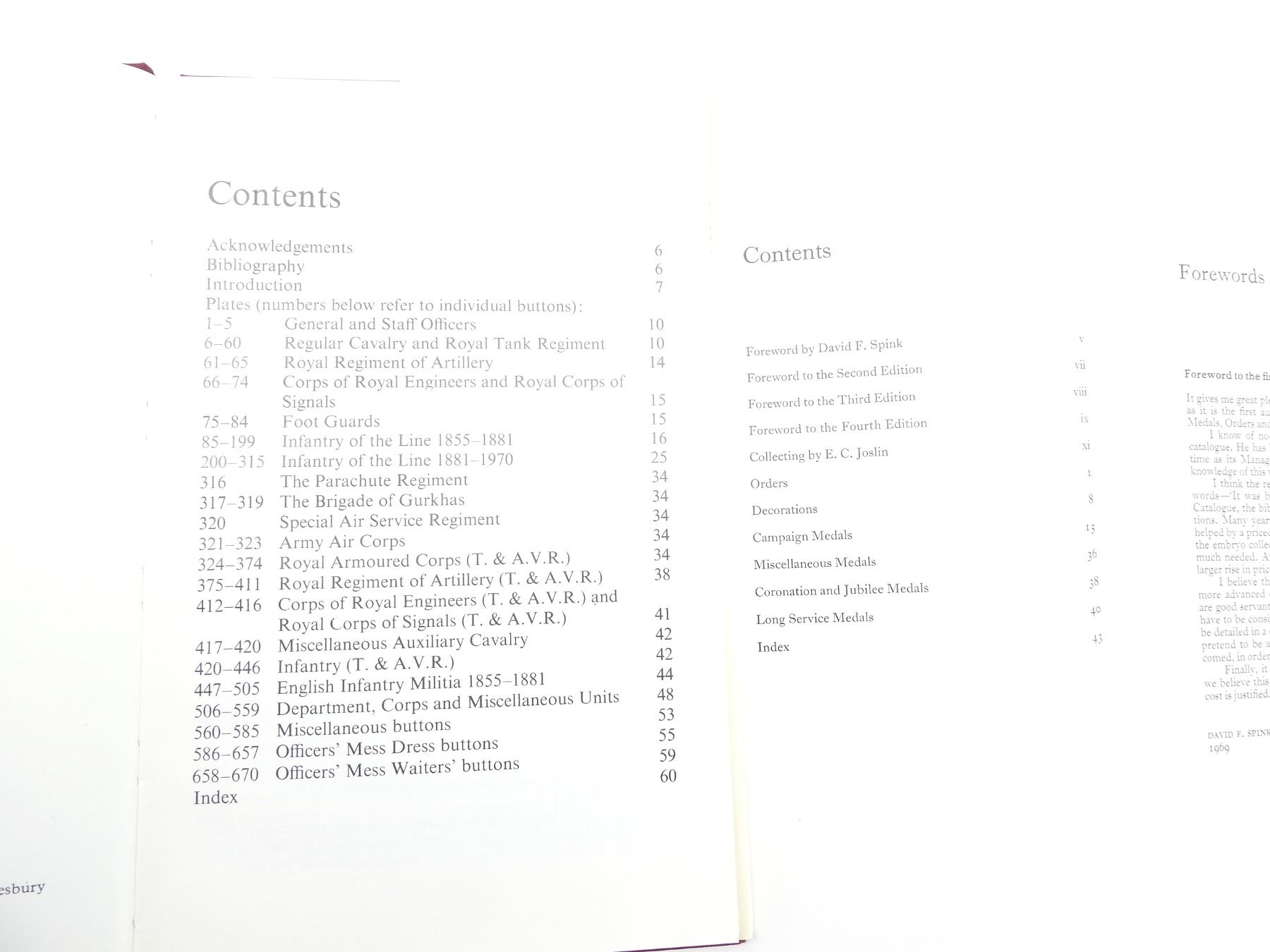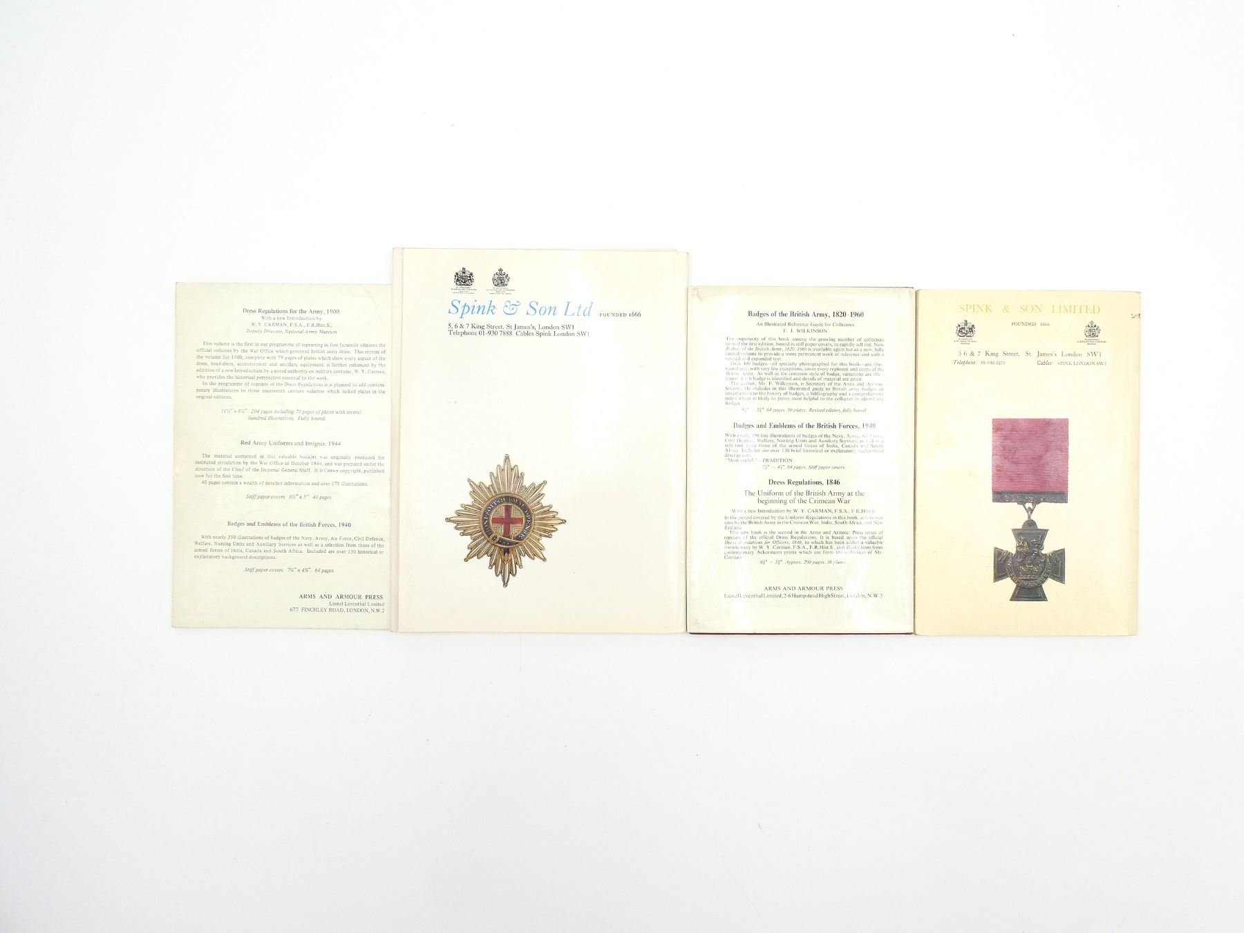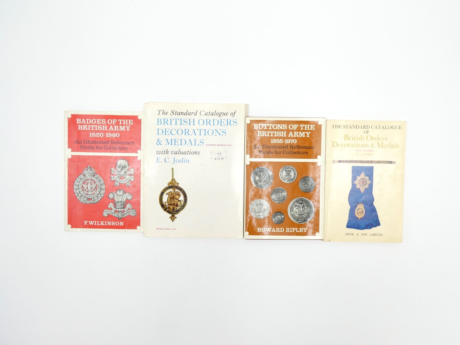 SOFT COVERS, LOT INCLUDES; (1) "THE STANDARD CATALOGUE OF BRITISH ORDERS, DECORATIONS & MEDALS" BOOK BY E. C. JOSLIN, COPYRIGHT 1969, (1) "THE STANDARD CATALOGUE OF BRITISH ORDERS, DECORATIONS & MEDALS, FOURTH EDITION 1979" WITH "1981 PRICE SUPPLEMENT TO THE FOURTH EDITION" BOOK BY E. C. JOSLIN, COPYRIGHT 1979, (1) "BADGES OF THE BRITISH ARMY 1820-1960, AN ILLUSTRATED REFERENCE GUIDE FOR COLLECTORS" BOOK BY F. WILKINSON, SBN: 85368-016-7 & (1) "BUTTONS OF THE BRITISH ARMY 1855-1970, AN ILLUSTRATED REFERENCE GUIDE FOR COLLECTORS" BOOK BY HOWARD RIPLEY, SBN: 85368-065-5. SEE PHOTOS.