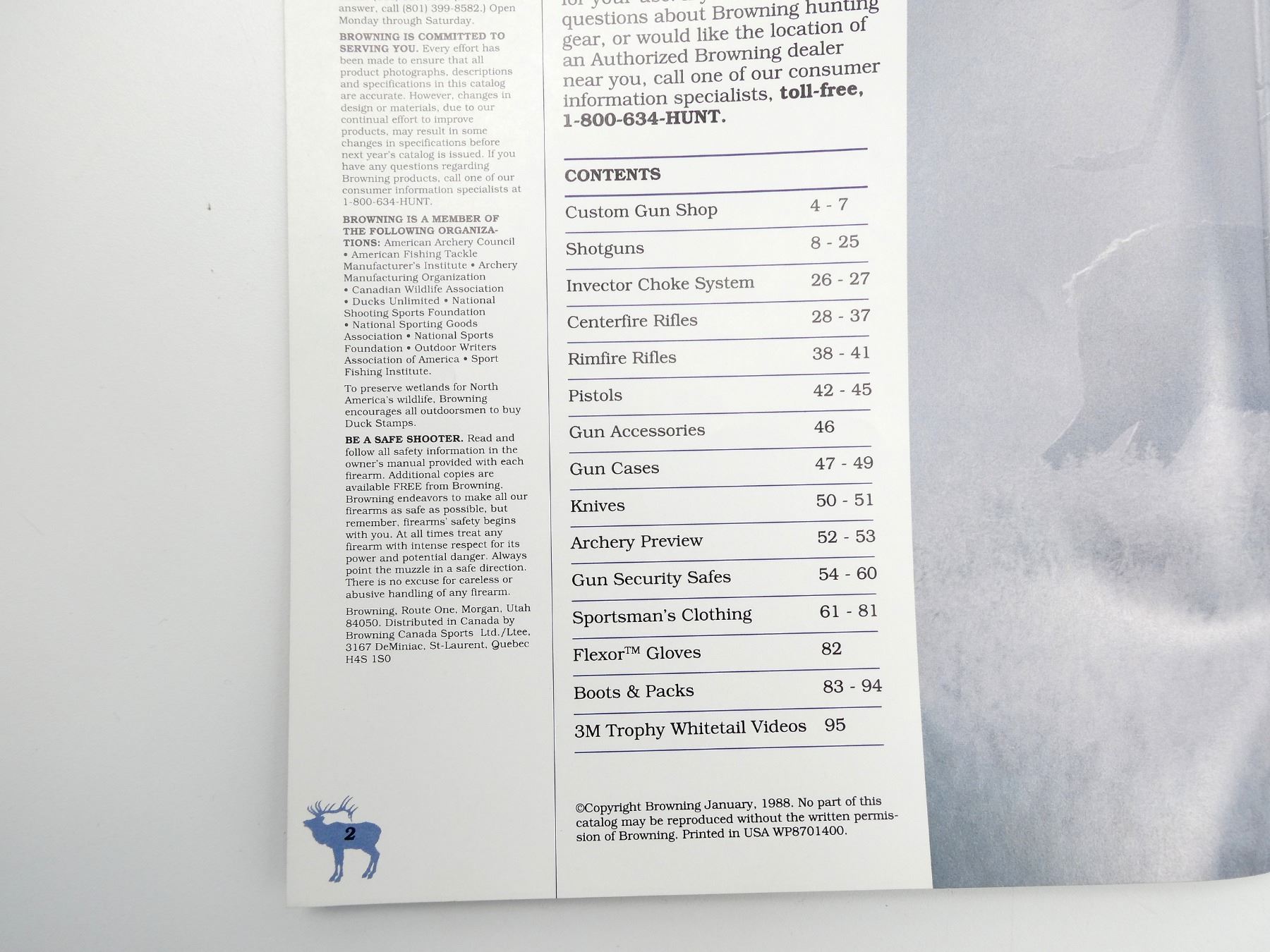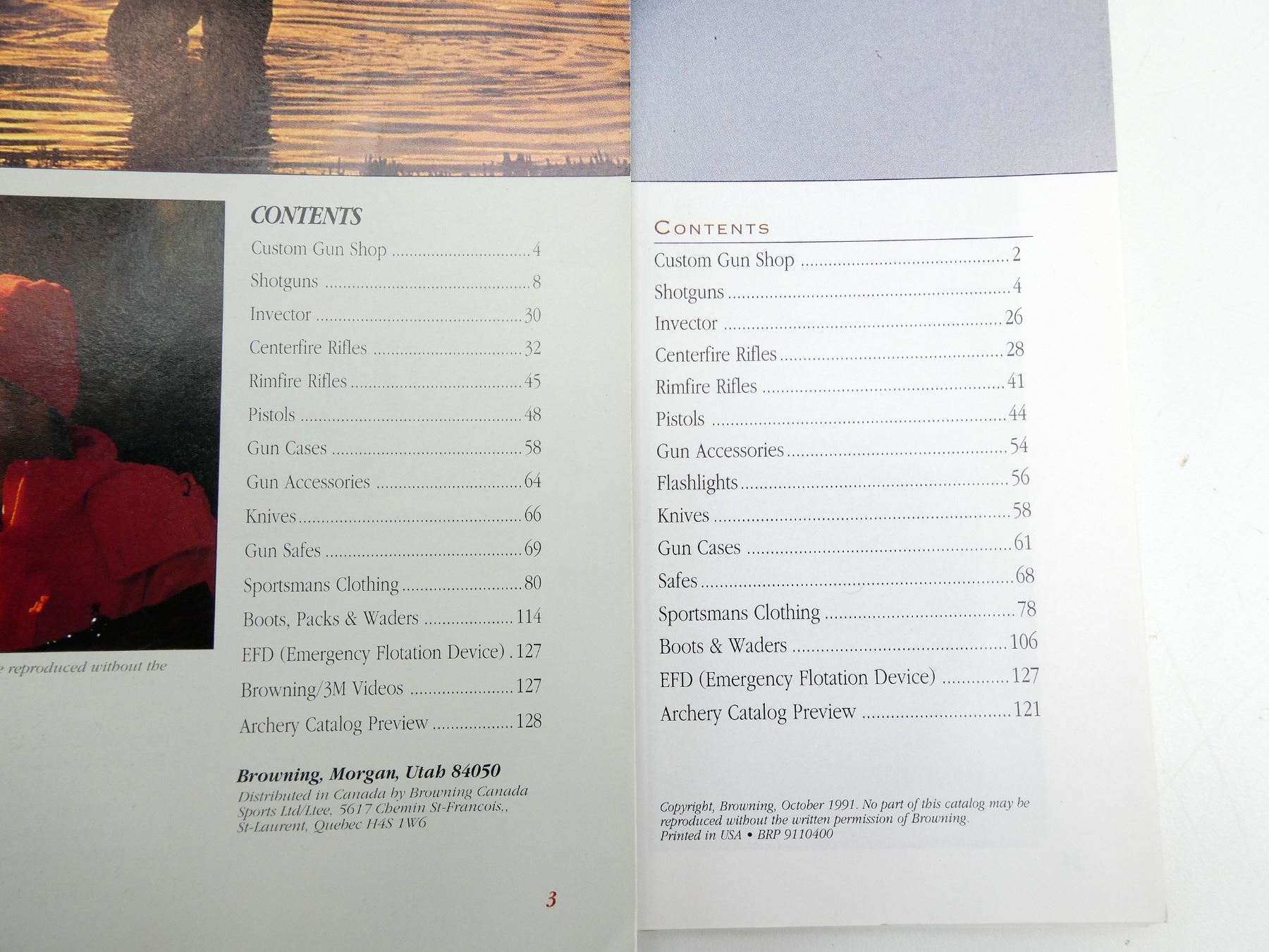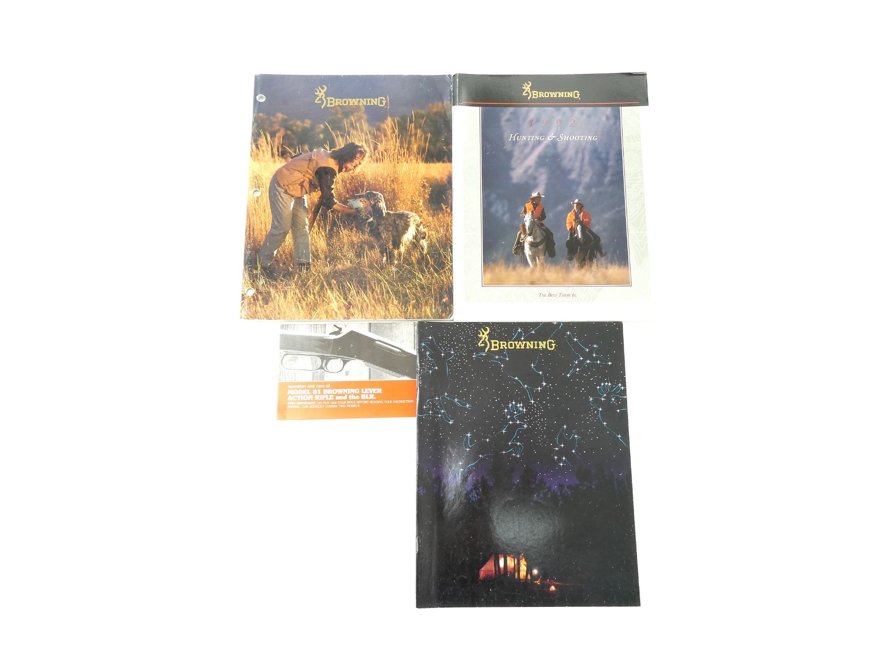 SOFT COVERS, LOT INCLUDES; (1) "BROWNING" CATALOGUE, COPYRIGHT 1990, (1) "BROWNING" CATALOGUE, COPYRIGHT 1988, (1) "BROWNING 1992 HUNTING & SHOOTING" CATALOGUE, COPYRIGHT 1991 & (1) "OPERATION AND CARE OF MODEL 81 BROWNING LEVER ACTION RIFLE AND THE BLR." MANUAL. SEE PHOTOS.