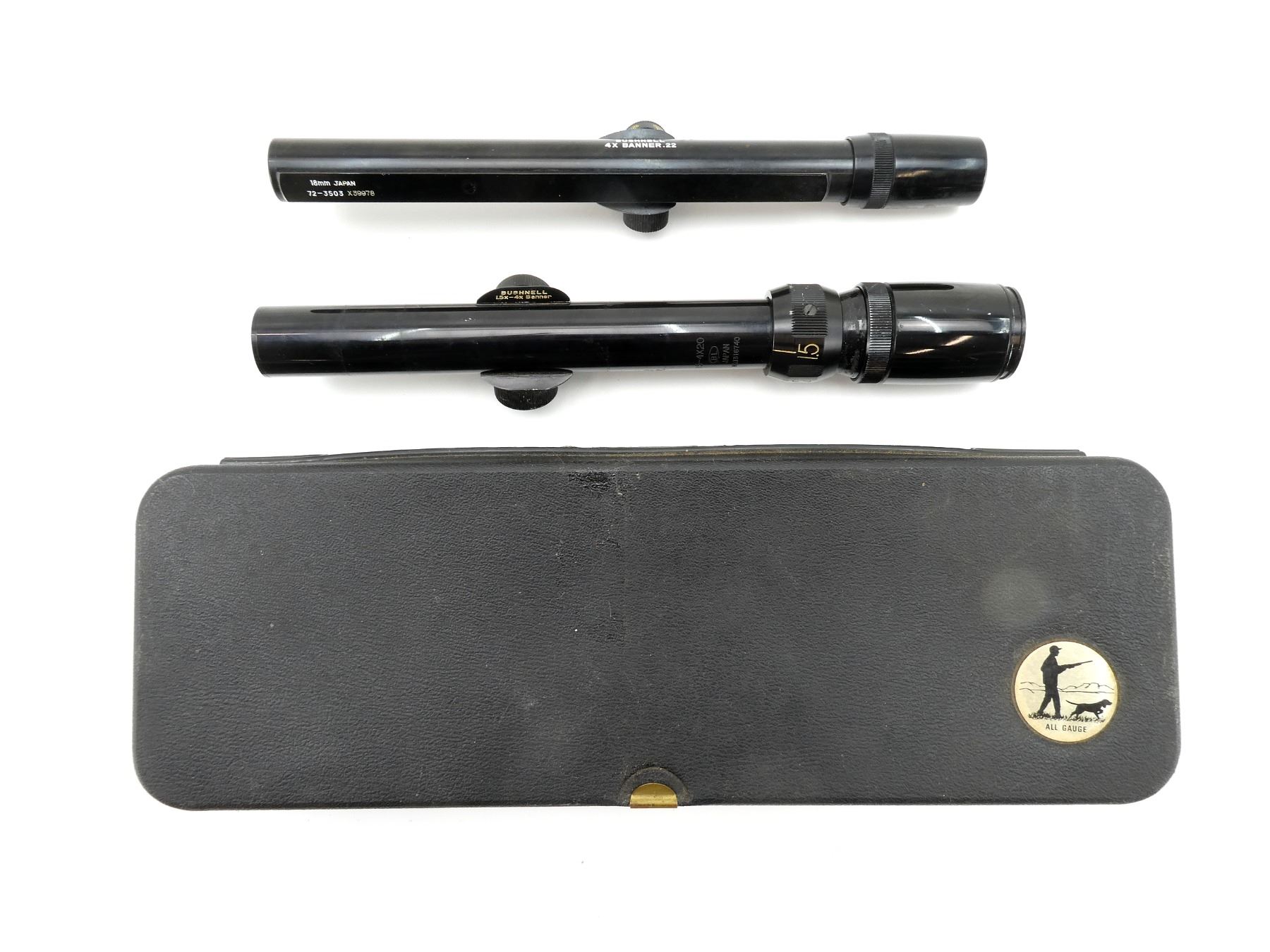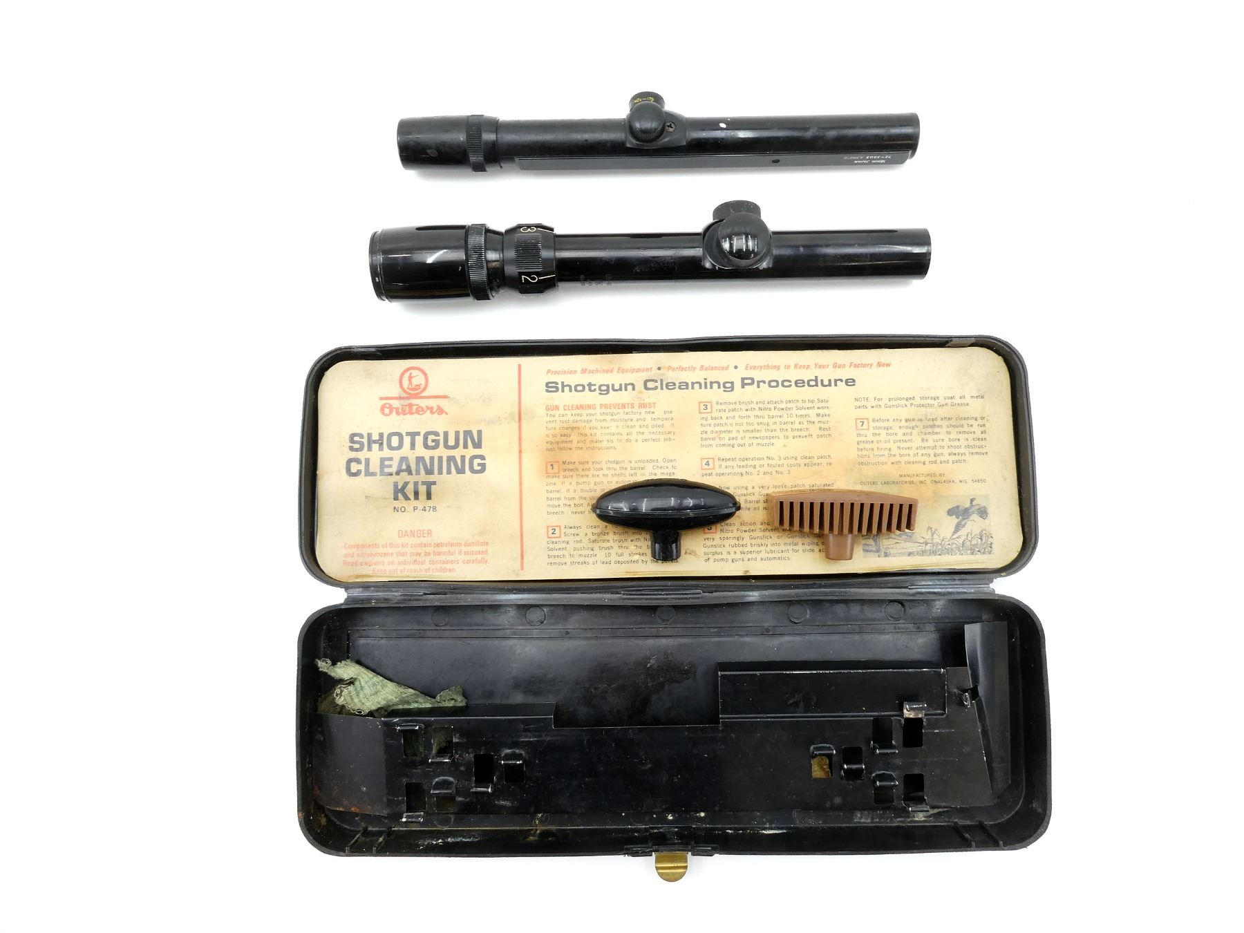 LOT INCLUDES; (1) BUSHNELL 1.5-4 X 20 BANNER RIFLE SCOPE, CLEAR OPTICS, CROSSHAIR RETICLE, 1" TUBE DIAMETER, SEIZED MAGNIFICATION RING, WINDAGE & ELEVATION KNOBS TURN, MARKED "NO. I316740", ETC., SHOWS WEAR & TEAR / USE MARKS, (1) BUSHNELL 4X BANNER .22 RIFLE SCOPE, CLEAR OPTICS, DUPLEX RETICLE, 22MM TUBE DIAMETER, WINDAGE & ELEVATION KNOBS TURN, MARKED "72-3503 X39978", ETC., SHOWS WEAR & TEAR / USE MARKS & (1) SHOTGUN CLEANING KIT, MAY NOT BE COMPLETE / PIECES MAY BE MISSING. MAY REQUIRE FITTING. SEE PHOTOS.