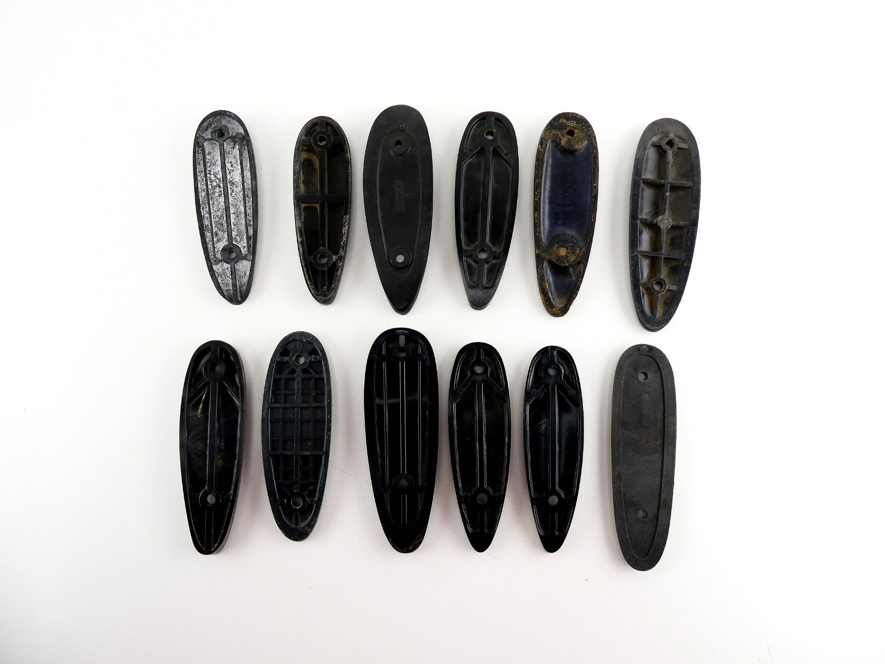LOT INCLUDES; (12) GROOVED / CHECKERED / SMOOTH BLACK POLYMER BUTT PLATES, NO SCREWS, SOME MARKED / MOST UNMARKED, APPROX. 1.5"X4.75" TO 1.75"X5". MAY REQUIRE FITTING. SEE PHOTOS.