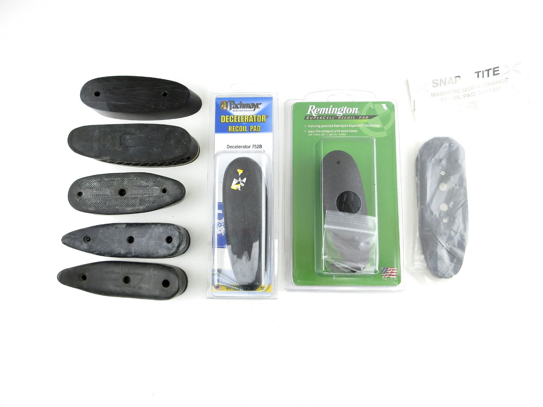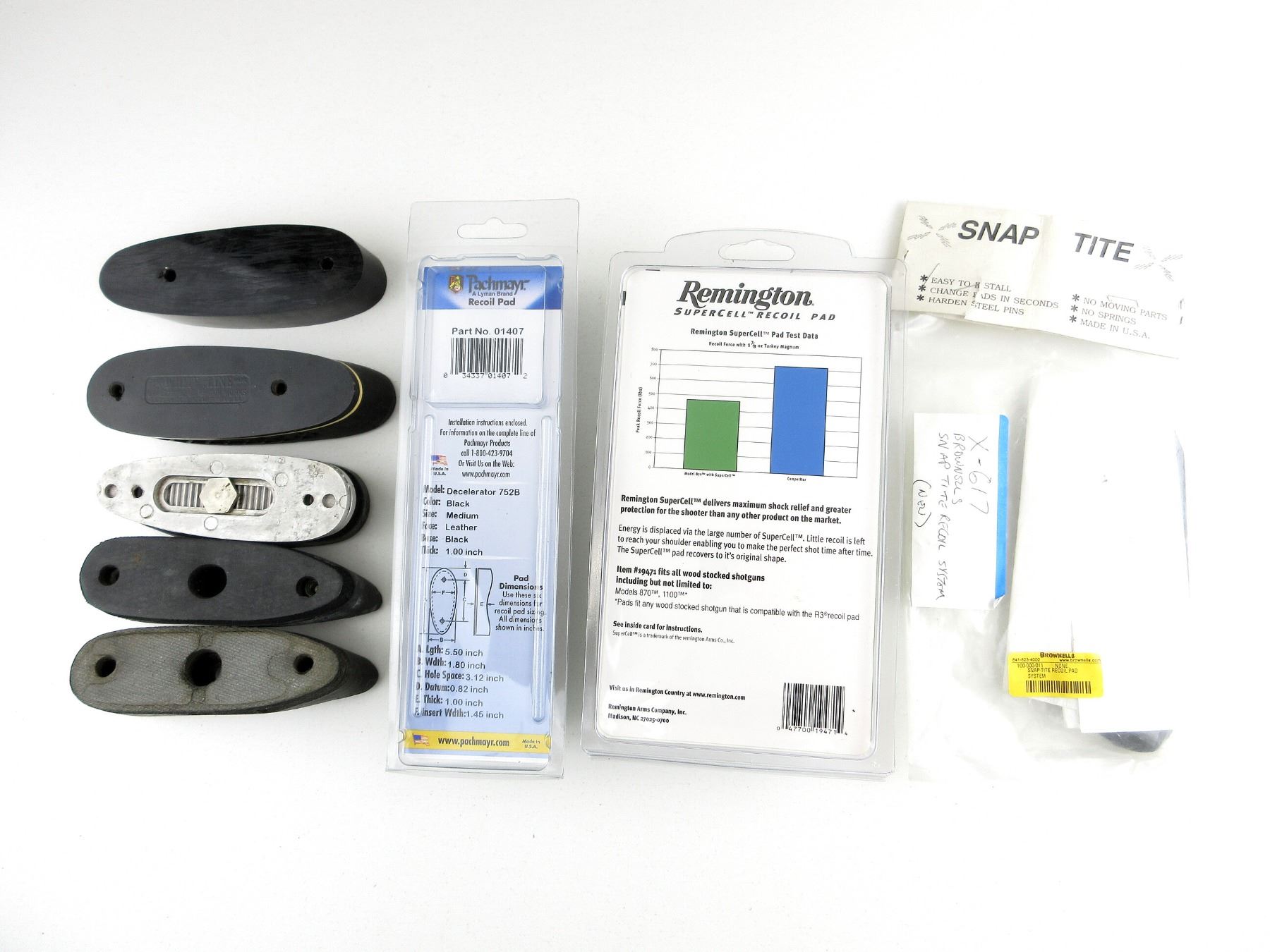 LOT INCLUDES; (1) REMINGTON SUPERCELL RECOIL PAD, APPEARS NOS IN ORIGINAL PACKAGING, (1) PACHMAYR DECELERATOR RECOIL PAD, APPEARS NOS IN ORIGINAL PACKAGING, (1) SNAP TITE MAGNETIC QUICK CHANGE RECOIL PAD SYSTEM WITH ORIGINAL PACKAGING, (4) ASSORTED BLACK RUBBER RECOIL PADS & (1) BLACK POLYMER BUTT PLATE. MAY REQUIRE FITTING. SEE PHOTOS.