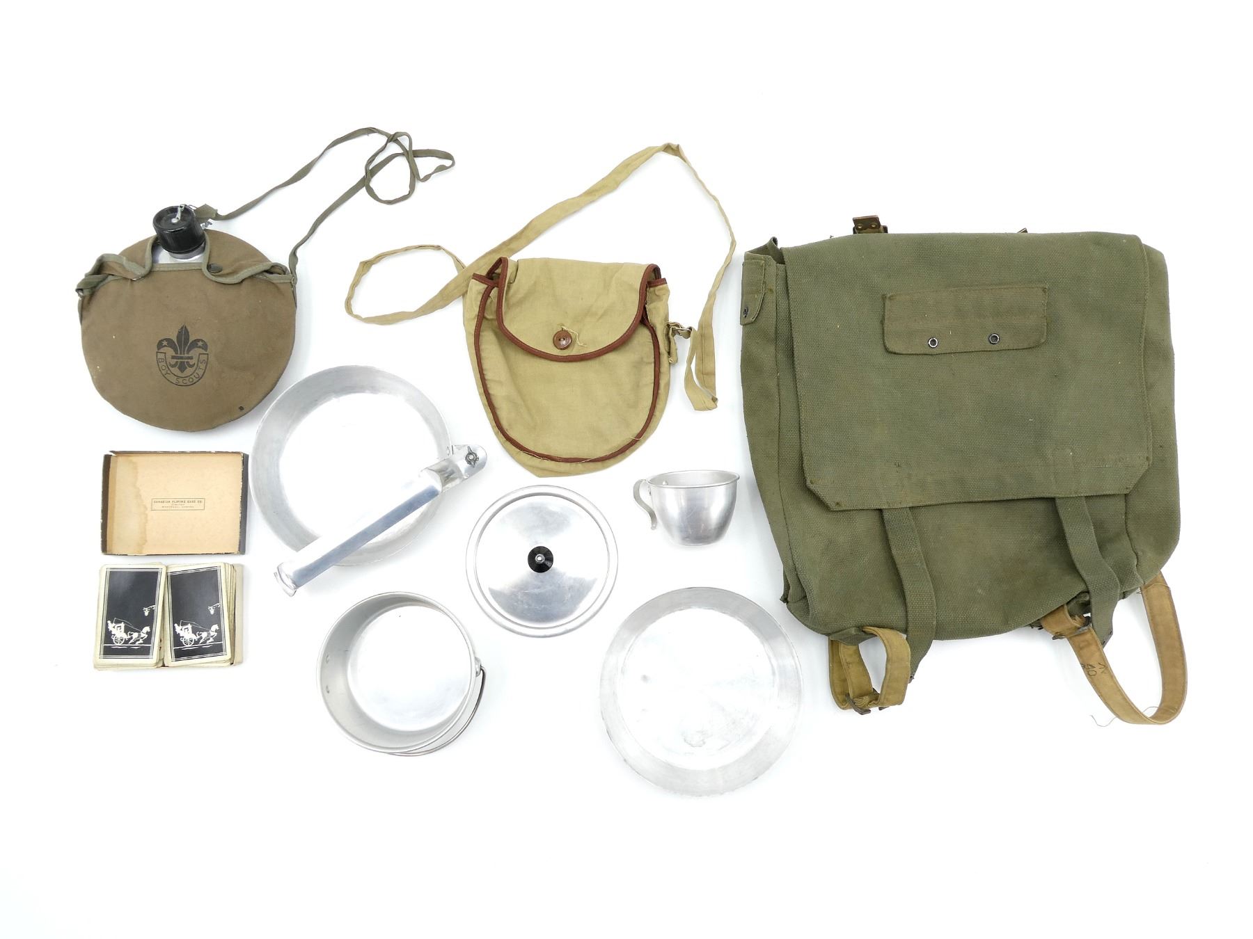 LOT INCLUDES; (1) CANADIAN / BRITISH GREEN CANVAS WEB FIELD PACK, MARKED: "SA5197, CDSM, DUNDAS RC", TAN CANVAS SHOULDER STRAPS, ONE MARKED: "D & M LTD. 41", BROAD ARROWS, "40", OTHER MARKED: "VC LTD, 1941", BROAD ARROW OVER "?5", SHOWS AGE / WEAR, (1) SET OF PLAYING CARDS, TWO DECKS WORTH, 108 CARDS (INCLUDING TWO JOKERS & TWO GAME INSTRUCTION CARDS), BOX LID MARKED: "TUDOR", SHIELD WITH ROSE, "PLAYING CARDS", INSIDE LID MARKED: "CANADIAN PLAYING CARD CO., LIMITED, MONTREAL, CANADA", SHOWS AGE / WEAR, AGE UNKNOWN, (1) MILITARY STYLE MESS TIN SET, WITH BOWL, CUP, MINI POT WITH LID & BOWL WITH DETACHABLE HANDLE, BOWLS MARKED: "METALITE, MADE IN CANADA", NO VISIBLE MARKINGS ON OTHER PIECES, TIN / ALUMINUM CONSTRUCTION, WITH TAN / BROWN CLOTH CARRIER, NO VISIBLE MARKINGS & (1) BOY SCOUTS METAL CANTEEN WITH COVER, NO VISIBLE MARKINGS ON CANTEEN, COVER MARKED: "BOY SCOUTS". SEE PHOTOS.
