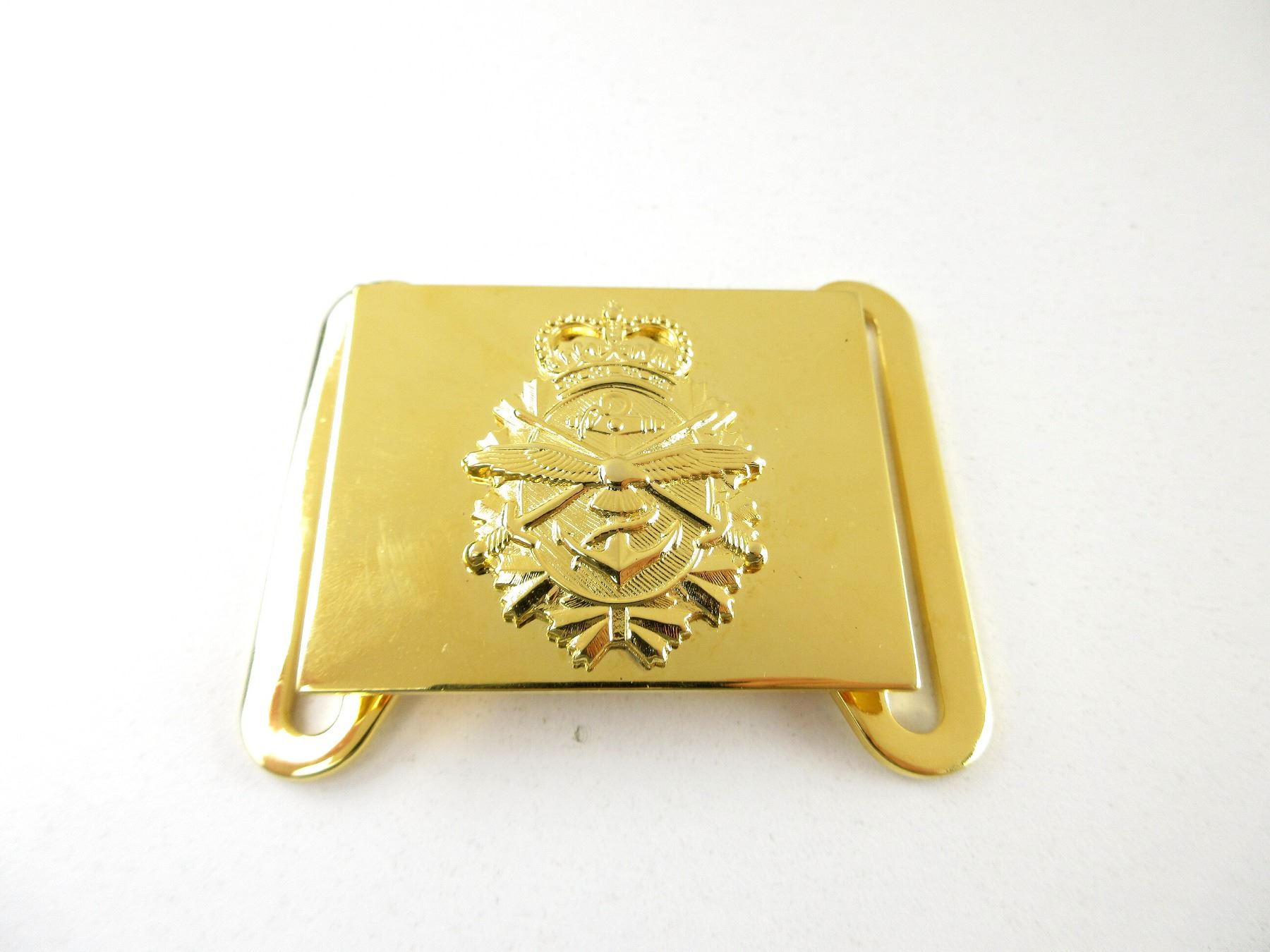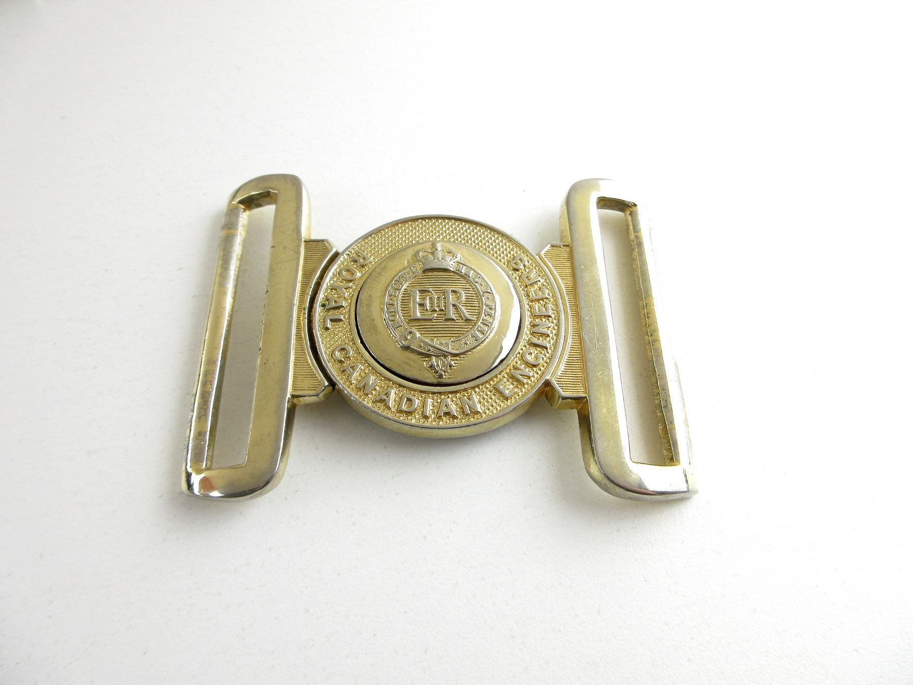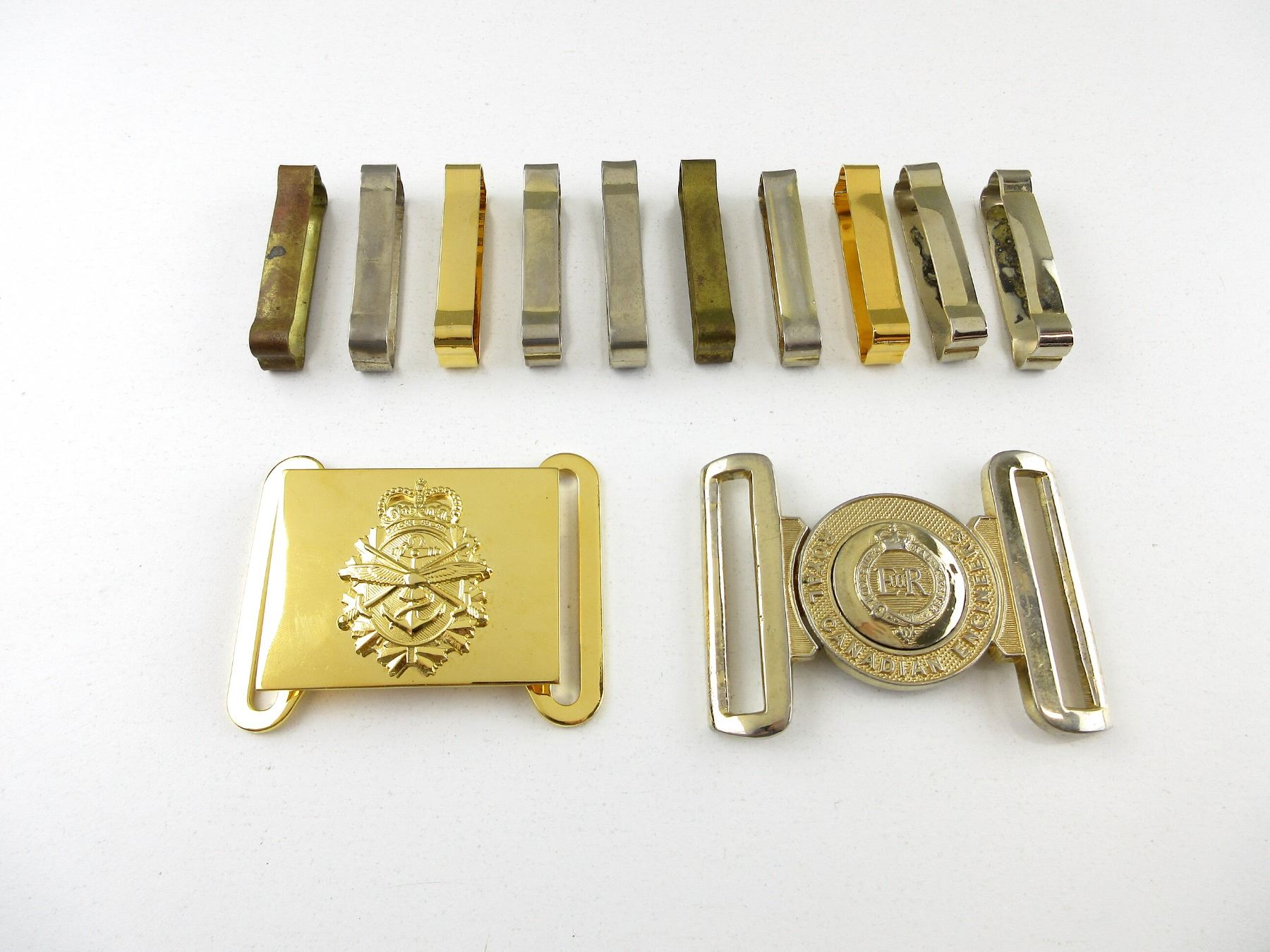 LOT INCLUDES; (1) ROYAL CANADIAN ENGINEERS BELT BUCKLE, MARKED: "ROYAL CANADIAN ENGINEERS" WITH QUEEN'S CROWN, (1) CANADIAN MILITARY TRI-SERVICE BELT BUCKLE, WITH TRI-SERVICE LOGO & QUEEN'S CROWN & (10) BELT FORCES / FITTINGS. SEE PHOTOS.