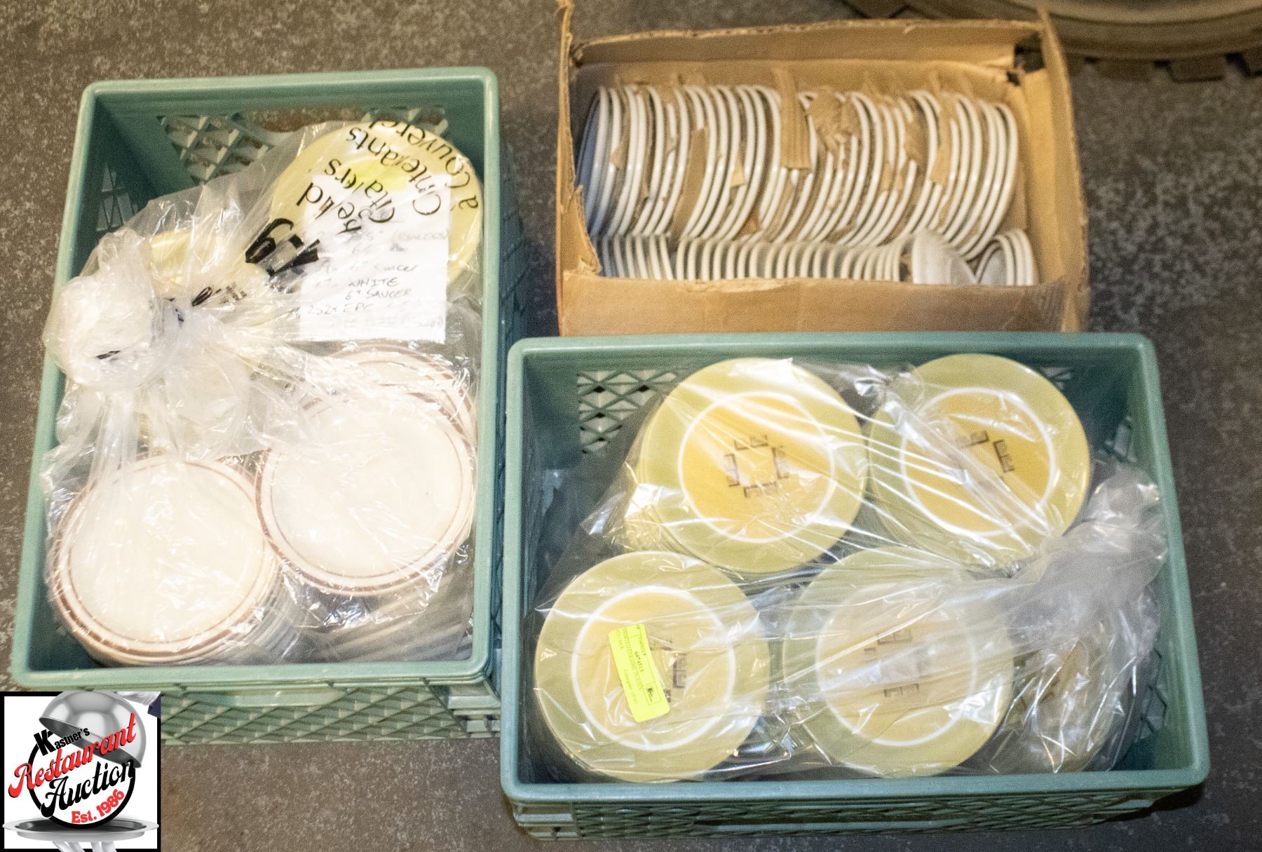 252 - 6.5" ROUND EDMONTON PETROLEUM CLUB ( YELLOW ), 22 - 6.5" RIMLESS ( SPECKLED ), 16 - 6.5" ROUND RIMMED ( SPECKLED ), 59 - 6" ROUND SAUCER ( SPECKLED ), 27 - 6" ROUND SAUCER ( WHITE )