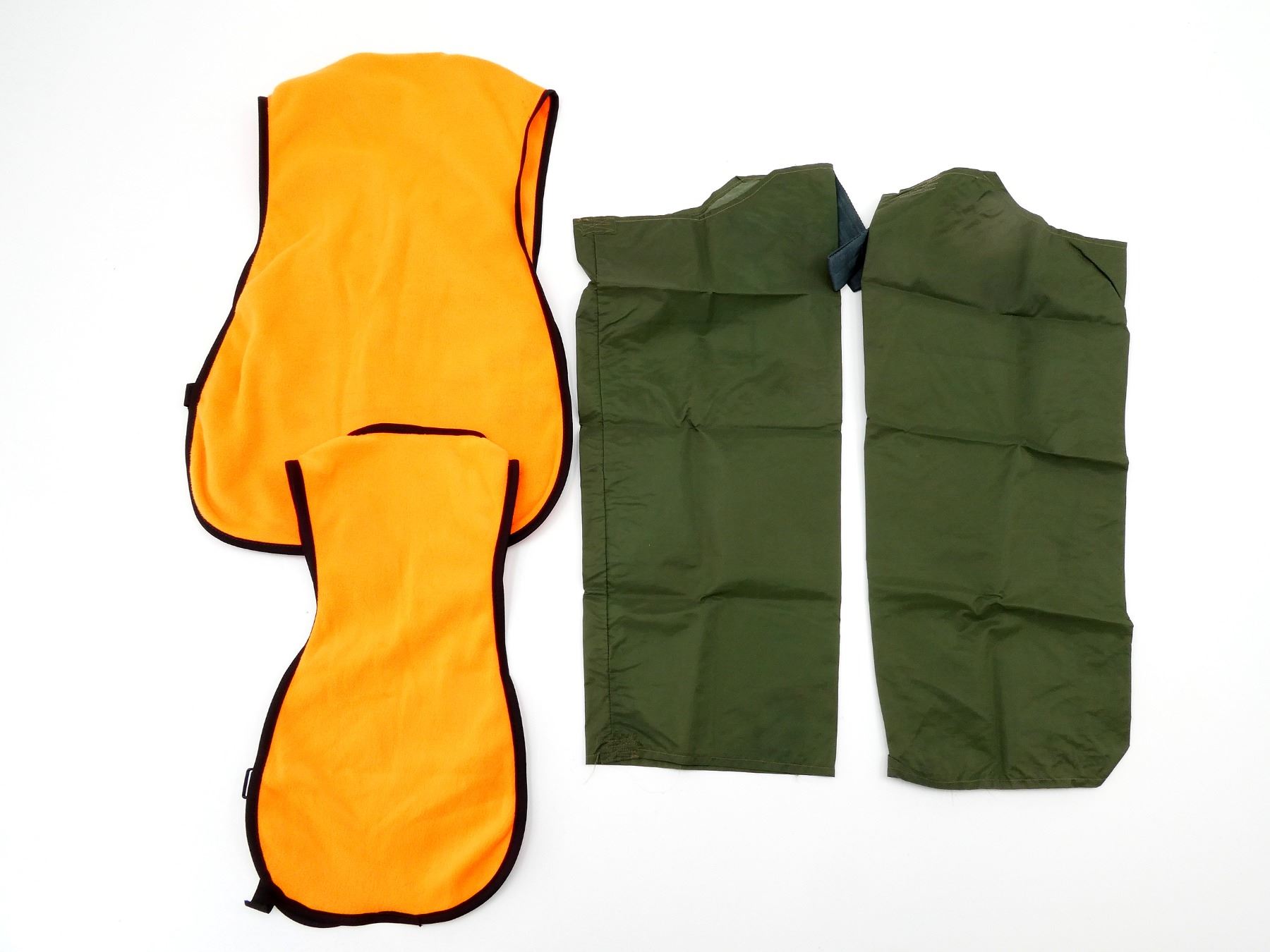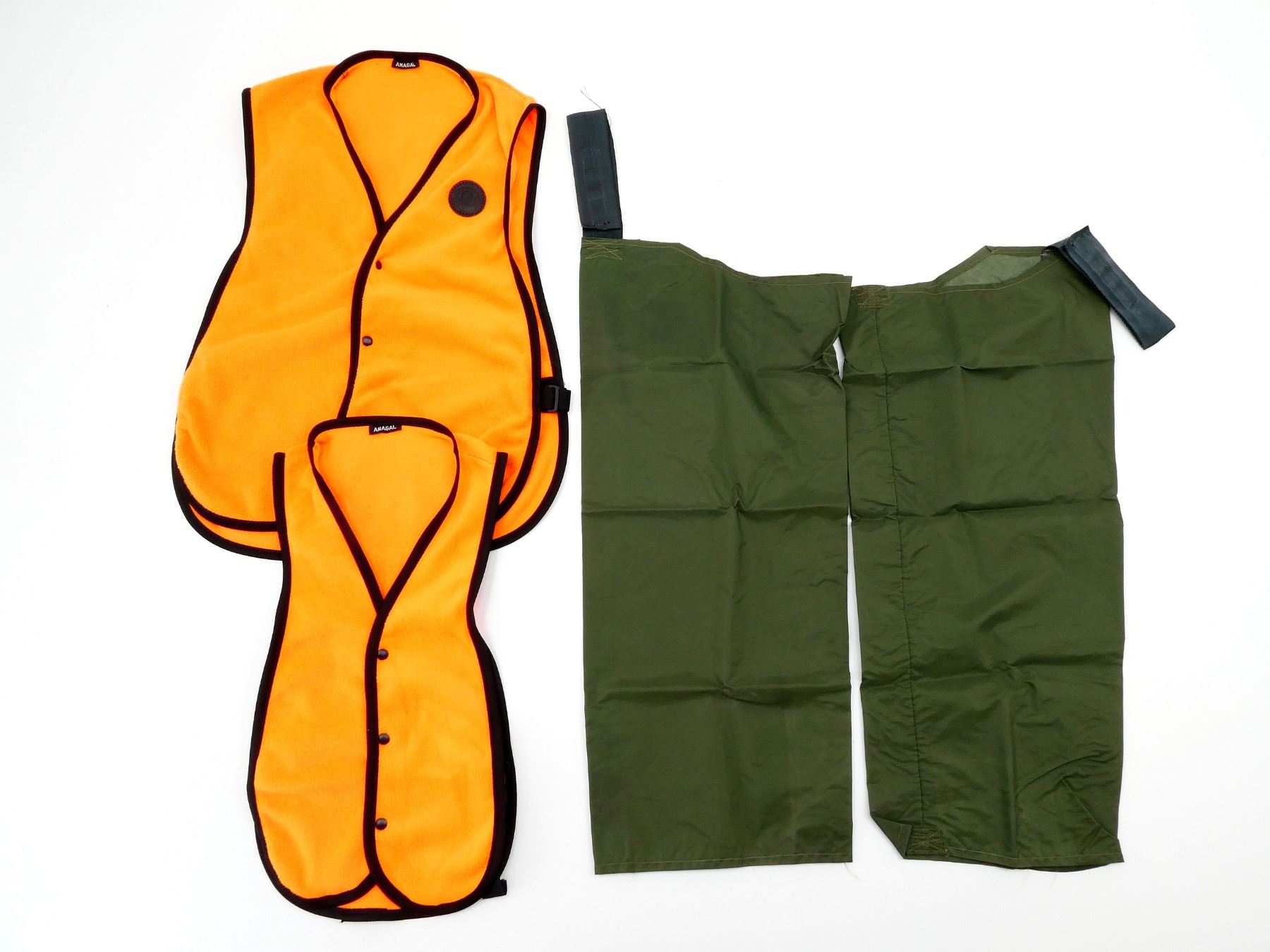 LOT INCLUDES; (2) ANAGAL ORANGE HUNTING SAFETY VESTS, SHOULDER LENGTHS APPROX. 16" AND 11" & (1) SET OF GREEN LEG PROTECTORS. SEE PHOTOS.