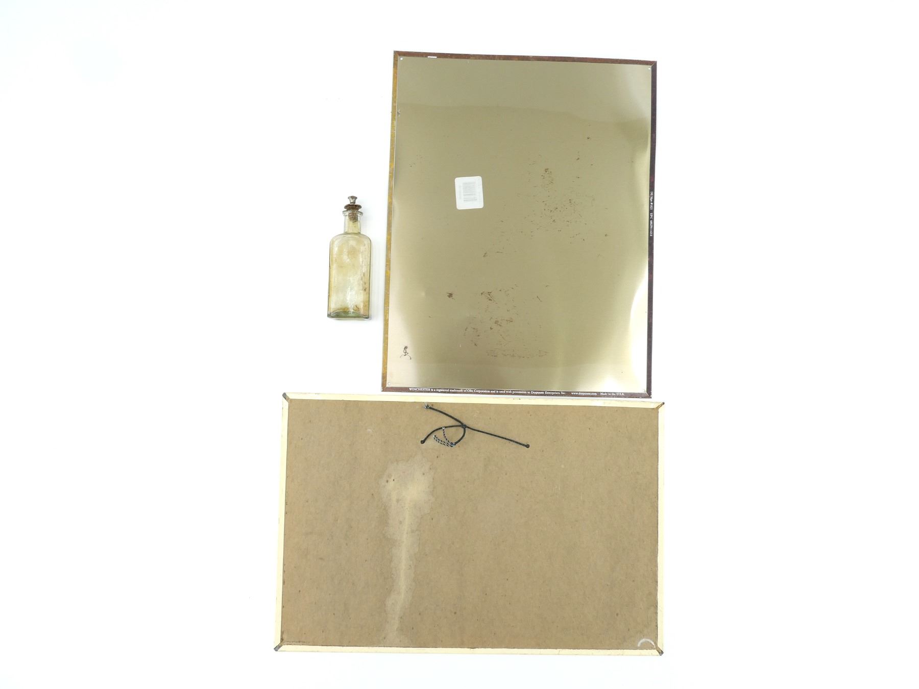LOT INCLUDES; (1) METAL "WINCHESTER" SIGN WITH HORSE & RIDER, APPROX. 16" X 12.5", (1) METAL "WINCHESTER - WESTERN BULLETS" SIGN, WITH VARIOUS BULLET CALIBERS, APPROX. 11 5/8" X 17 5/8" & (1) ANTIQUE GLASS WINCHESTER GUN OIL BOTTLE WITH CORK / METAL CAP, BOTTLE MARKED: "WINCHESTER", CAP MARKED: "W.F. YOUNG, SPRINGFIELD, MASS.", OAL APPROX. 5 5/8". SEE PHOTOS.