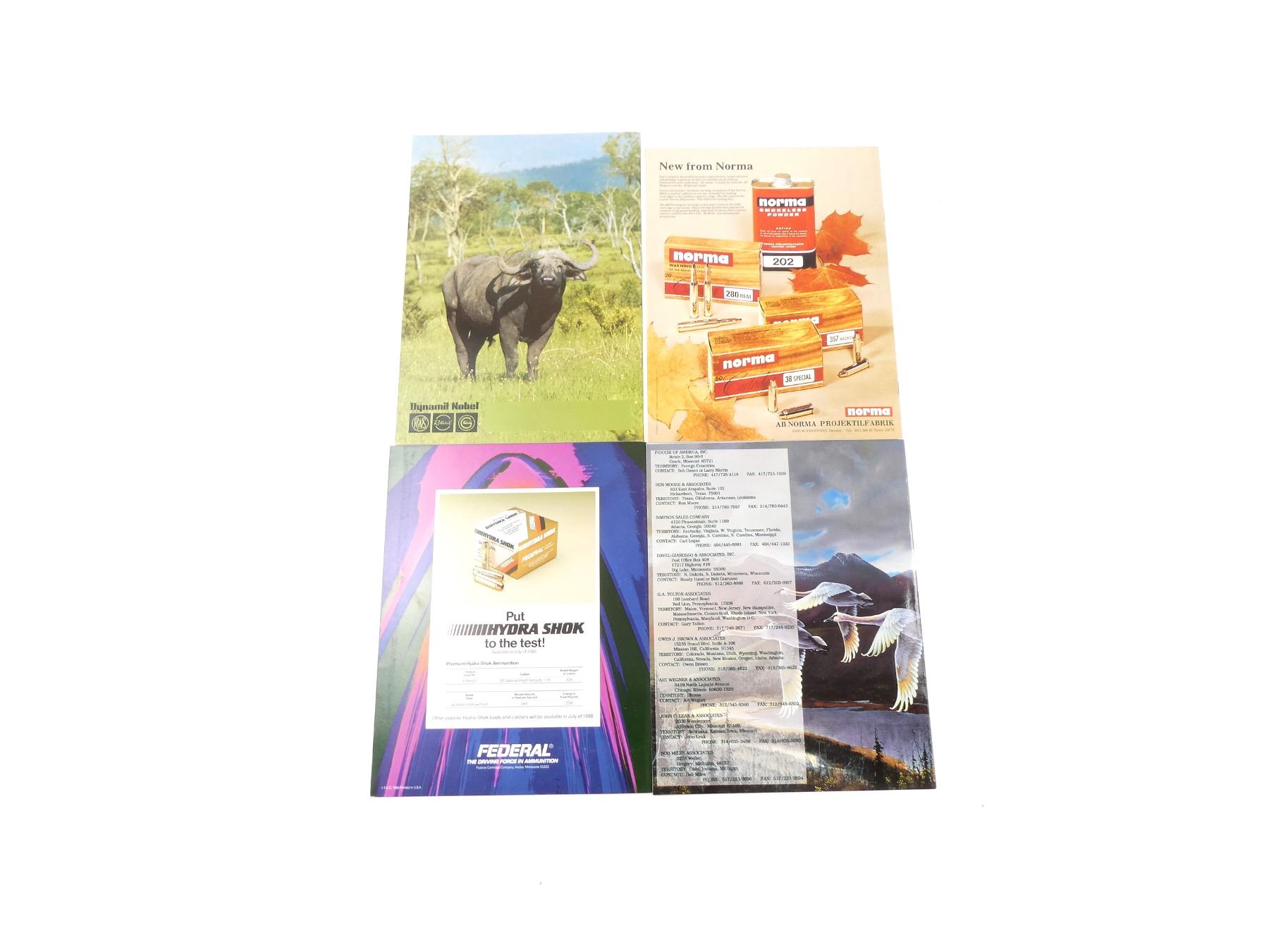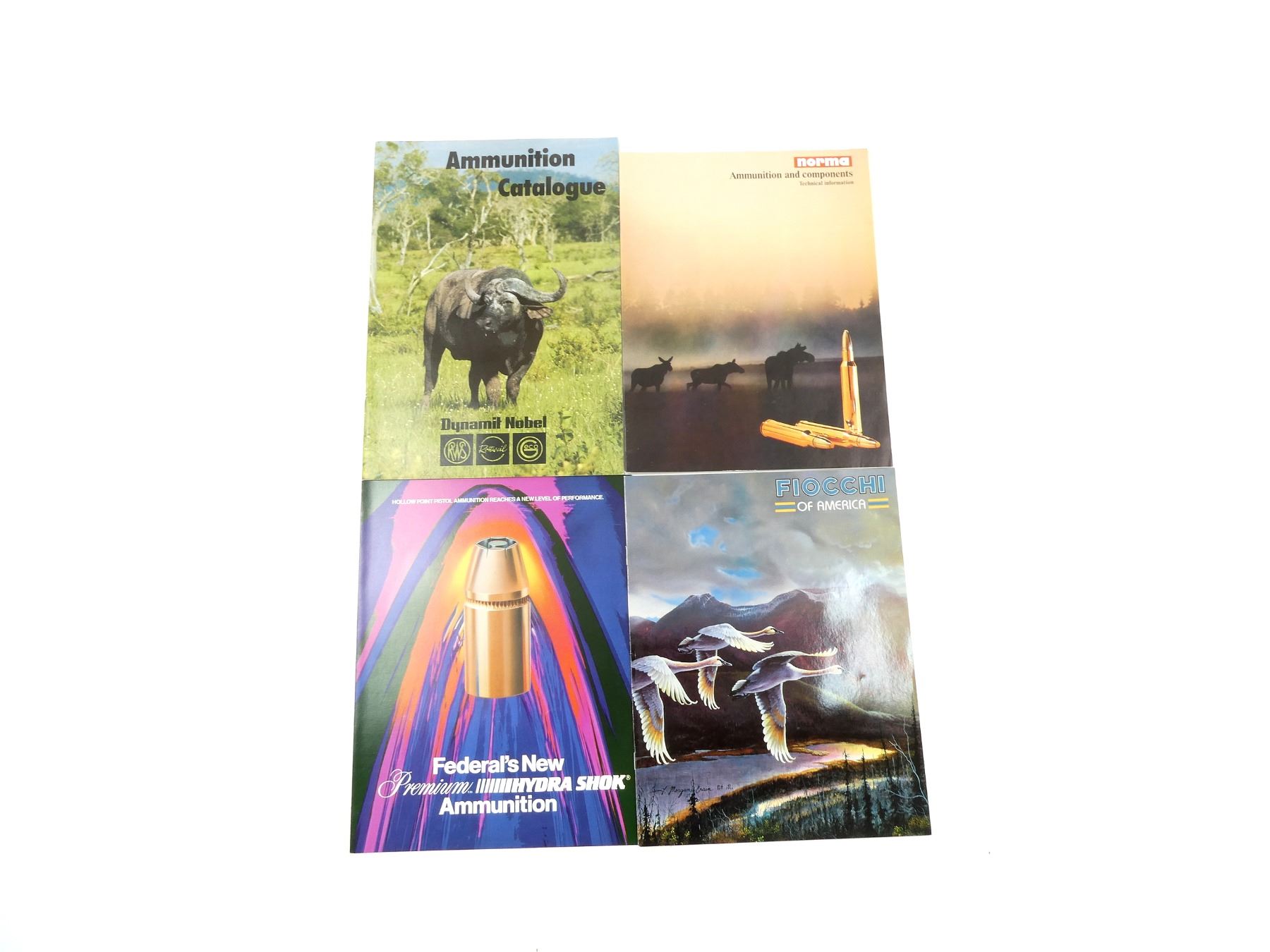 SOFT COVERS, LOT INCLUDES; (1) "FIOCCHI OF AMERICA" CATALOGUE, (1) "NORMA AMMUNITION AND COMPONENTS, TECHNICAL INFORMATION" CATALOGUE, (1) "FEDERAL'S NEW PREMIUM HYDRA SHOK AMMUNITION" CATALOGUE, COPYRIGHT 1988 & (1) "AMMUNITION CATALOGUE" CATALOGUE. SEE PHOTOS.