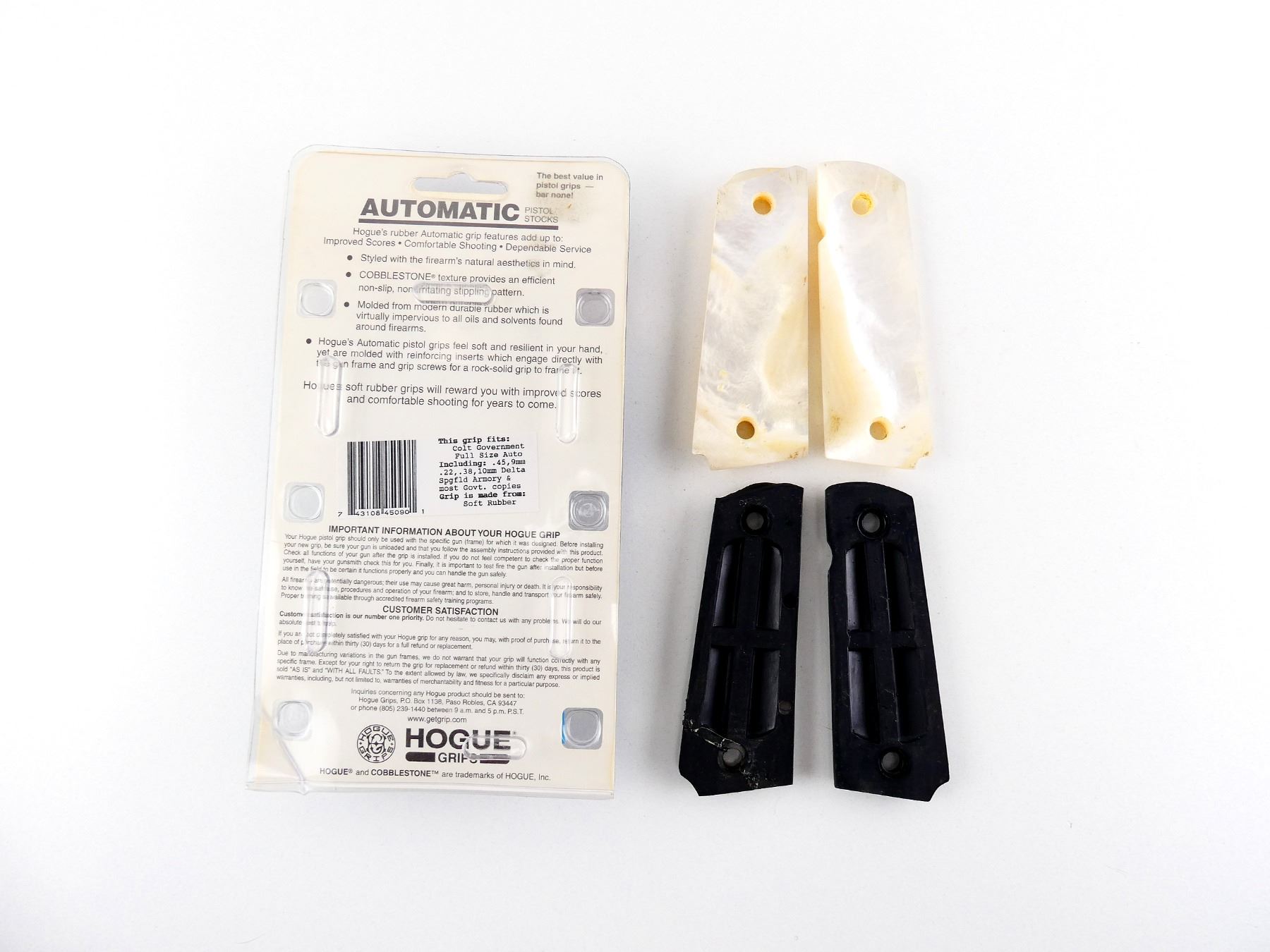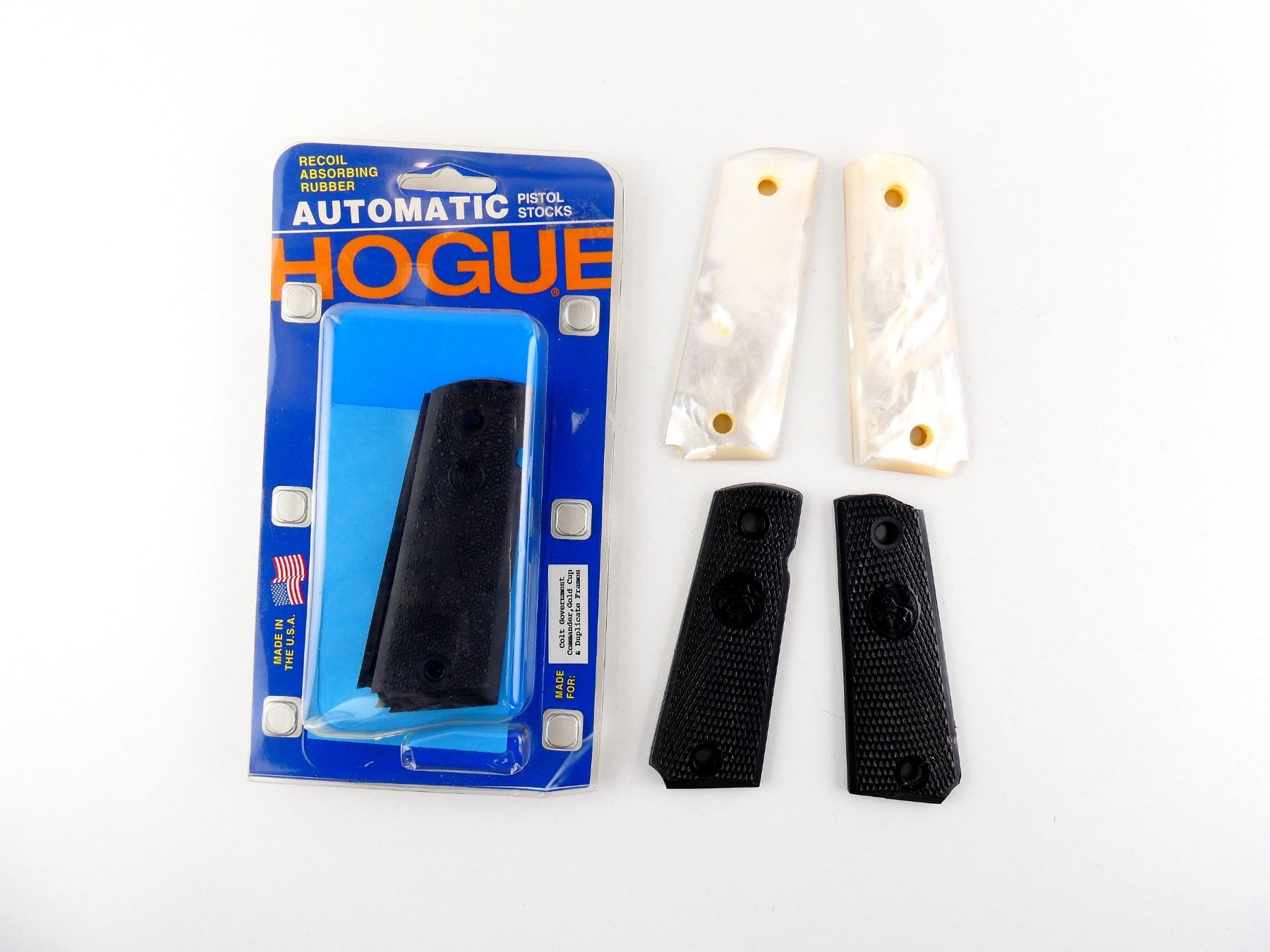 LOT INCLUDES; (1) SET MOTHER OF PEARL COLT 1911 GRIPS, NO SCREWS, (1) SET BLACK POLYMER COLT 1911 GRIPS, NO SCREWS & (1) SET HOGUE BLACK RUBBER COLT GOVERNMENT / COMMANDER / GOLD CUP GRIPS, APPEARS NEW OLD STOCK IN ORIGINAL PACKAGING. MAY REQUIRE FITTING. SEE PHOTOS.