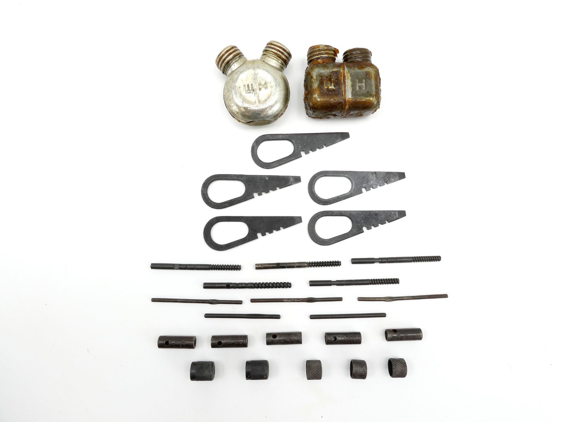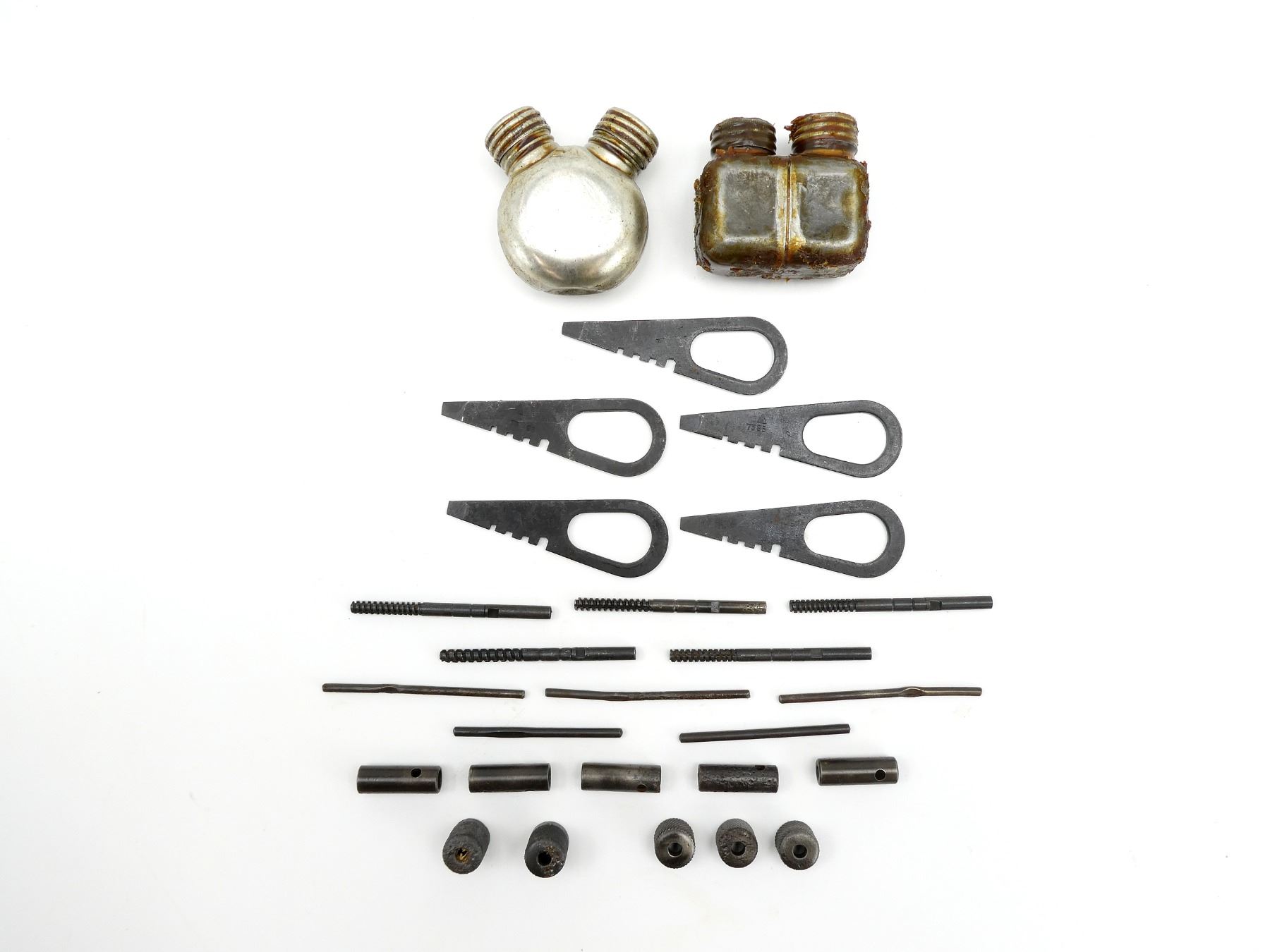 LOT INCLUDES; (2) METAL DOUBLE-SPOUTED OILERS, ONE SQUARE SHAPED, ONE CIRCULAR SHAPED, VARIOUS MARKINGS, (5) COMBO TOOLS, (5) WRENCHES, (5) GUIDES & (5) JAGS. SEE PHOTOS.