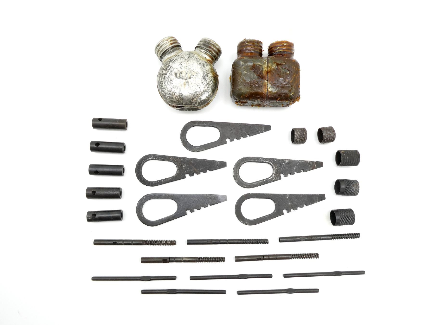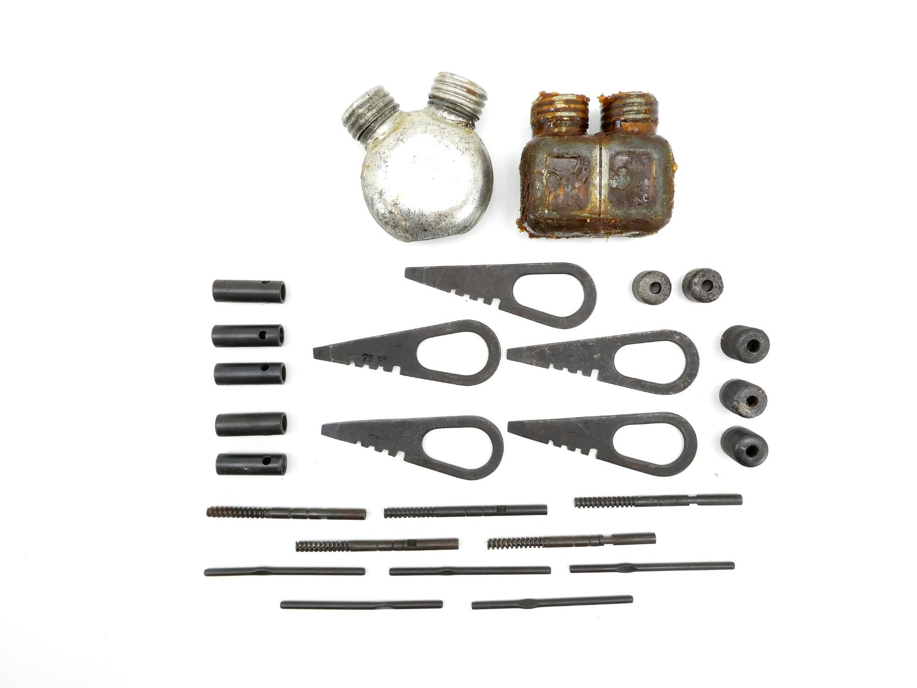 LOT INCLUDES; (2) METAL DOUBLE-SPOUTED OILERS, ONE SQUARE SHAPED, ONE CIRCULAR SHAPED, VARIOUS MARKINGS, (5) COMBO TOOLS, (5) WRENCHES, (5) GUIDES & (5) JAGS. SEE PHOTOS.