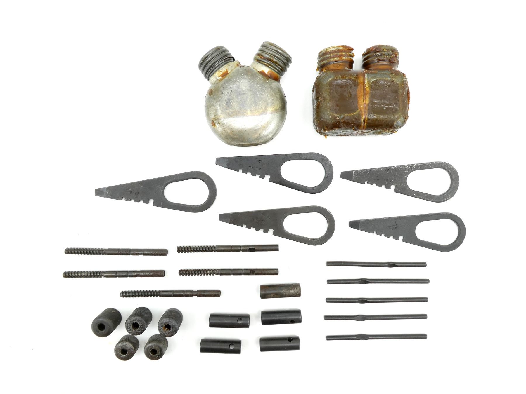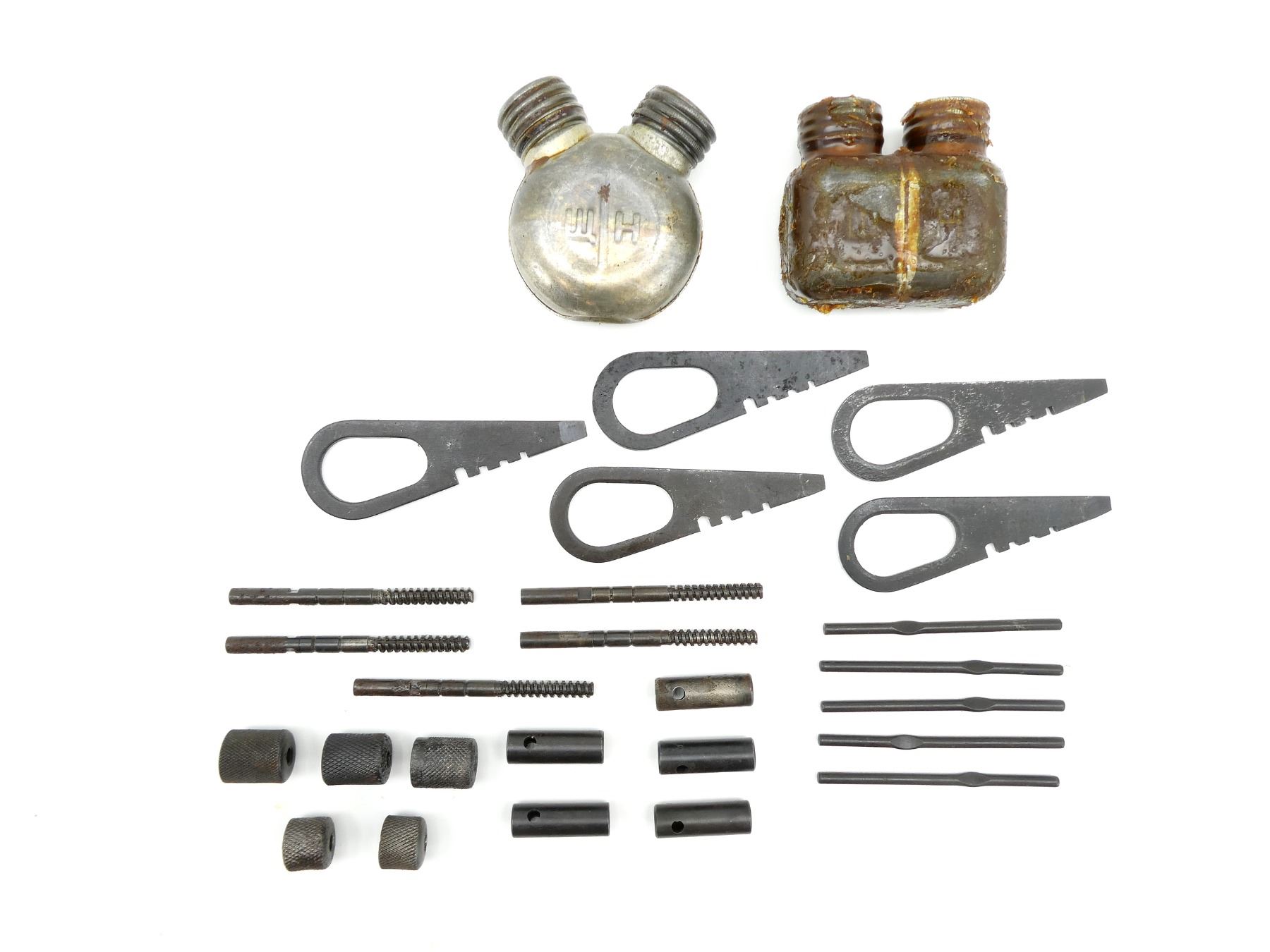 LOT INCLUDES; (2) METAL DOUBLE-SPOUTED OILERS, ONE SQUARE SHAPED, ONE CIRCULAR SHAPED, VARIOUS MARKINGS, (5) COMBO TOOLS, (5) WRENCHES, (5) GUIDES & (5) JAGS. SEE PHOTOS.