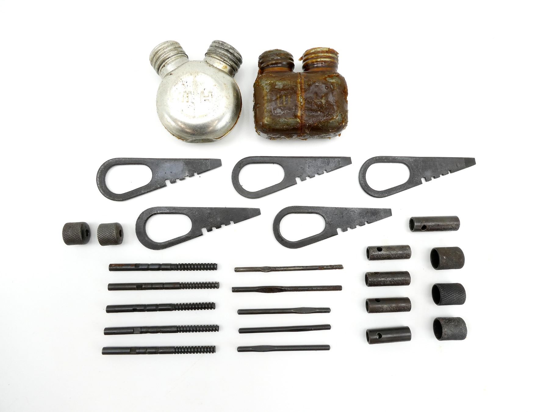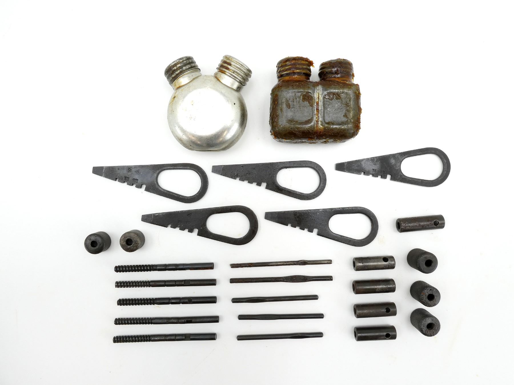 LOT INCLUDES; (2) METAL DOUBLE-SPOUTED OILERS, ONE SQUARE SHAPED, ONE CIRCULAR SHAPED, VARIOUS MARKINGS, (5) COMBO TOOLS, (5) WRENCHES, (5) GUIDES & (5) JAGS. SEE PHOTOS.