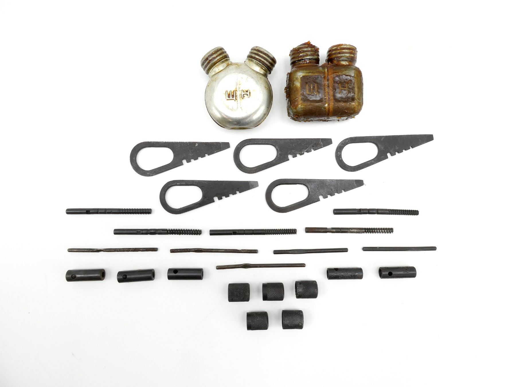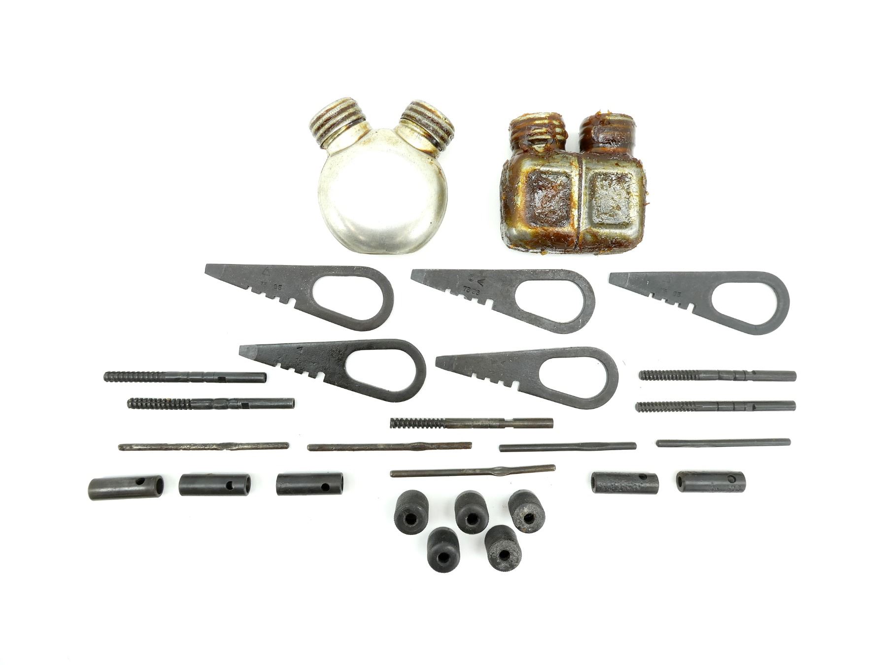 LOT INCLUDES; (2) METAL DOUBLE-SPOUTED OILERS, ONE SQUARE SHAPED, ONE CIRCULAR SHAPED, VARIOUS MARKINGS, (5) COMBO TOOLS, (5) WRENCHES, (5) GUIDES & (5) JAGS. SEE PHOTOS.