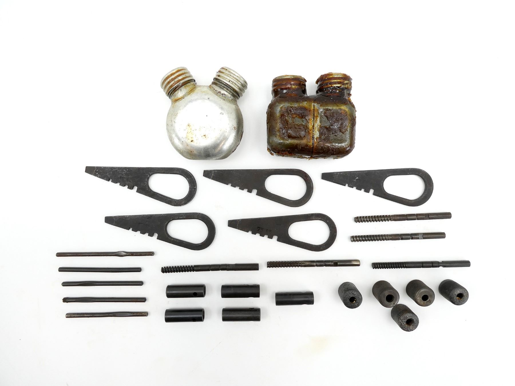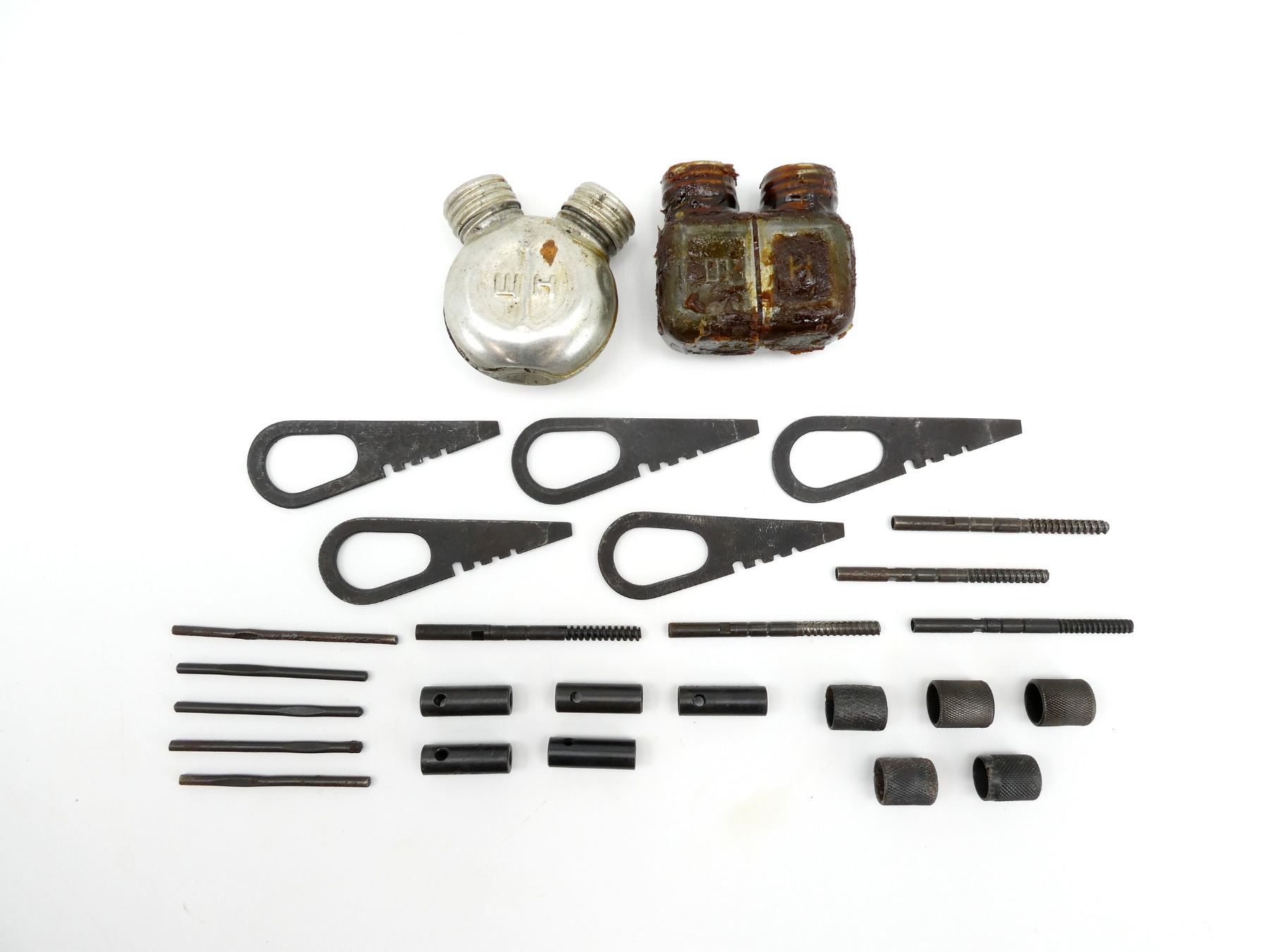 LOT INCLUDES; (2) METAL DOUBLE-SPOUTED OILERS, ONE SQUARE SHAPED, ONE CIRCULAR SHAPED, VARIOUS MARKINGS, (5) COMBO TOOLS, (5) WRENCHES, (5) GUIDES & (5) JAGS. SEE PHOTOS.