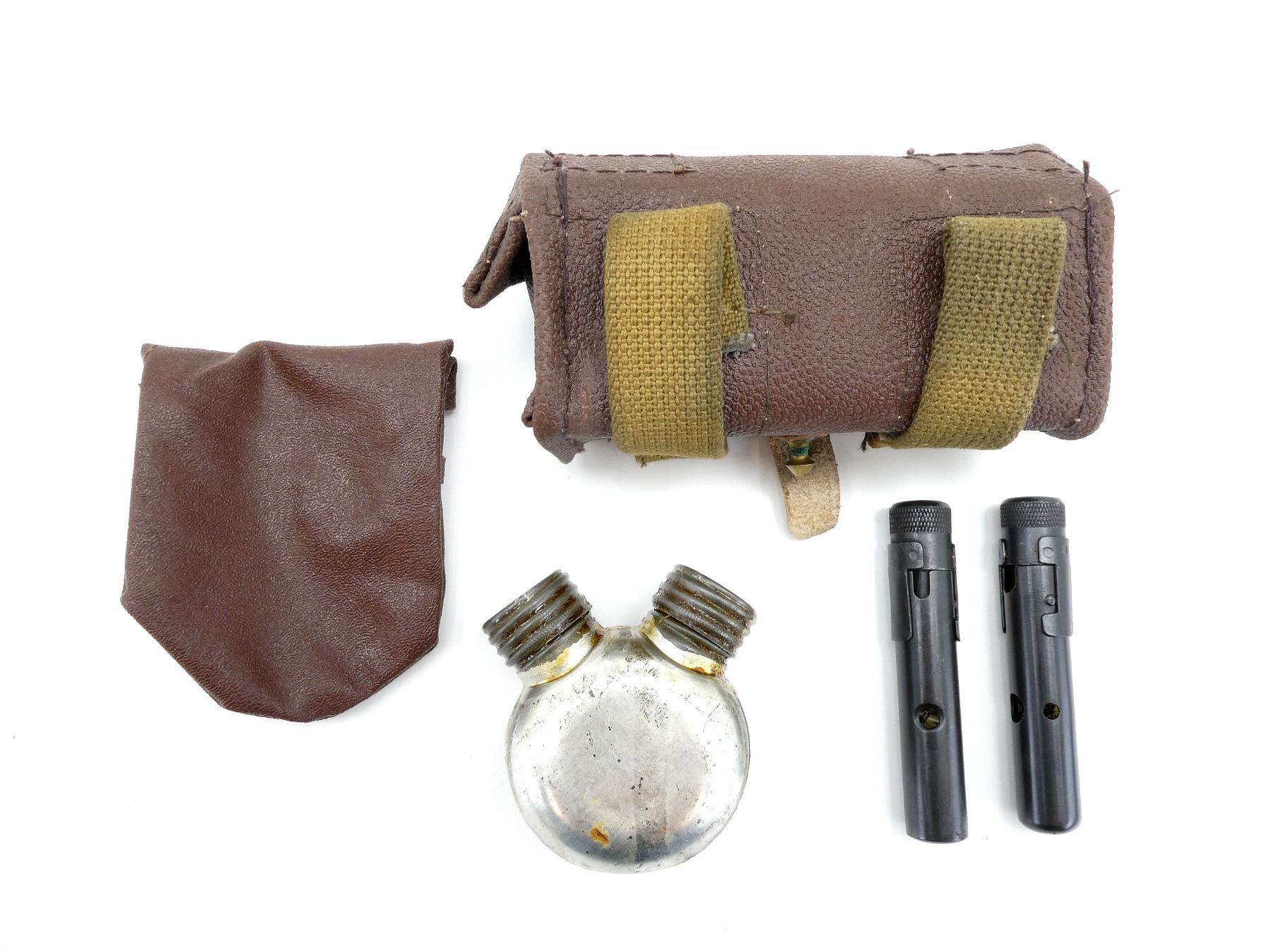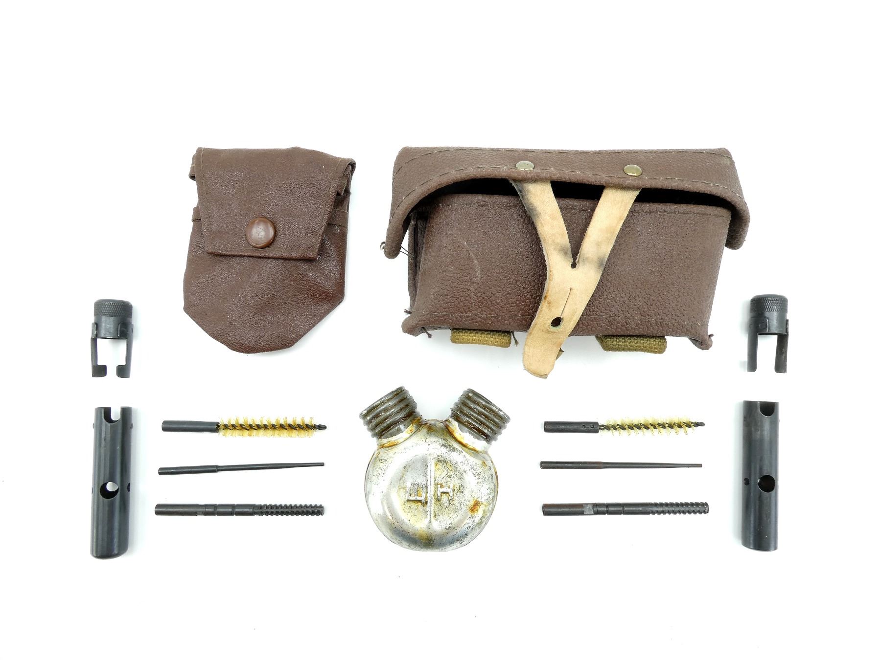 LOT INCLUDES; (1) SKS BROWN LEATHER AMMO POUCHES, NO VISIBLE MARKINGS, TWO CANVAS BELT LOOPS, BRASS / METAL FITTINGS, (1) STEEL DOUBLE-SPOUTED OILER, VARIOUS MARKINGS, (1) BROWN LEATHER OILER POUCH, NO VISIBLE MARKINGS & (2) SKS CLEANING KITS WITH BRUSH, PIN PUNCH & JAG. SEE PHOTOS.