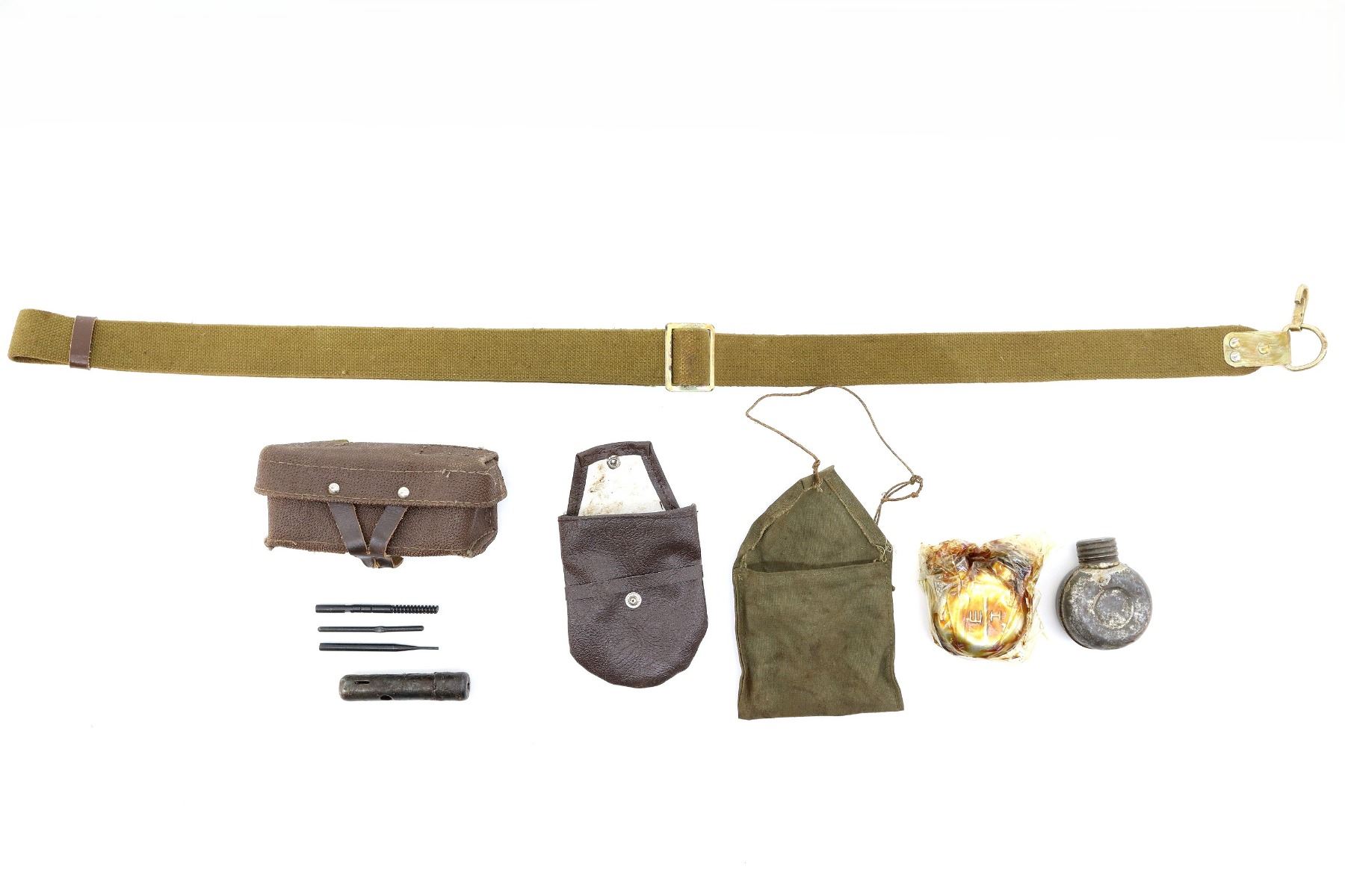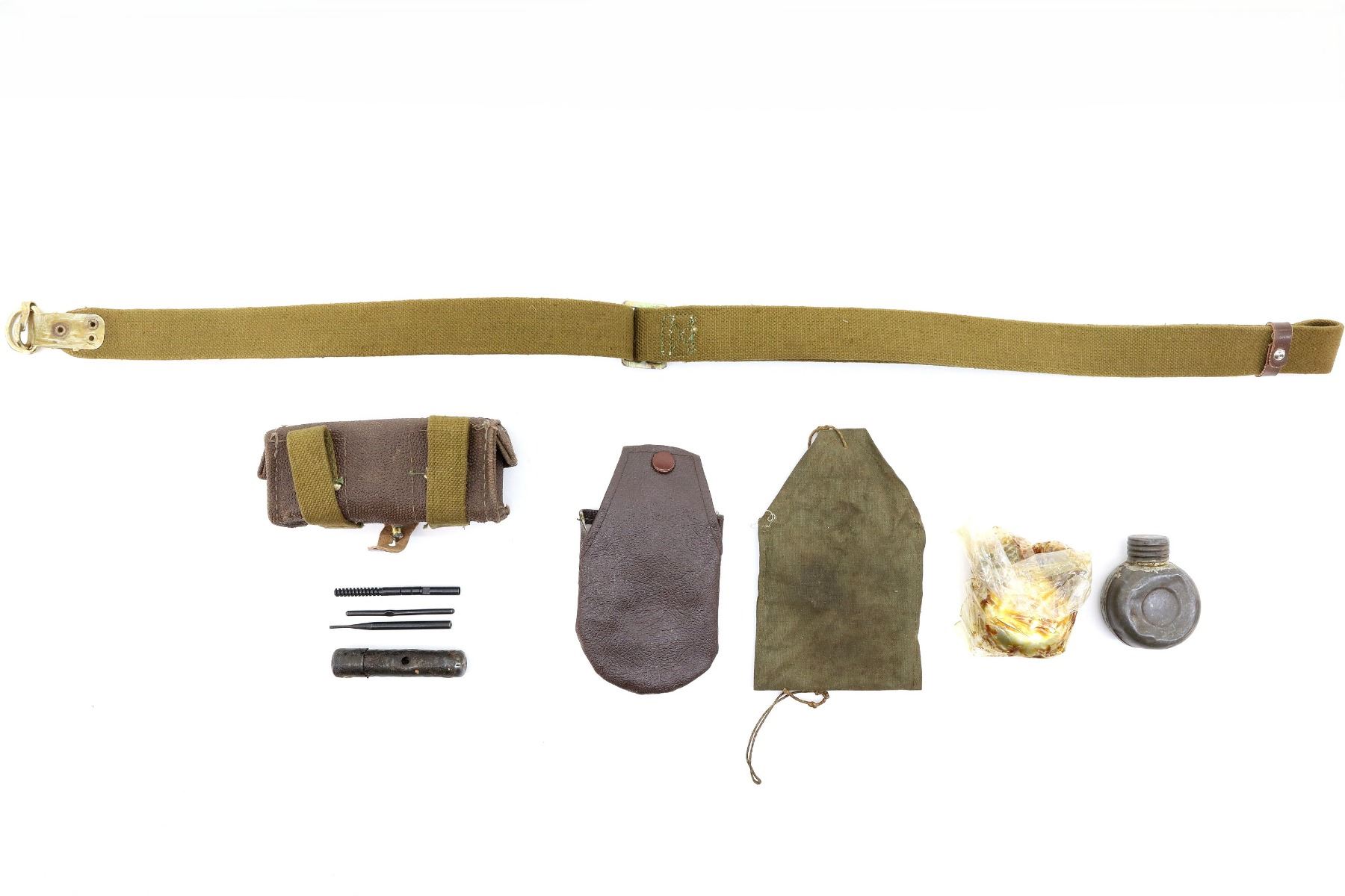 LOT INCLUDES; (1) BROWN LEATHER AMMO POUCH, NO VISIBLE MARKINGS, TWO CANVAS BELT LOOPS, BRASS / METAL FITTINGS, (1) TAN CANVAS SKS SLING, VARIOUS MARKINGS, METAL FITTINGS, OAL APPROX. 37", ADJUSTABLE, (2) METAL OILERS, ONE SINGLE SPOUTED, ONE DOUBLE SPOUTED, VARIOUS MARKINGS, (2) OILER POUCHES, ONE GREEN CANVAS, ONE BROWN LEATHER, NO VISIBLE MARKINGS, (1) SKS CLEANING KIT WITH BRUSH, PIN PUNCH, JAG, ETC. SEE PHOTOS.