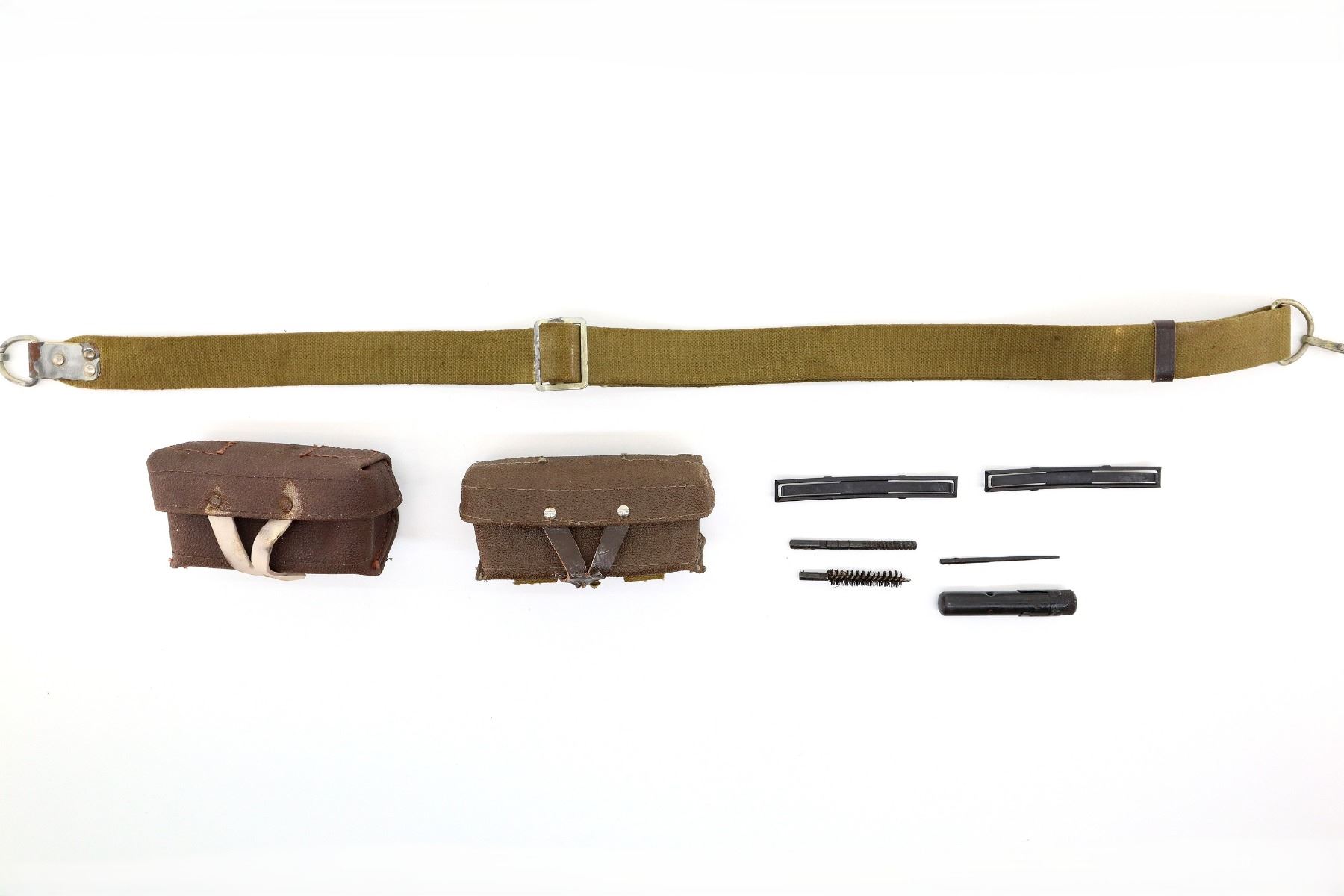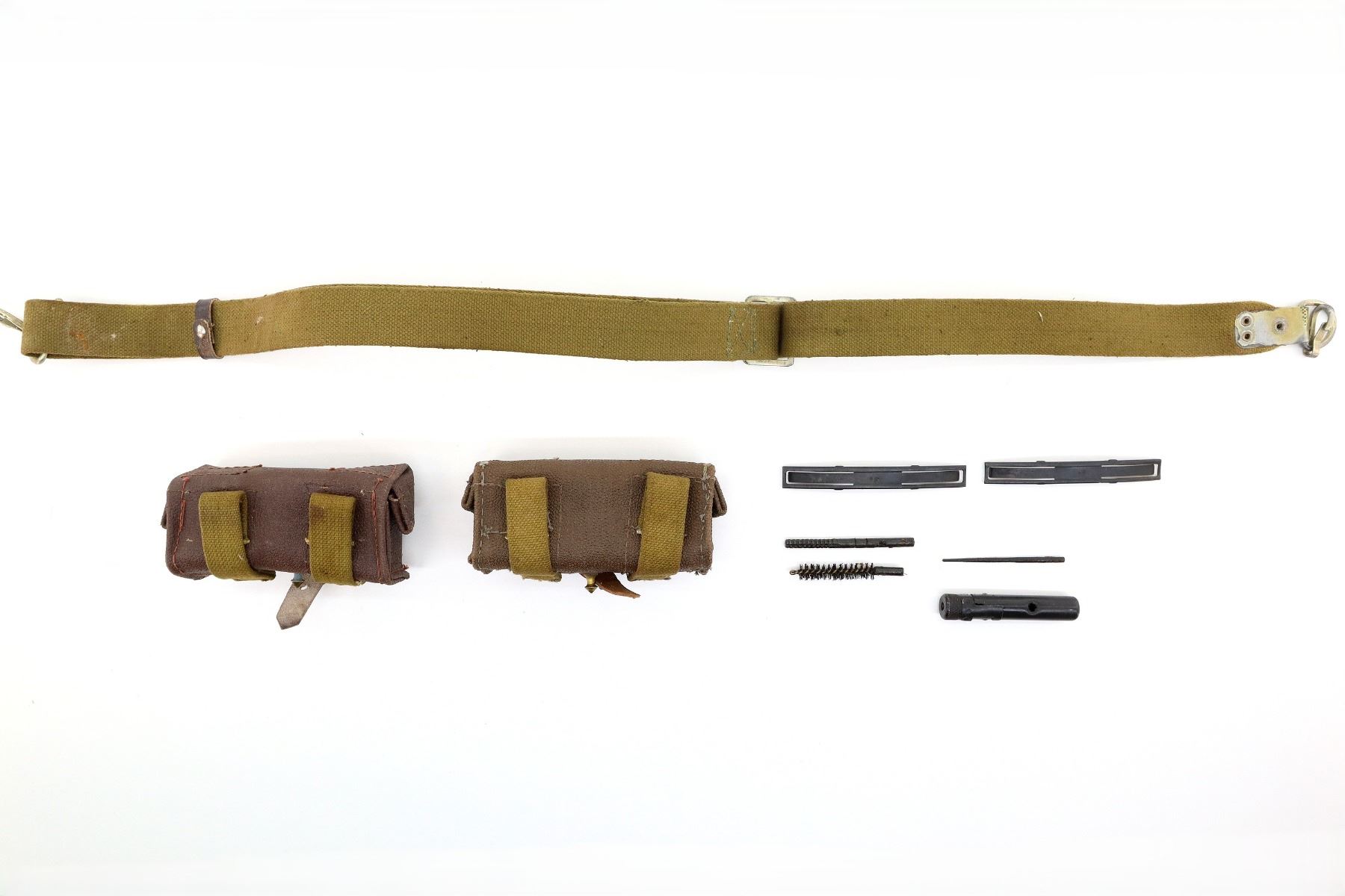LOT INCLUDES; (2) BROWN LEATHER AMMO POUCHES, NO VISIBLE MARKINGS, TWO CANVAS BELT LOOPS, BRASS / METAL FITTINGS, (2) SKS BLACK PAINTED STEEL 7.62X39MM 10-RND STRIPPER CLIPS, VARIOUS MARKINGS, (1) TAN CANVAS SKS SLING, VARIOUS MARKINGS, METAL FITTINGS, OAL APPROX. 36", ADJUSTABLE & (1) SKS CLEANING KIT WITH BRUSH, PIN PUNCH & JAG. SEE PHOTOS.