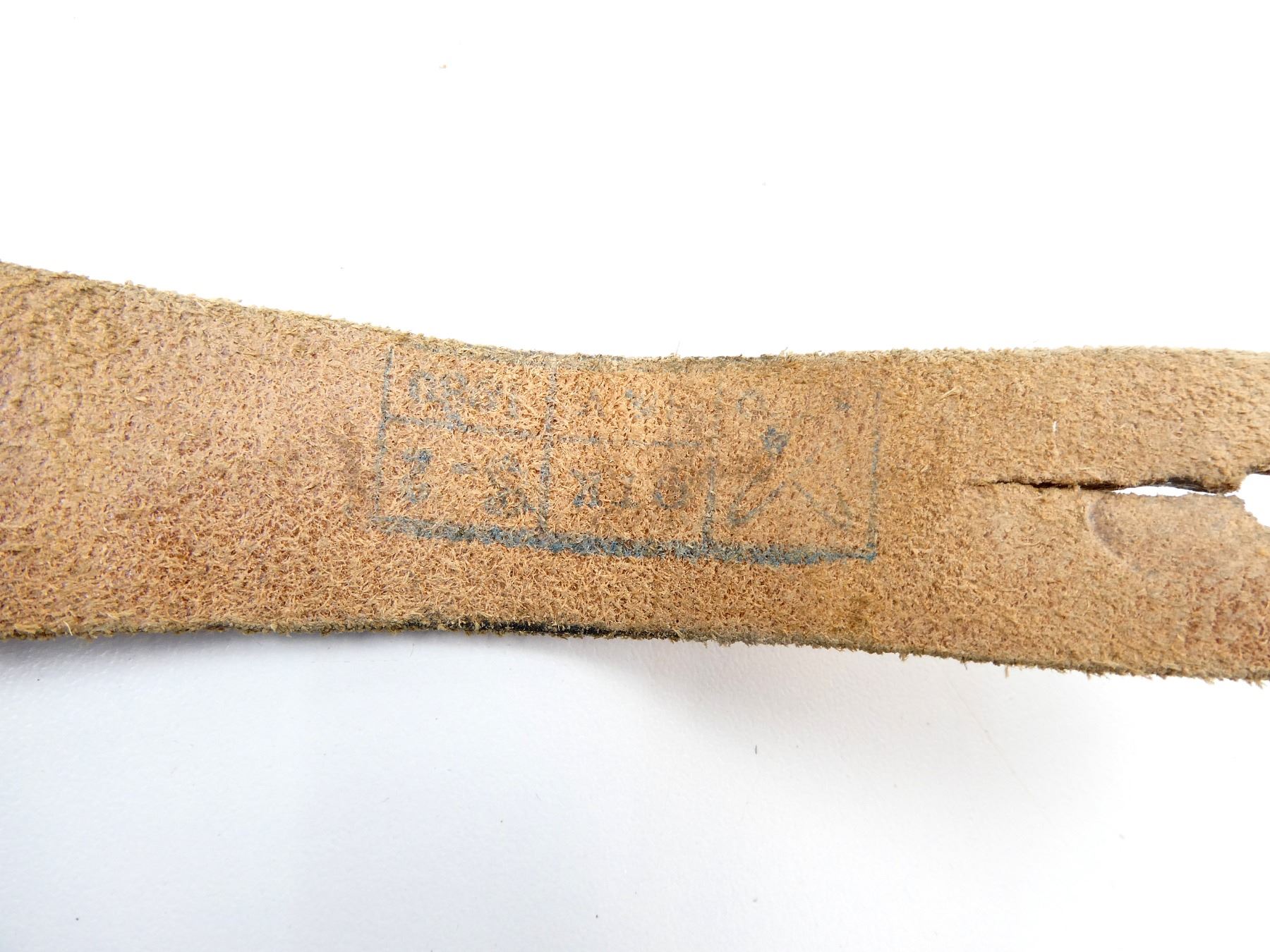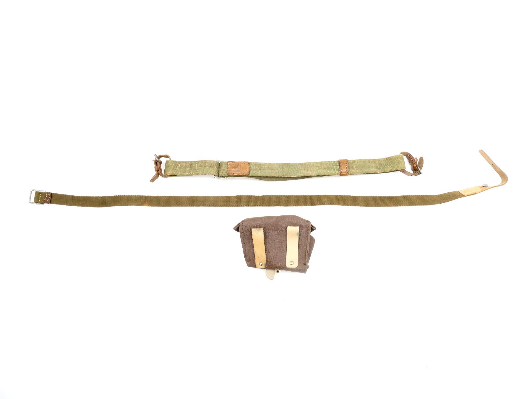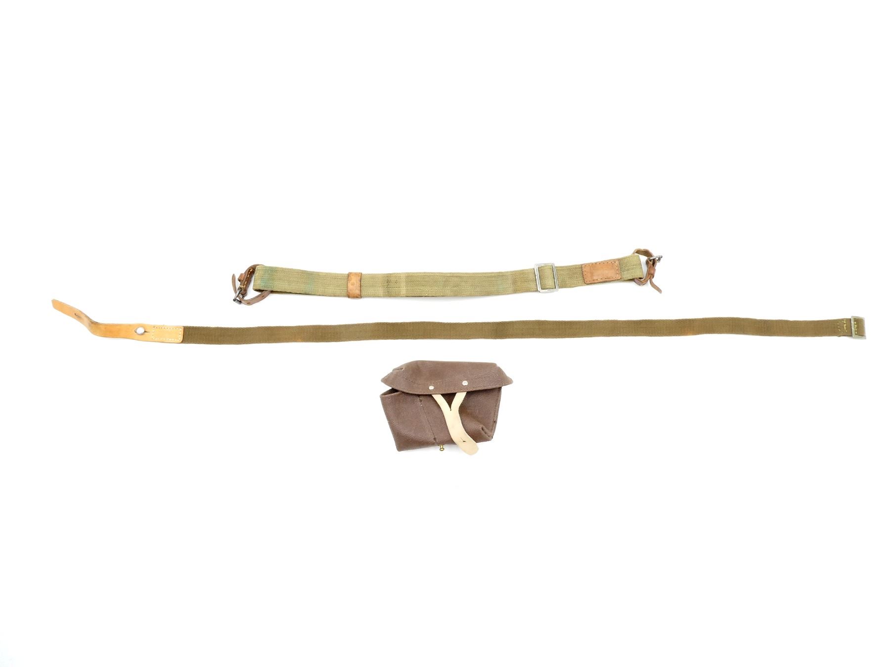 LOT INCLUDES; (1) MOSIN NAGANT RIFLE SLING, GREEN CANVAS & LEATHER, METAL FITTINGS, NO VISIBLE MARKINGS, OAL APPROX. 23.5", ADJUSTABLE, (1) GREEN CANVAS & LEATHER SLING, VARIOUS FAINT / UN-CLEAR MARKINGS ON LEATHER STRAP, METAL FITTINGS, OAL APPROX. 50" & (1) BROWN LEATHER TOKAREV AMMO POUCH, VARIOUS MARKINGS, TWO BELT LOOPS. SEE PHOTOS.