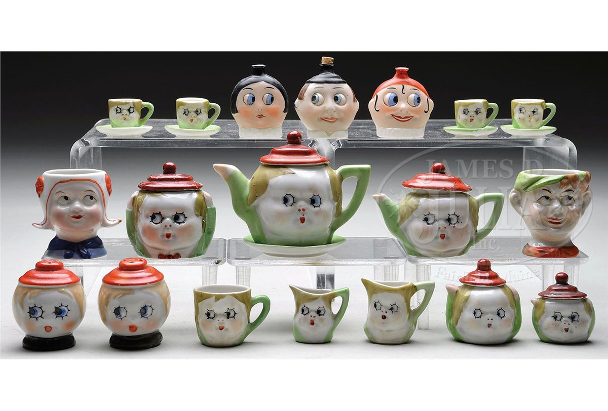 Amongst the items are a miniature German porcelain tea set with Googly-like faces and a partial set of similar figures from a slightly large set. Also found are two open topped head figures, possibly egg cups or toothpick holders, three Googly eyed heads with bottle stoppers, and a Japanese porcelain Googly eyed shaker set. SIZE: Tallest 2-1/2" (6.5 cm). Smallest 1" (2.5 cm). CONDITION: Items are good to very good. 1-13289