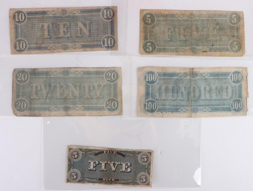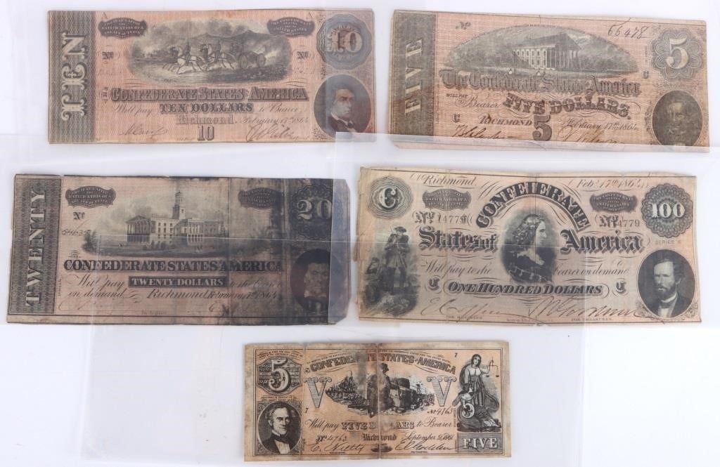 Assorted Confederate States of America banknotes 1861-1864 to include one 1864 $100, $20, $10, and $5 Richmond, VA banknote, and one 1861 Richmond, VA $5 banknote.