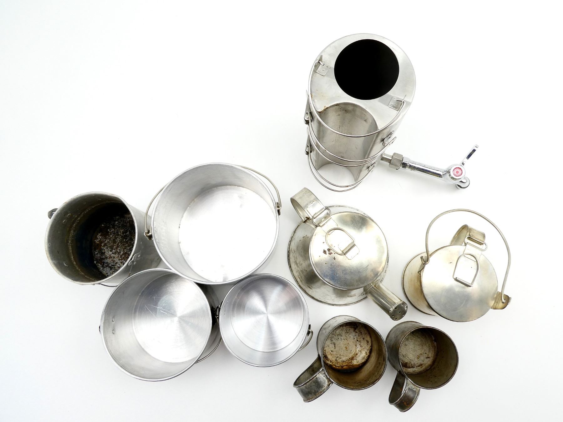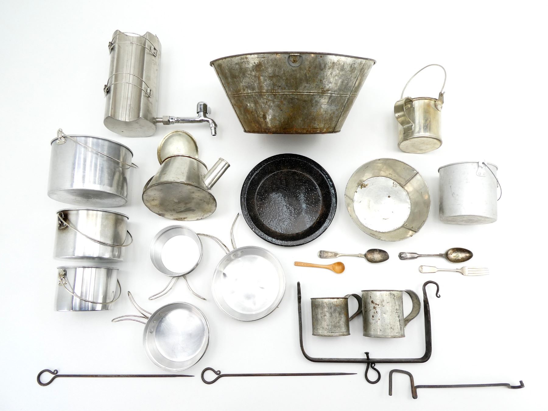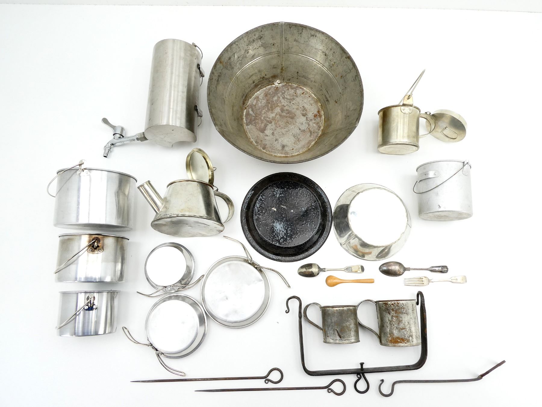 LOT INCLUDES; (1) STEEL MIXING BOWL, (1) ALUMINUM POT WITH HANDLE, (1) STEEL BOWL, (1) STEEL KETTLE, (2) STEEL MUGS, (1) STEEL POT WITH HANDLE, (1) ALUMINUM WATER DISPENSER, (1) STEEL PLATE, (3) ALUMINUM BOWLS WITH HANDLES AND LIDS, (2) ALUMINUM SPOONS, (1) ALUMINUM FORK, (1) WOODEN SPOON & (1) BARBECUE/GRILL ATTACHMENT WITH STOKING UTENSILS, APPEARS INCOMPLETE. SEE PHOTOS.