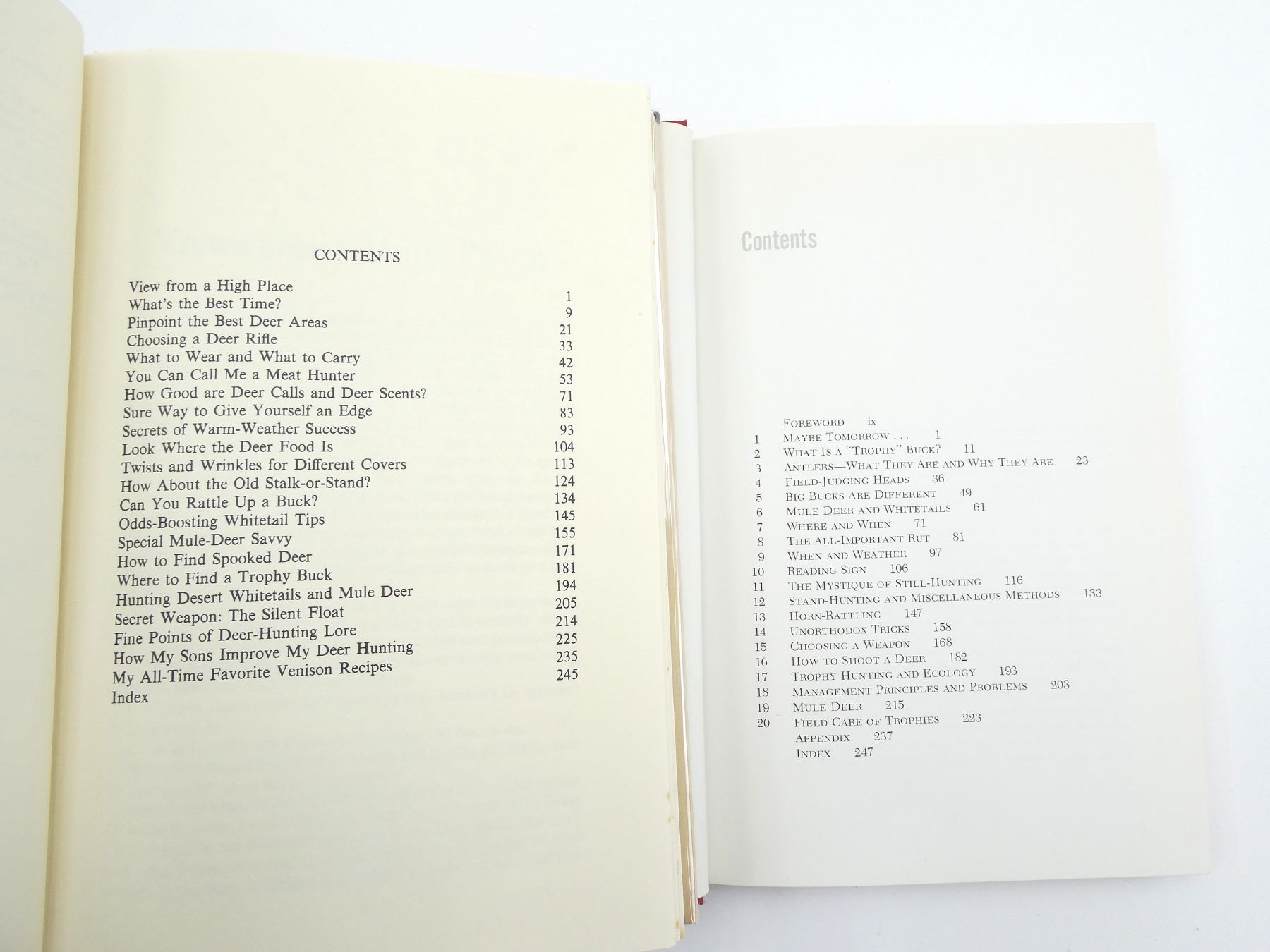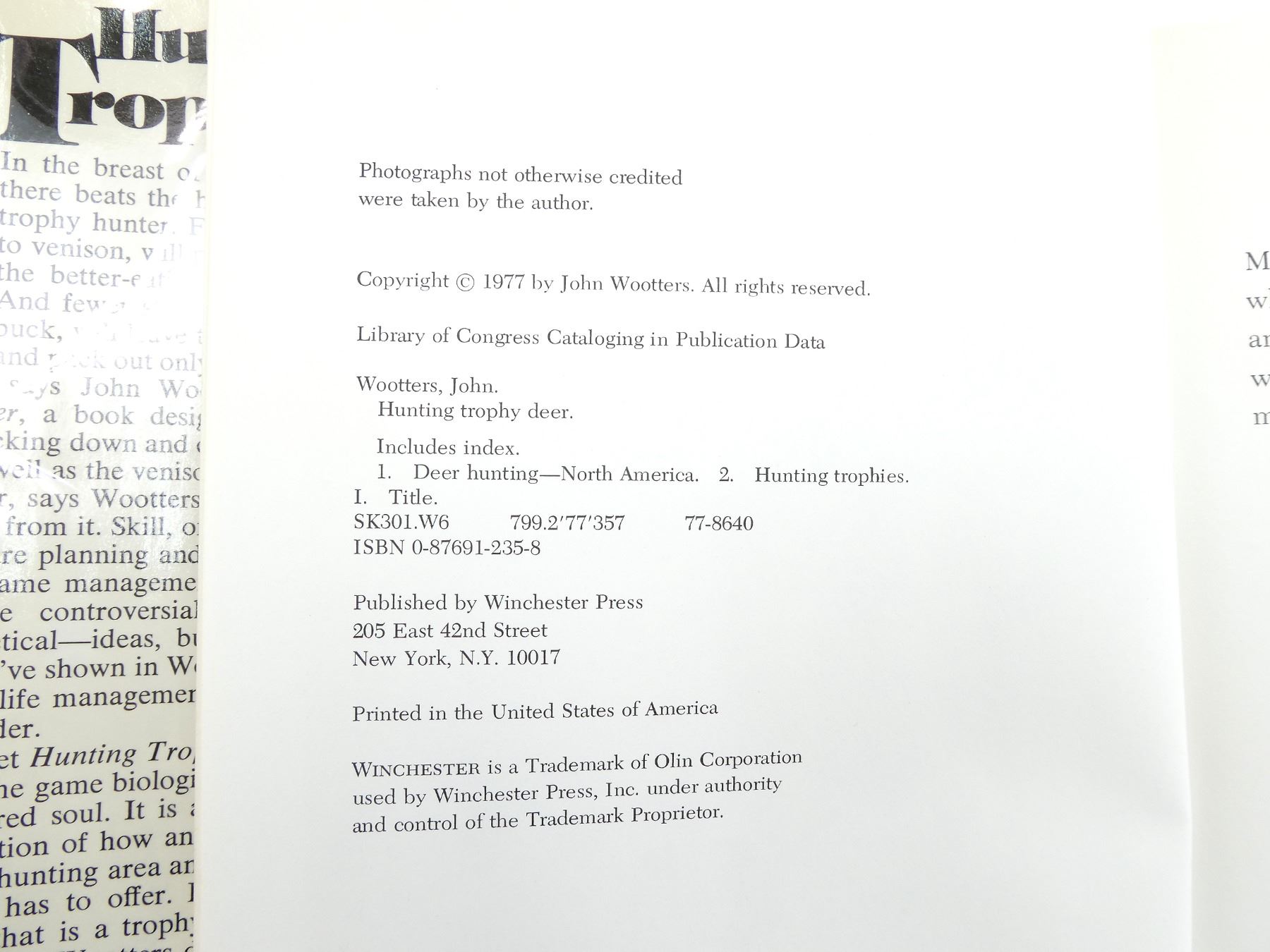 HARD COVERS WITH DUST COVERS, LOT INCLUDES; (1) "HUNTING TROPHY DEER" BOOK BY JOHN WOOTTERS, ISBN: 0-87691-235-8 & (1) "DEER HUNTING WITH DALRYMPLE, A LIFETIME OF LORE ON THE WHITETAIL AND MULE DEER" BOOK BY BYRON W. DALRYMPLE, ISBN: 0-679-50975-5. SEE PHOTOS.