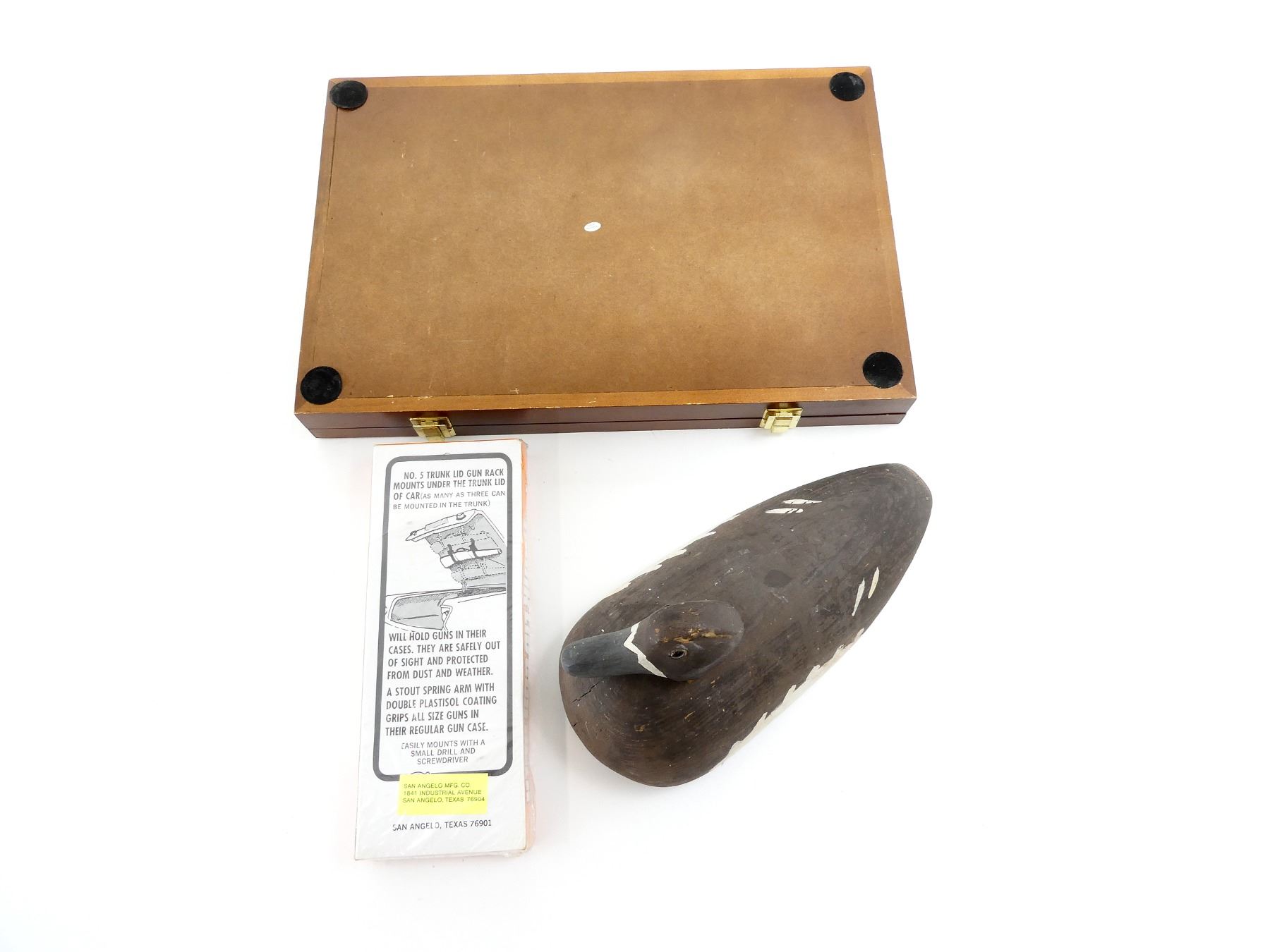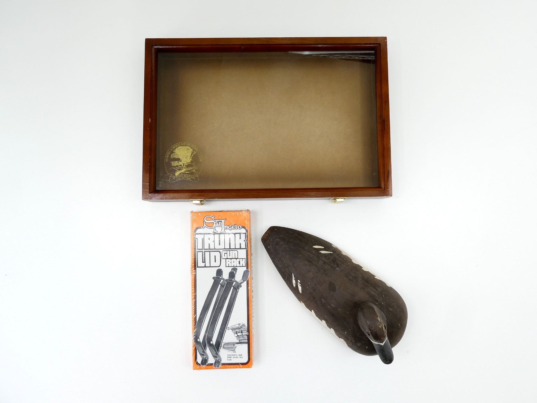 LOT INCLUDES; (1) DISPLAY CASE, MARKED "NORTH AMERICAN HUNTING CLUB", (1) WOODEN DECOY DUCK & (1) SAN ANGELO TRUNK LID GUN RACK, NOS, IN ORIGINAL PACKAGING. SEE PHOTOS. *NO GUARANTEE ON GLASS FOR SHIPPING*