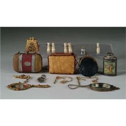 ASSORTED DOLL JEWELRY & ACCESSORIES. Lot includes purses, hand mirror, jewelry, celluloid writing tablet, purse, toilet powder and other accessories. CONDITION: Generally good to very good. 1-2426, 1-2430-1036 (75-150)