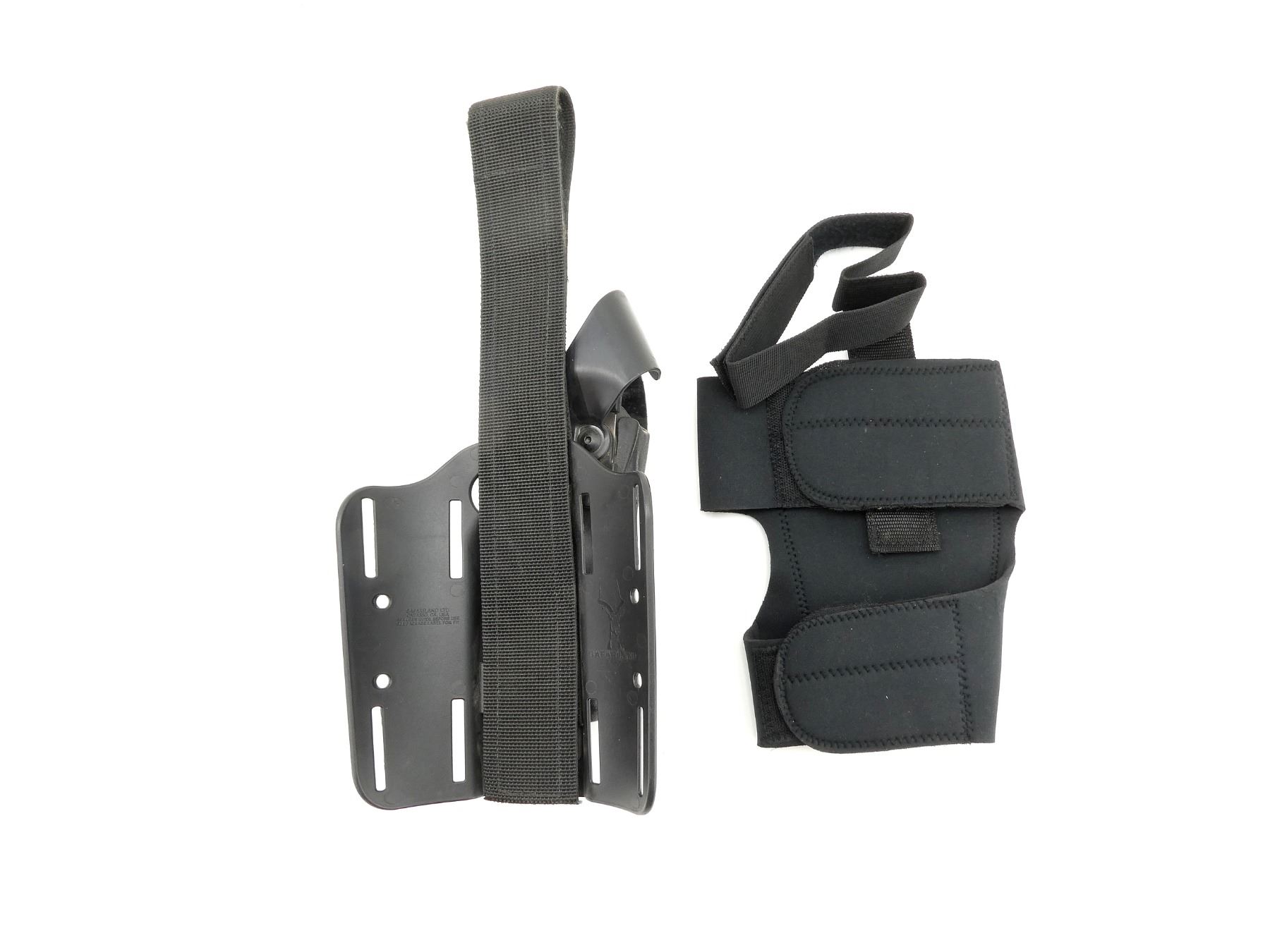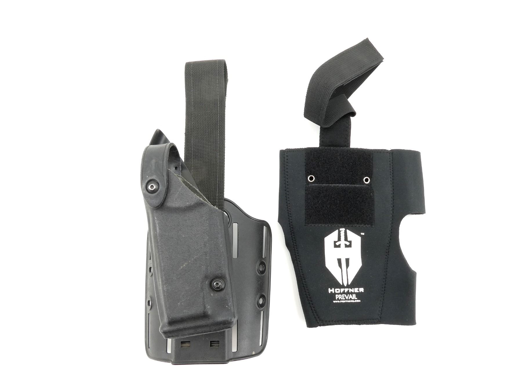 LOT INCLUDES; (1) SAFARILAND RIGHT HAND DROP LEG HOLSTER, BLACK POLYMER CONSTRUCTION & (1) HOFFNER PREVAIL ADJUSTABLE VELCRO DROP LEG HOLSTER HOLDER, BLACK. SEE PHOTOS.