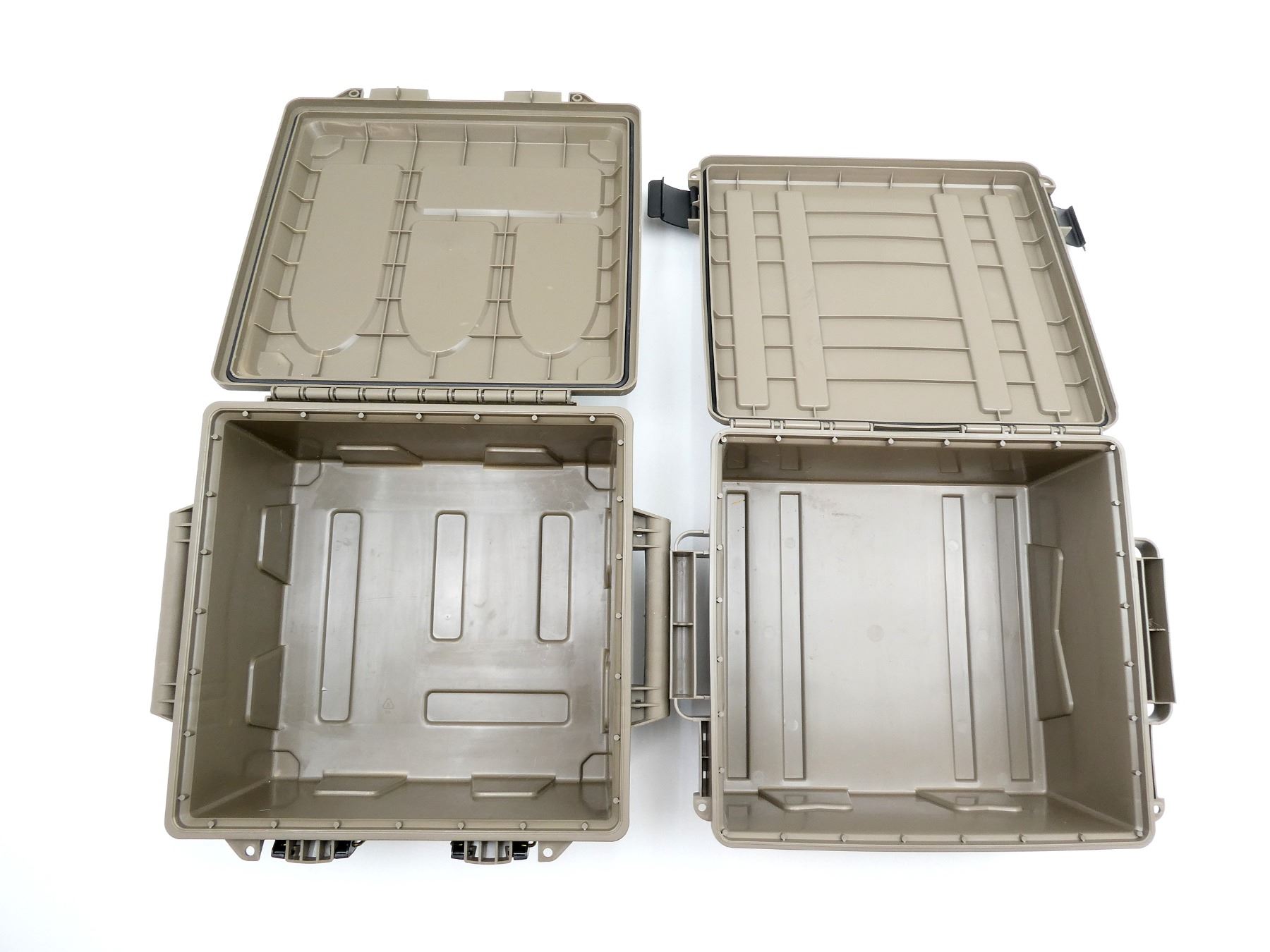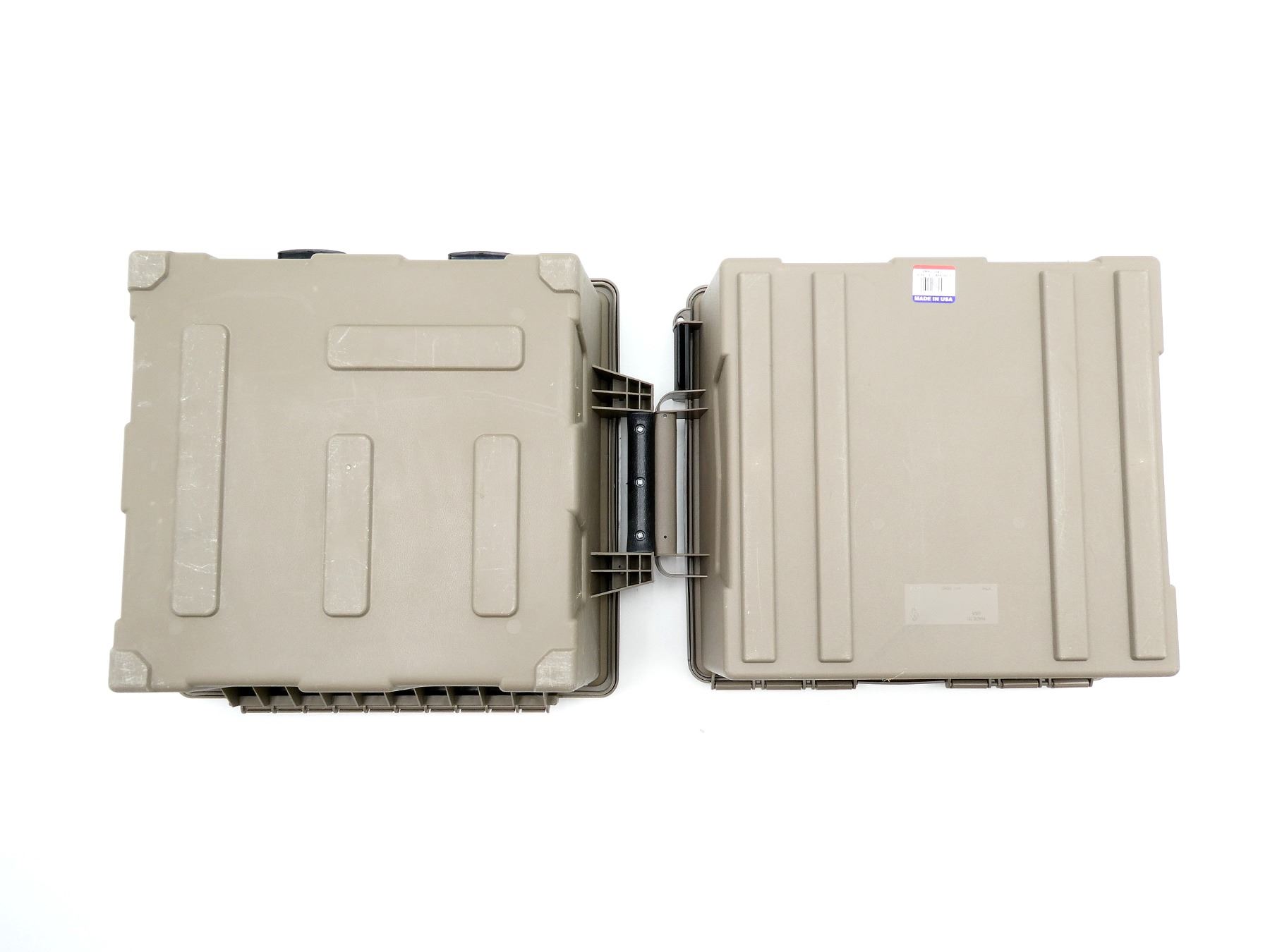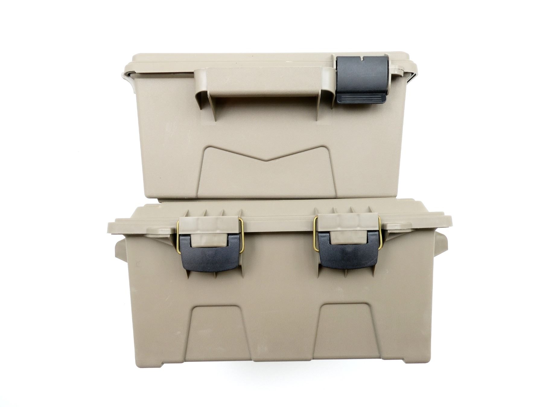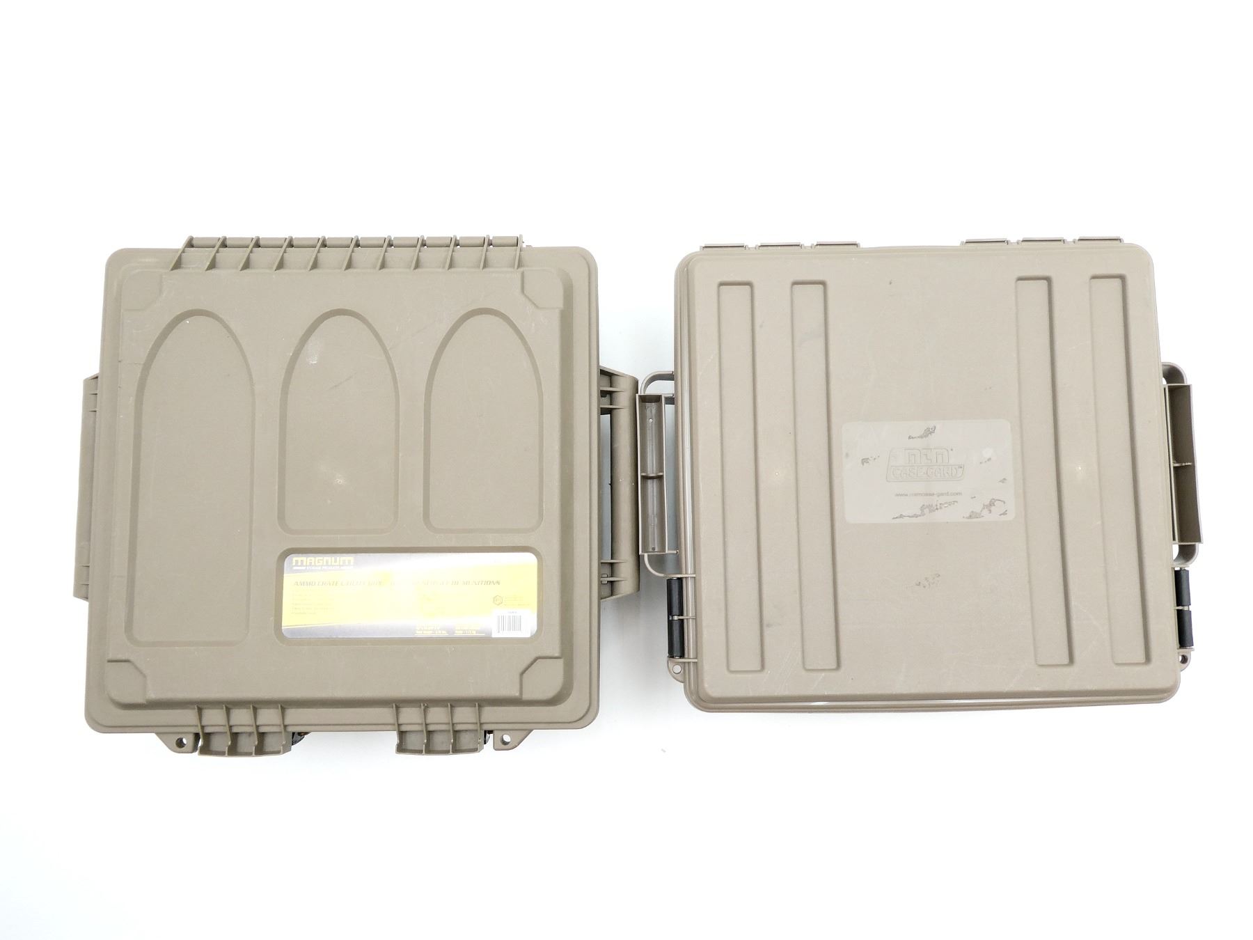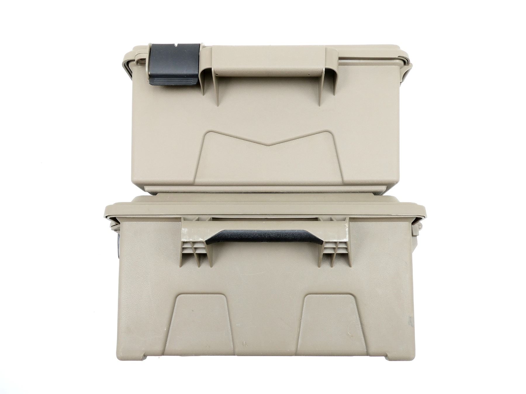 BROWN POLYMER WITH LATCHES & CARRY HANDLES, APPROX. 16.5" X 16" X 8.5", LOT INCLUDES; (1) MTM PLASTIC AMMO CRATE & (1) MAGNUM STORAGE PLASTIC AMMO CRATE. SEE PHOTOS.