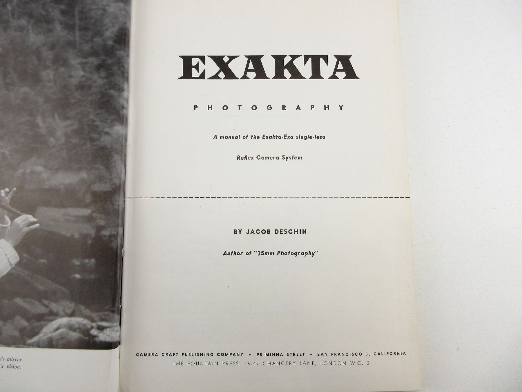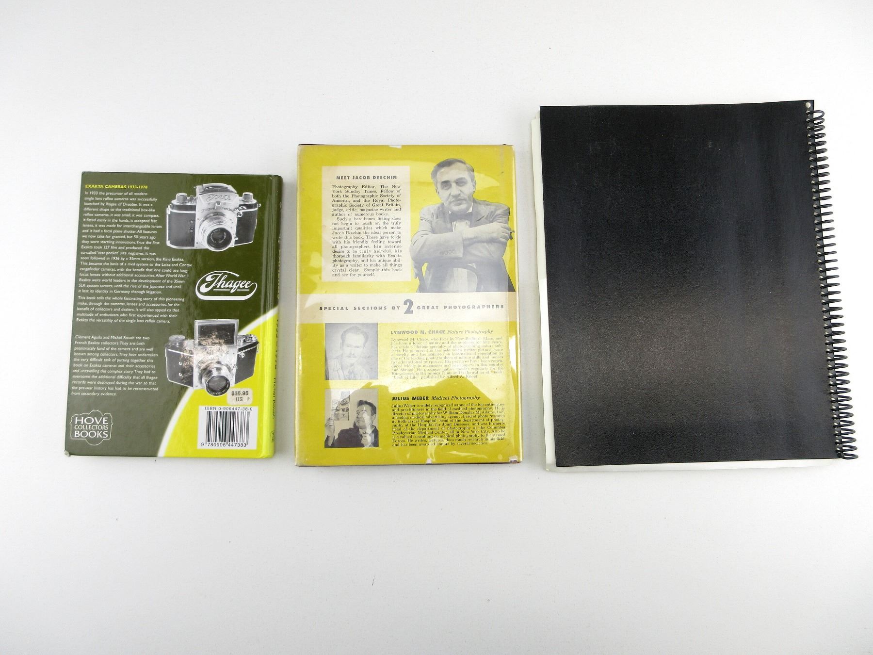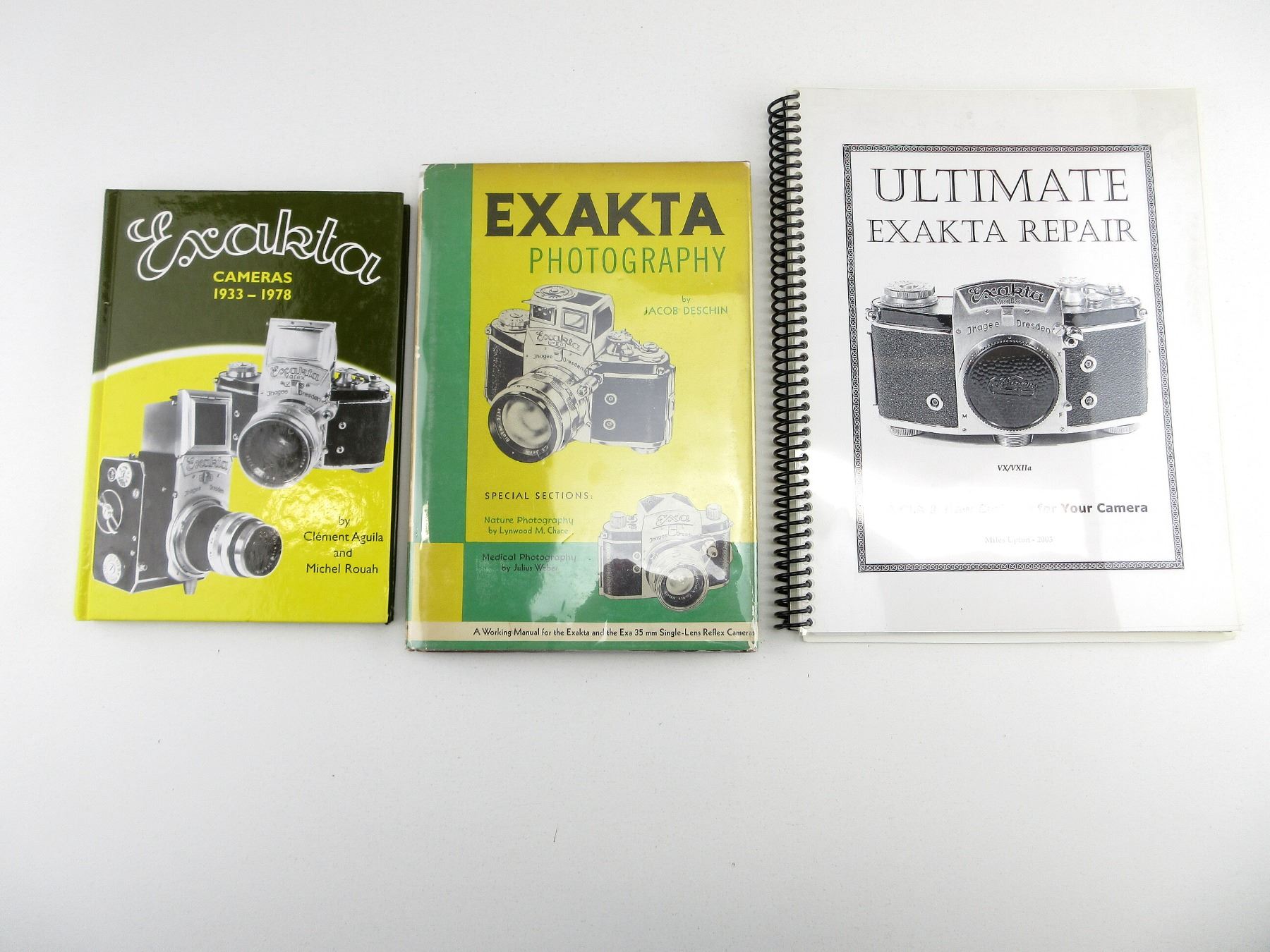 LOT INCLUDES; (1) "EXAKTA PHOTOGRAPHY" BOOK BY JACOB DESCHIN, HARD COVER WITH DUST COVER, COPYRIGHT 1959, (1) "EXAKTA CAMERAS 1933-1978" BOOK BY CLEMENT AGUILA & MICHEL ROUAH, HARD COVER WITH DUST COVER, ISBN: 0-906447-38-0 & (1) "ULTIMATE EXAKTA REPAIR" BOOK BY MILES UPTON, SPIRAL BOUND SOFT COVER, ISBN: 0-9727857-0-1. SEE PHOTOS.