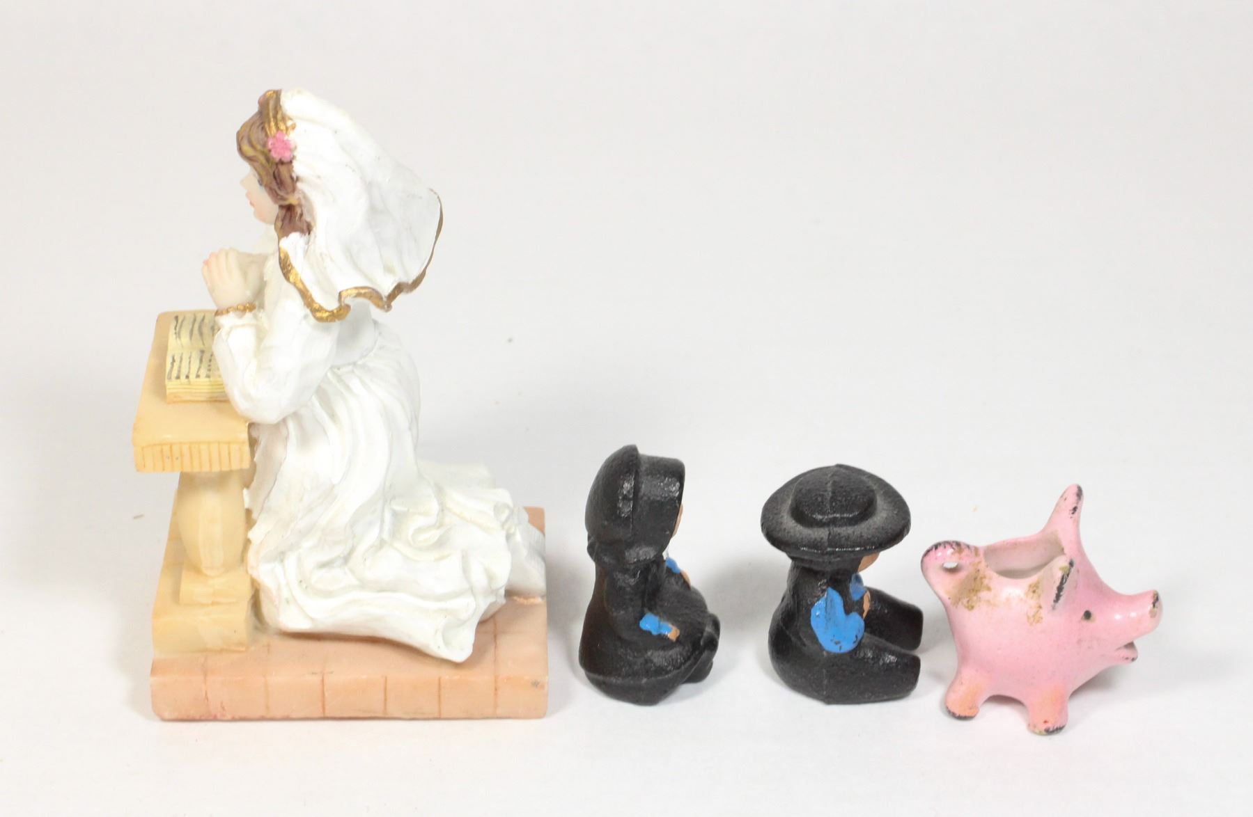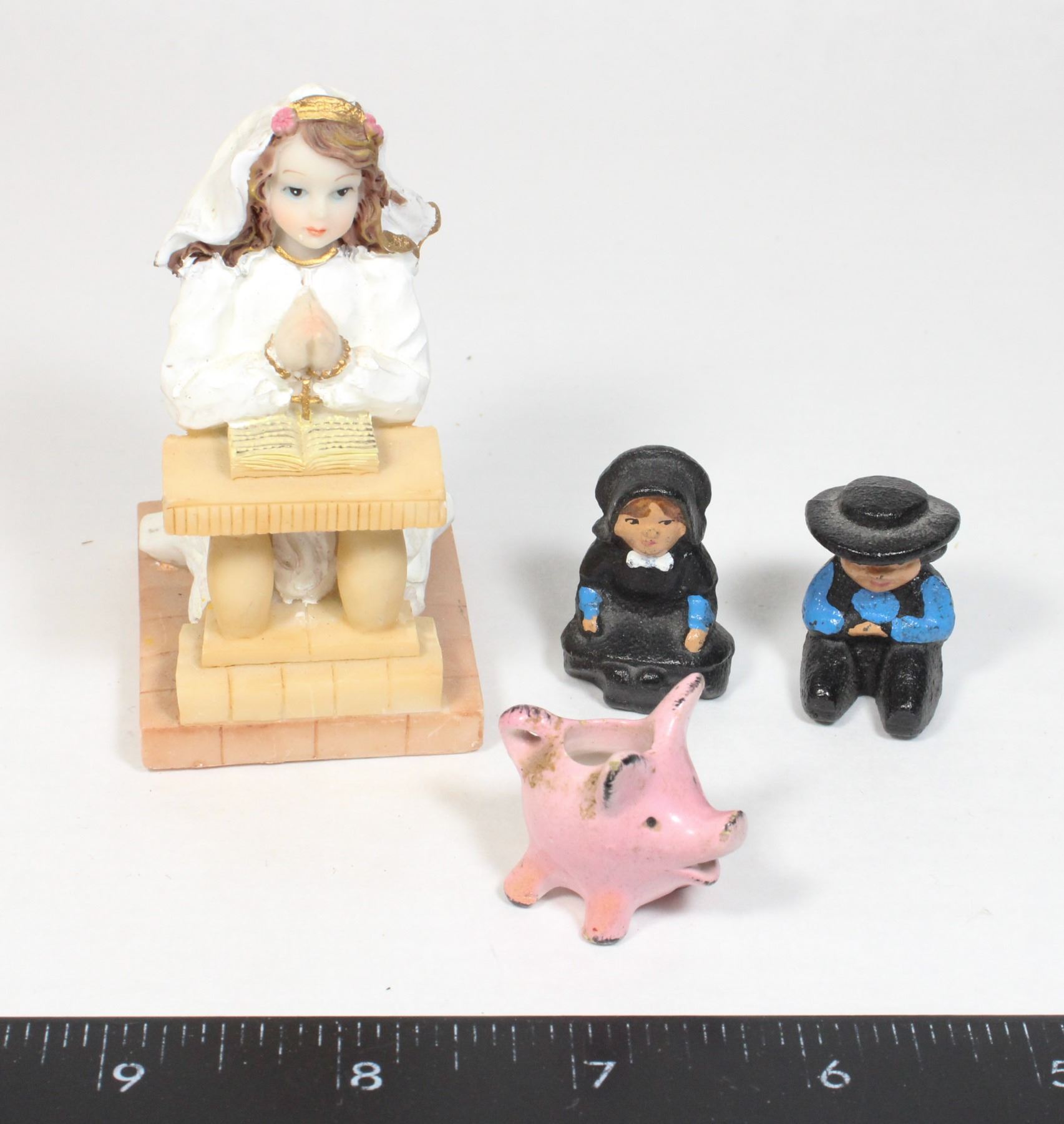 PAIR OF CAST IRON MAN AND WOMAN AMISH COUPLE FIGUERINES.VINTAGE PINK PIG TEAPOT MADE IN GERMANY.GIRL FIGURINE STATUE RELIGION.