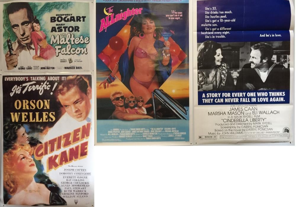 'The Allnighter' (two copies) , 'Cinderella Liberty', a Walt Disney poster, reproduction or later posters for Citizen Kane, The Maltese Falcon.