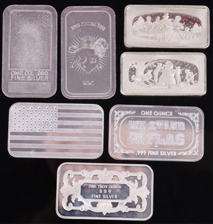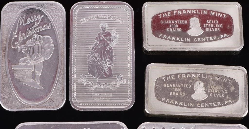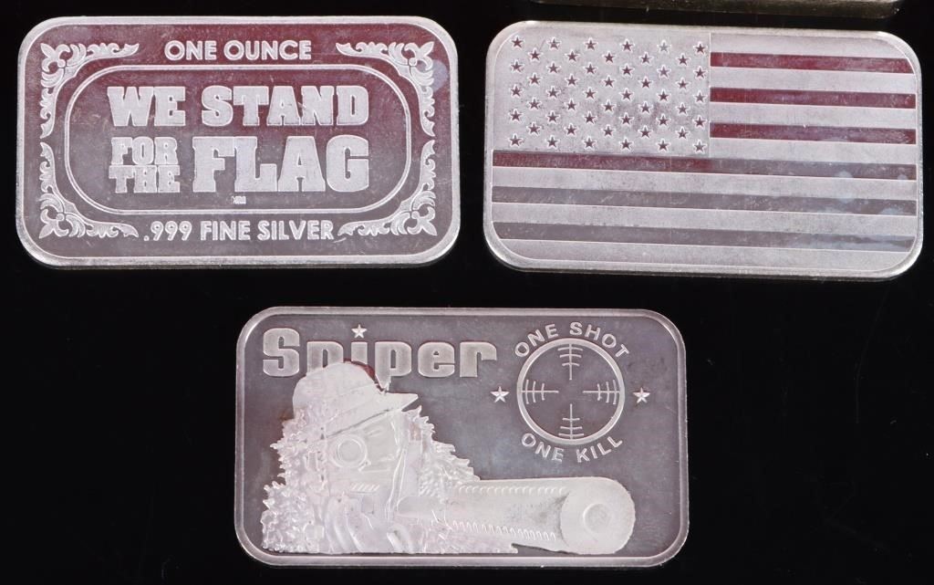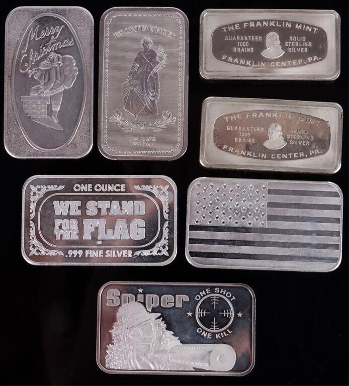 Assorted fine & 0.925 silver bullion bars to include two 1000 Grain Franklin Mint solid sterling silver bars, two We Stand For The Flag 1 oz fine silver bars, one Sniper One Shot, One Kill 1 troy oz fine silver bullion, one Merry Christmas 1 oz fine silver bullion, and one Ex Unitae Vires 1 oz fine silver bar.