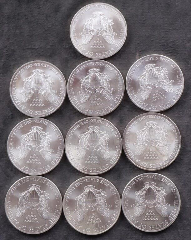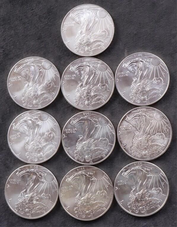 Assorted fine silver Type 1 American Eagles to include: years of 1998, 2002, 2003, 2009, 2012, 2014, and 2015.