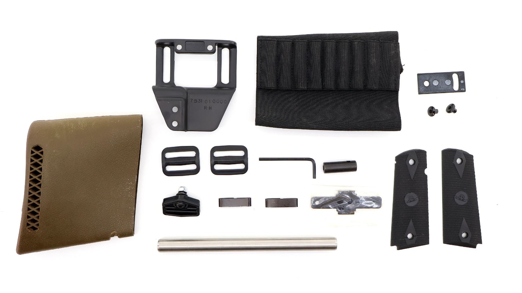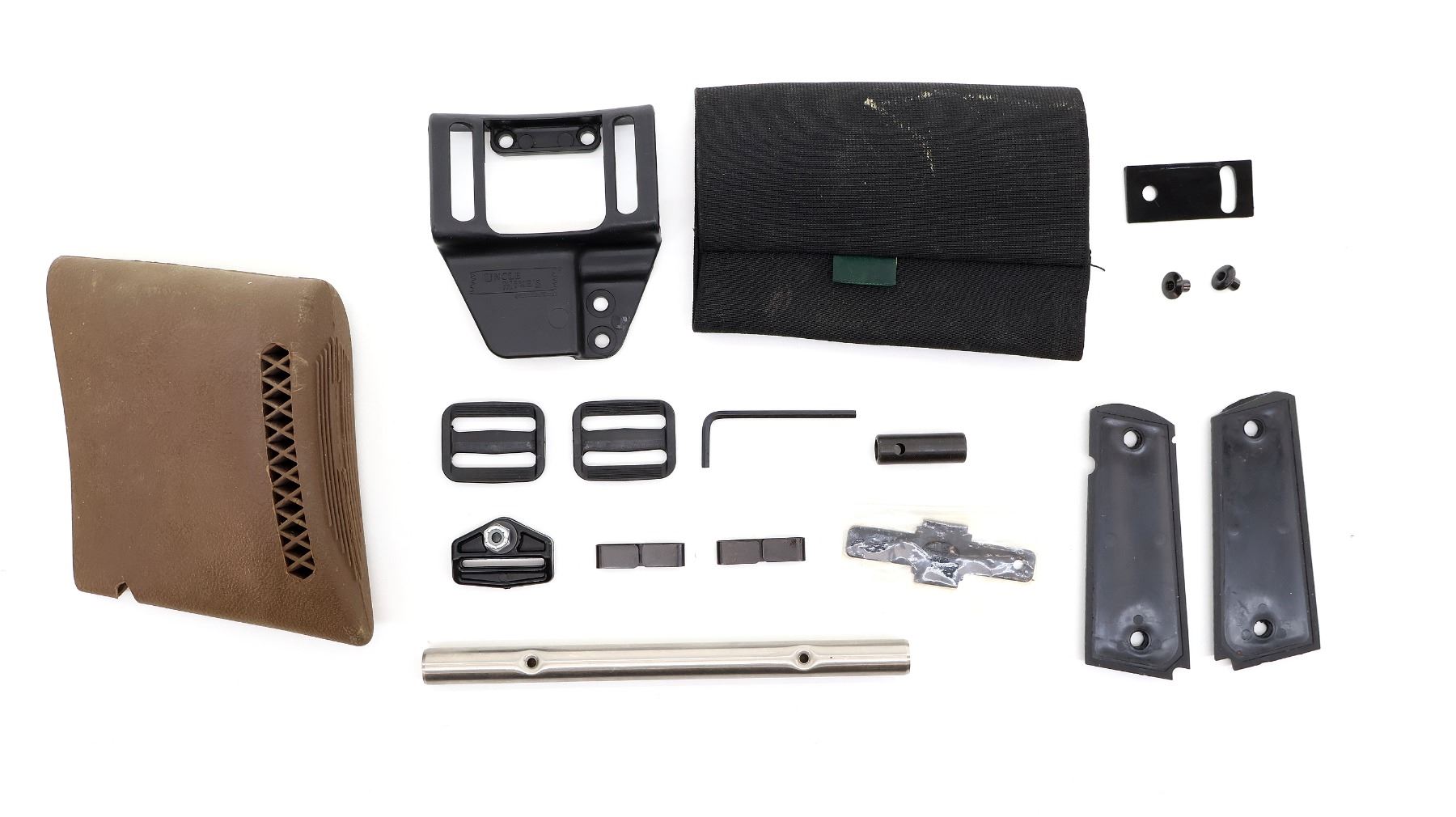 LOT INCLUDES; SLIP-ON RIFLE SHELL HOLDER, SLIP-ON BROWN RUBBER RECOIL PAD, MOSSBERG CHOKE WRENCH, HOLSTER PARTS, (1) SET OF 1911 GRIPS, NO SCREW, SLING BUCKLES, ETC. MAY REQUIRE FITTING. SEE PHOTOS.