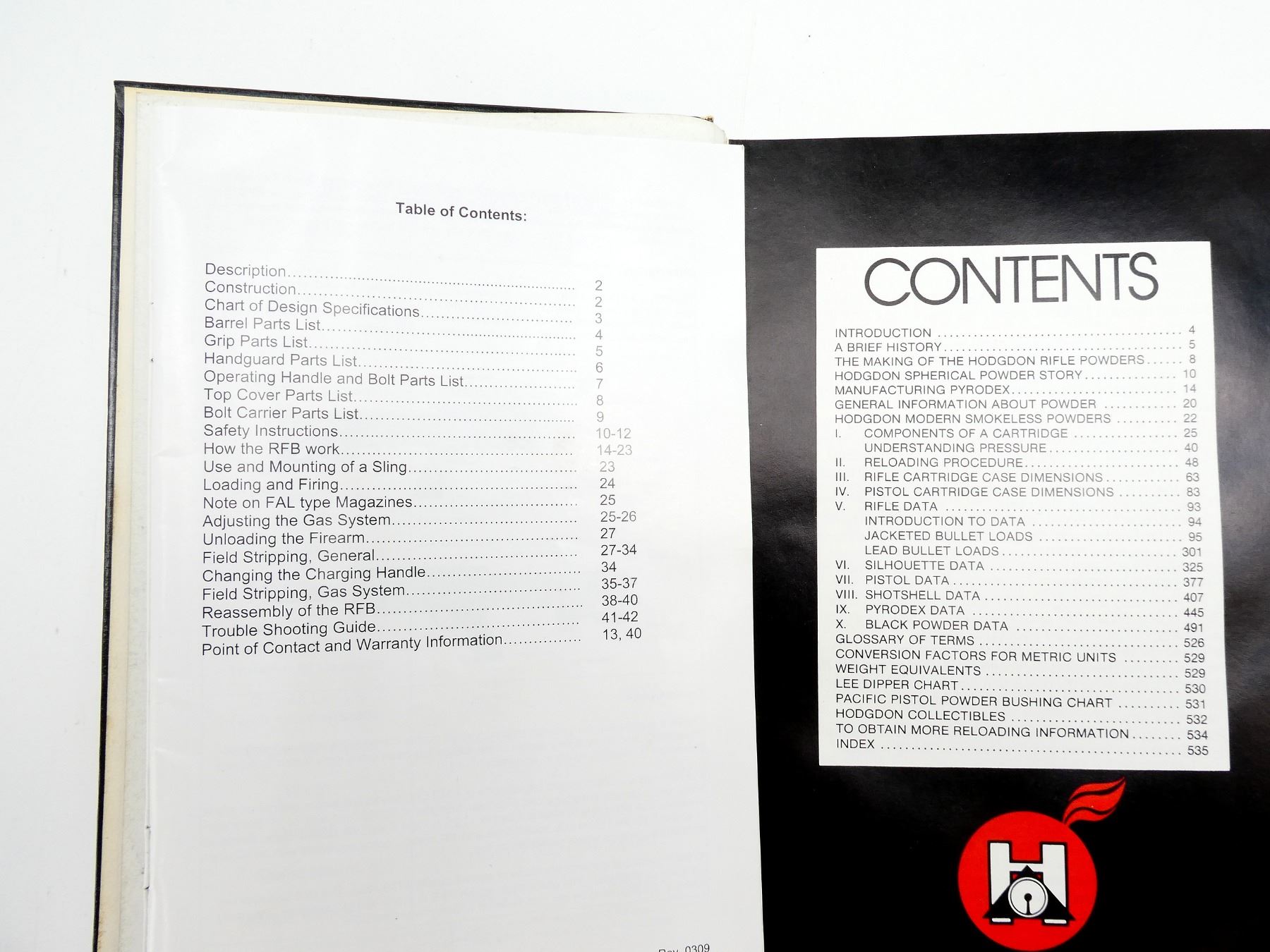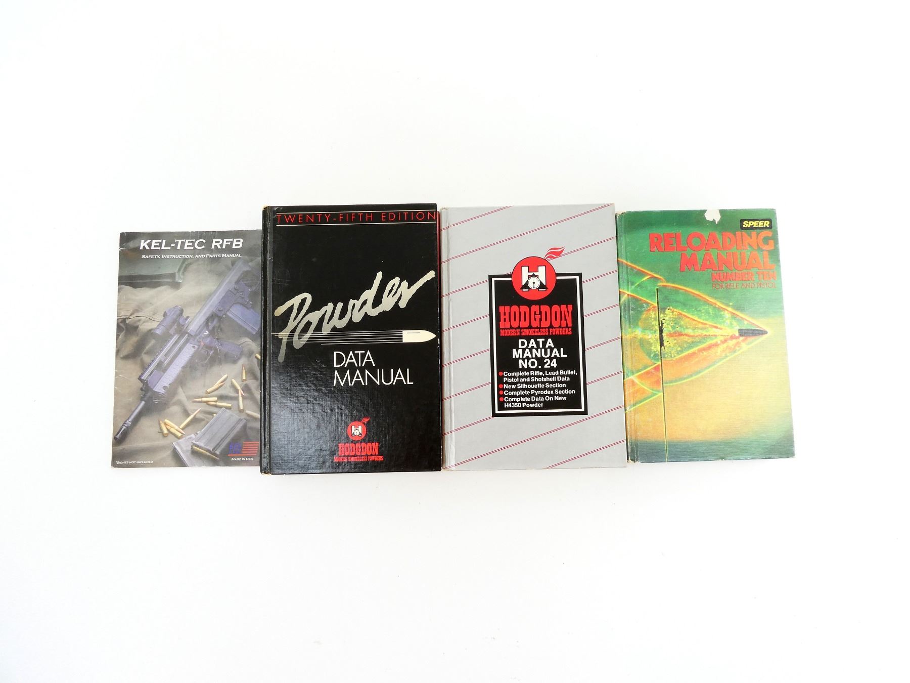 LOT INCLUDES; (1) "KEL-TEC RFB SAFETY, INSTRUCTION, AND PARTS MANUAL" MANUAL PUBLISHED BY KEL-TEC CNC INDUSTRIES INC., SOFT COVER, (1) "SPEER RELOADING MANUAL NUMBER TEN FOR RIFLE AND PISTOL" BOOK PUBLISHED BY OMARK INDUSTRIES INC., HARD COVER, COPYRIGHT 1980, (1) "HODGDON MODERN SMOKELESS POWDERS DATA MANUAL NO. 24" BOOK PUBLISHED BY HODGDON POWDER CO. INC., COPYRIGHT 1983 & (1) HODGDON POWDER DATA MANUAL TWENTY-FIFTH EDITION" BOOK PUBLISHED BY HODGDON POWDER CO. INC., COPYRIGHT 1986. SEE PHOTOS.