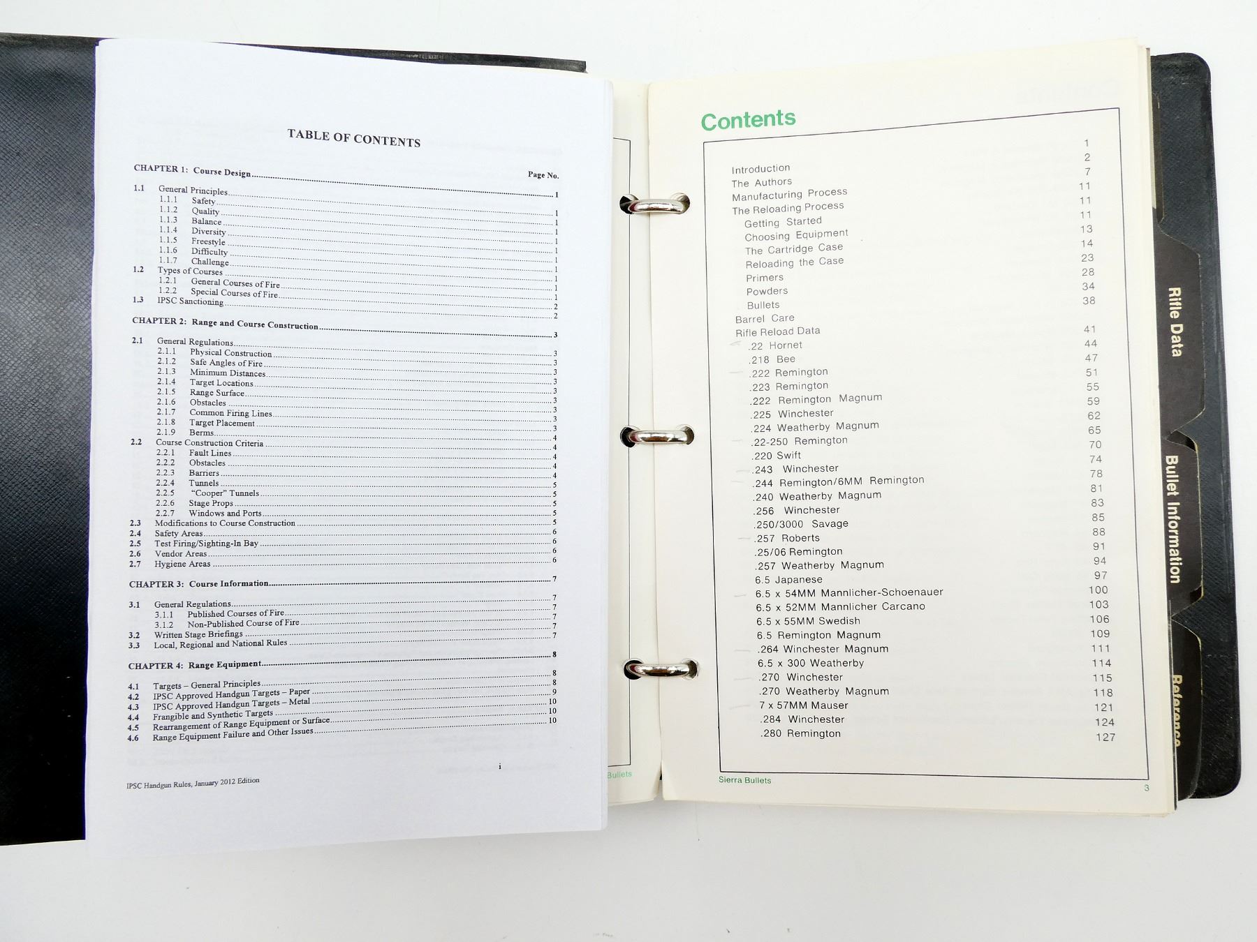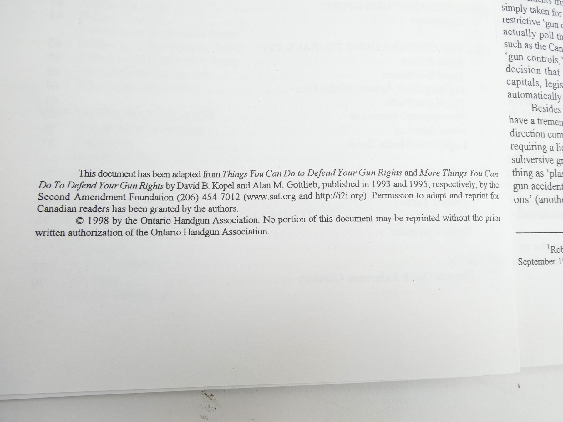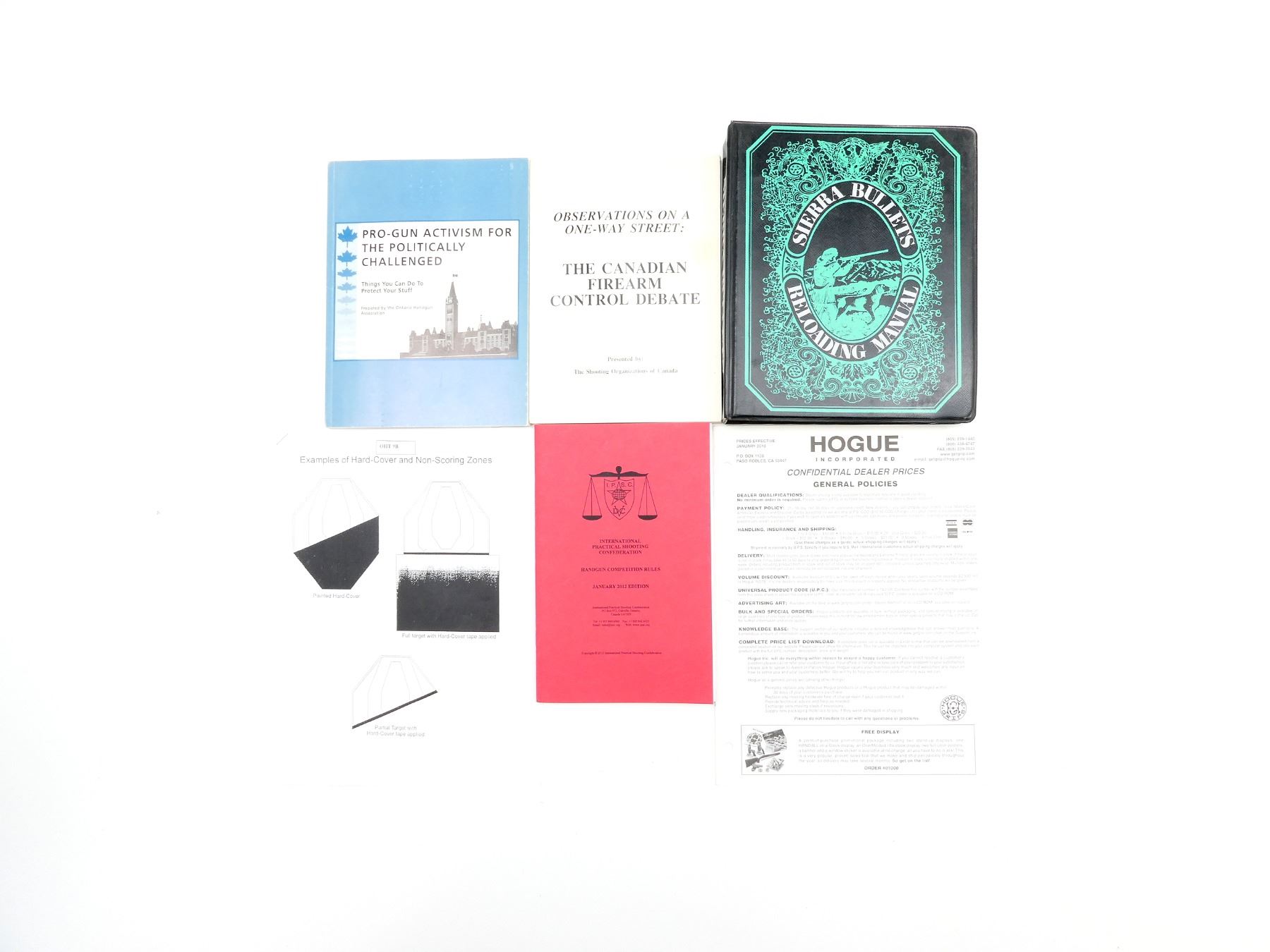 LOT INCLUDES; (1) "SIERRA BULLETS RELOADING MANUAL" PUBLISHED BY THE LEISURE GROUP INC., COPYRIGHT 1971, (1) "INTERNATIONAL PRACTICAL SHOOTING CONFEDERATION HANDGUN COMPETITION RULES, JANUARY 2012 EDITION" BOOK PUBLISHED BY INTERNATIONAL PRACTICAL SHOOTING CONFEDERATION, WITH ACCOMPANYING HANDOUT, COPYRIGHT 2011, (1) "OBSERVATIONS ON A ONE-WAY STREET: THE CANADIAN FIREARM CONTROL DEBATE" BOOK PRESENTED BY THE SHOOTING ORGANIZATIONS OF CANADA, COPYRIGHT 1994, (1) "PRO-GUN ACTIVISM FOR THE POLITICALLY CHALLENGED, THINGS YOU CAN DO TO PROTECT YOUR STUFF" PREPARED BY THE ONTARIO HANDGUN ASSOCIATION, COPYRIGHT 1998 & (1) "HOGUE INCORPORATED CONFIDENTIAL DEALER PRICES" PAMPHLET. SEE PHOTOS.