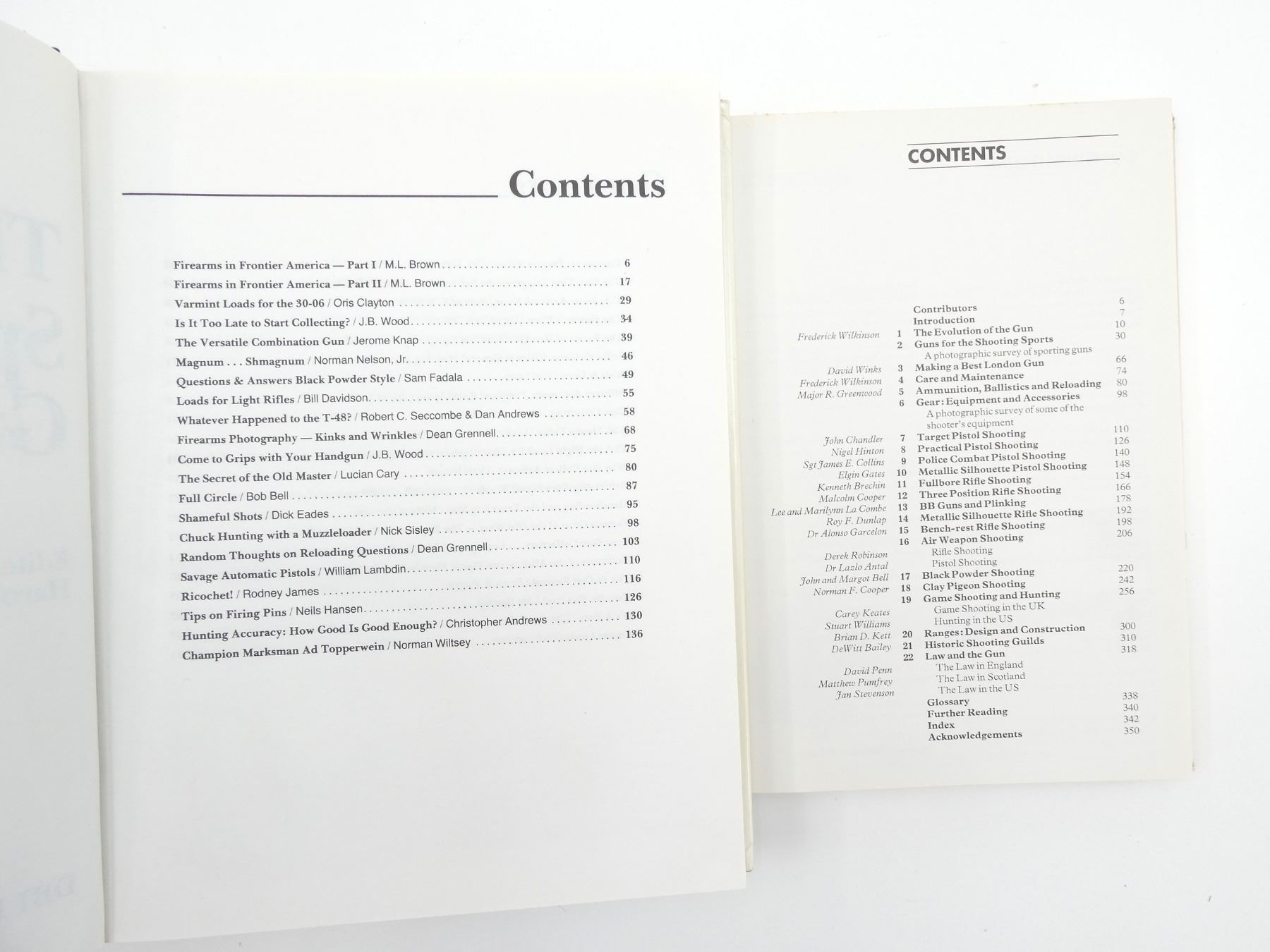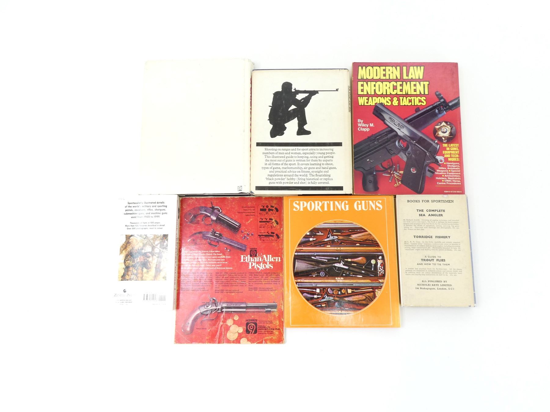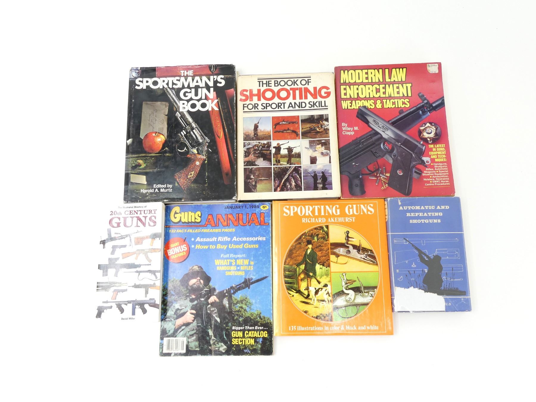 LOT INCLUDES; (1) "MODERN LAW ENFORCEMENT WEAPONS & TACTICS" BOOK, BY WILEY M. CLAPP, SOFT COVER, ISBN 87349-008-8, (1) "GUNS ANNUAL" MAGAZINE, SOFT COVER, JANUARY 1, 1984, (1) "THE SPORTSMAN'S GUN BOOK" BOOK, EDITED BY HAROLD A. MURTZ, HARD COVER WITH DUST COVER, COPYRIGHT MCMLXXXII, (1) "SPORTING GUNS" BOOK, BY RICHARD AKEHURST, HARD COVER WITH DUST COVER, ISBN 7064-0031-3, (1) "THE BOOK OF SHOOTING FOR SPORT AND SKILL" BOOK, EDITED BY FREDERICK WILKINSON, HARD COVER WITH DUST COVER, ISBN 0-517-541777, (1) "20TH CENTURY GUNS" BOOK, BY DAVID MILLER, SOFT COVER, ISBN 978-0-7603-1560-6, (1) "AUTOMATIC AND REPEATING SHOTGUNS" BOOK, BY RICHARD ARNOLD, HARD COVER WITH DUST COVER, COPYRIGHT 1958. SEE PHOTOS.