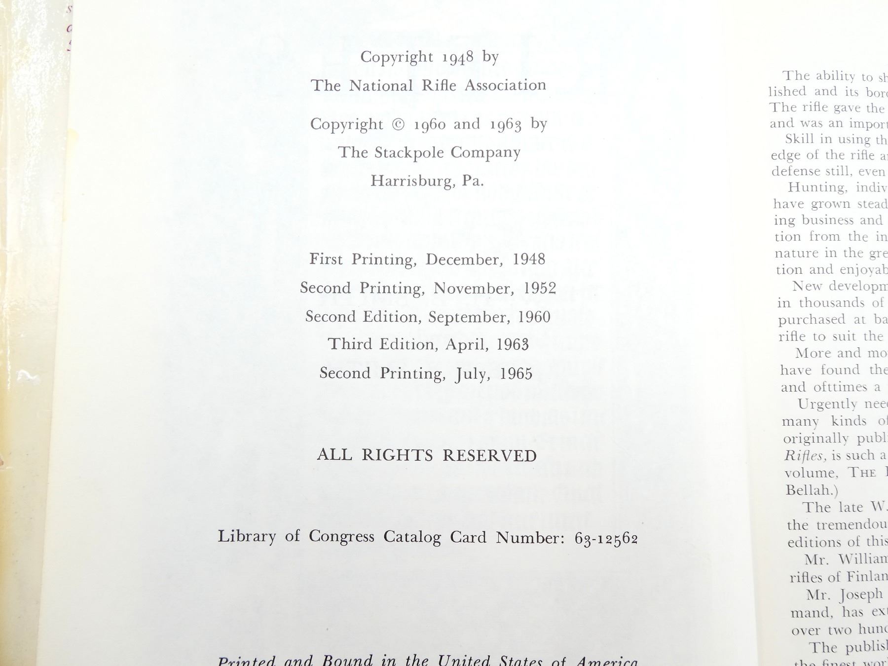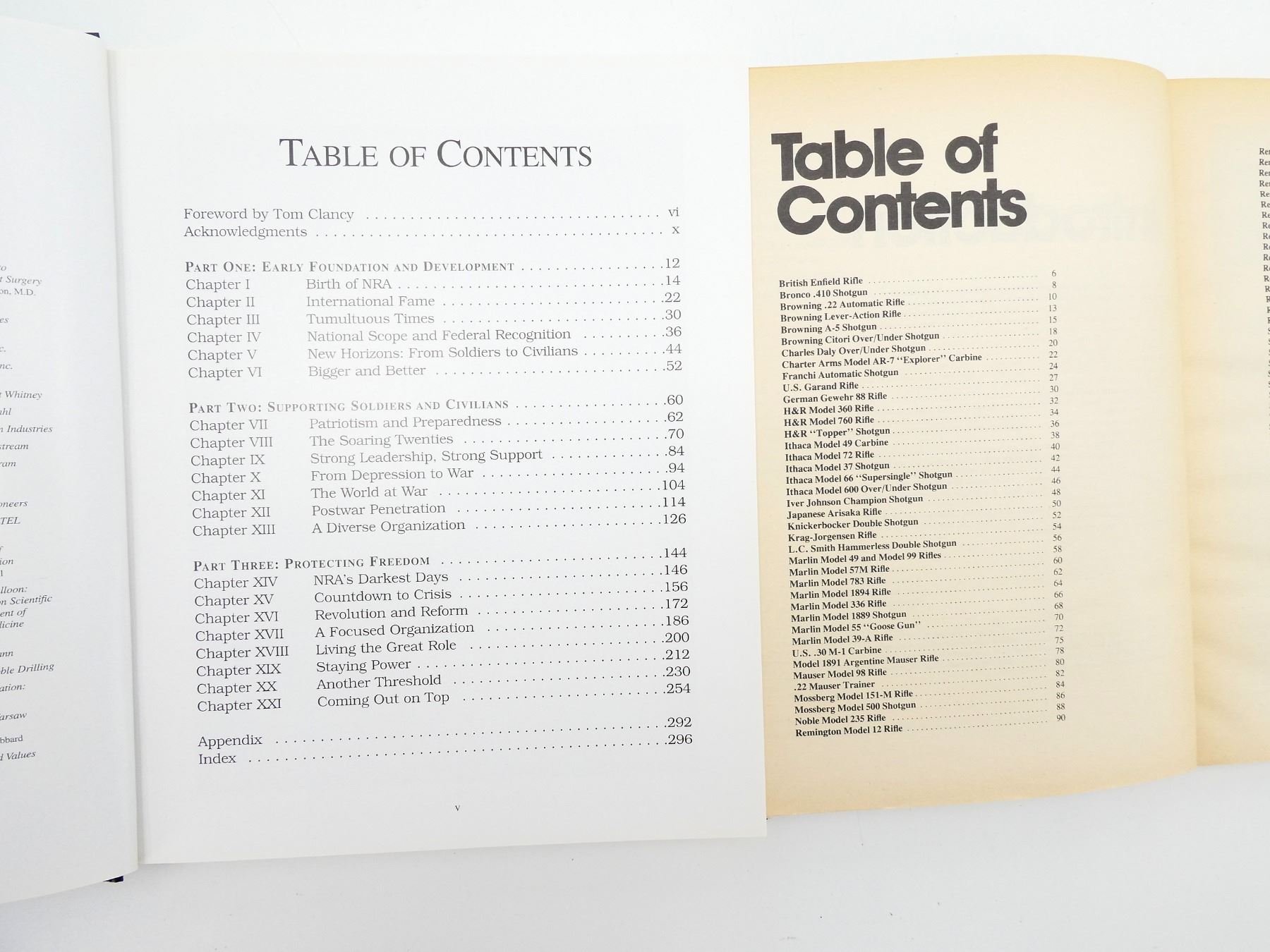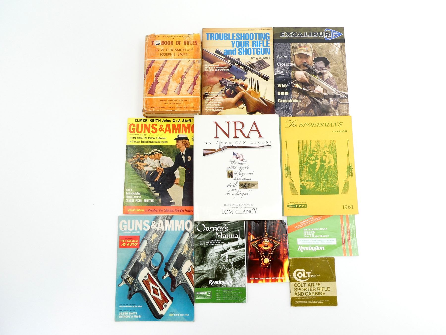 LOT INCLUDES; (1) "NRA, AN AMERICAN LEGEND" BOOK, BY JEFFREY L. RODENGEN, HARD COVER WITH DUST COVER, ISBN 0-945903-81-2, (1) "THE BOOK OF RIFLES" BOOK, BY W.H.B. SMITH & JOSEPH E. SMITH, HARD COVER WITH DUST COVER, SECOND PRINTING 1965, (1) "TROUBLESHOOTING YOUR RIFLE AND SHOTGUN" BOOK, BY J.B. WOOD, SOFT COVER, ISBN 0695-81198-3, (1) "THE SPORTSMAN'S CATALOG", SOFT COVER, DATED 1961, (1) "GUNS & AMMO" MAGAZINE, SOFT COVER, DATED FEBRUARY 1960, IN PLASTIC, (1) "GUNS & AMMO" MAGAZINE, SOFT COVER, DATED NOVEMBER 1961, IN PLASTIC, ETC. SEE PHOTOS.