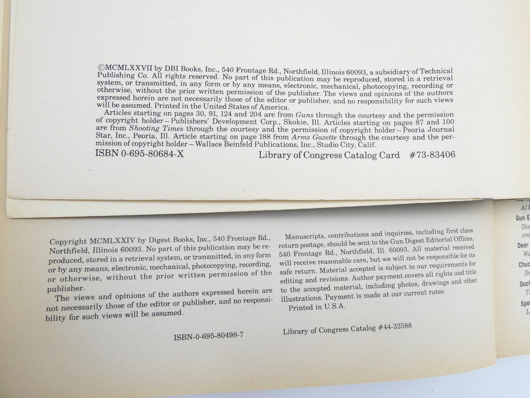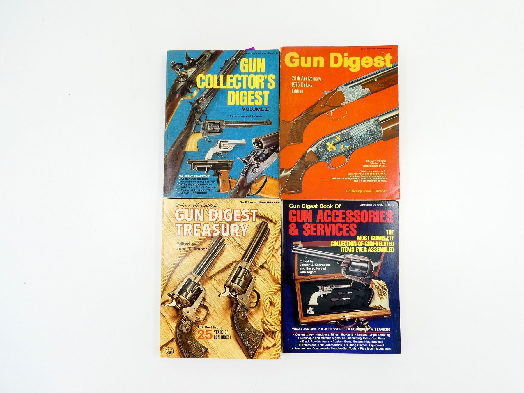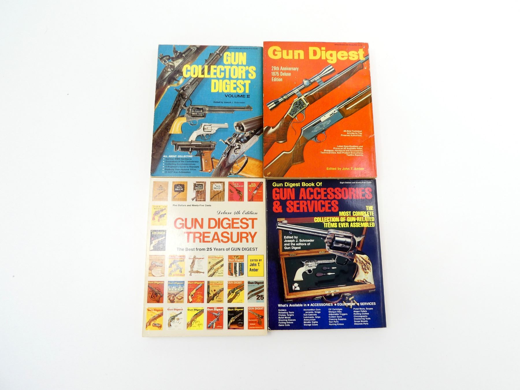 SOFT COVERS, LOT INCLUDES; (1) "GUN DIGEST, 29TH ANNIVERSARY 1975 DELUXE EDITION" CATALOGUE BY JOHN T. AMBER, ISBN: 0-695-80498-7, (1) "GUN DIGEST TREASURY" CATALOGUE BY JOHN T. AMBER, ISBN: 0-695-80359-X, (1) "GUN DIGEST BOOK OF GUN ACCESSORIES & SERVICES" BOOK EDITED BY JOSEPH J. SCHROEDER AND THE EDITORS OF GUN DIGEST, ISBN: 0-695-81313-7 & (1) "GUN COLLECTOR'S DIGEST, VOLUME II" CATALOGUE EDITED BY JOSEPH J. SCHROEDER, ISBN: 0-695-80684-X. SEE PHOTOS.