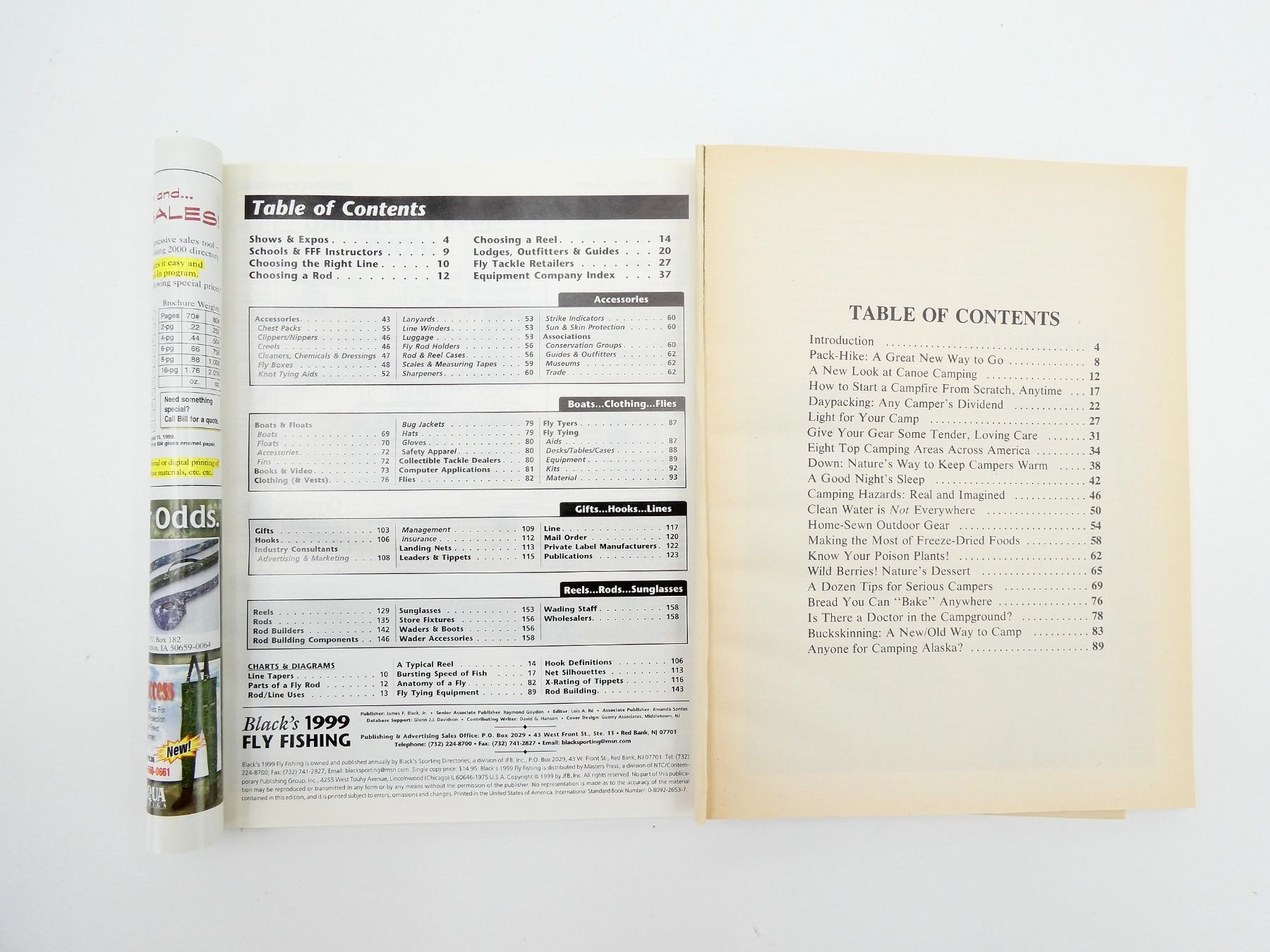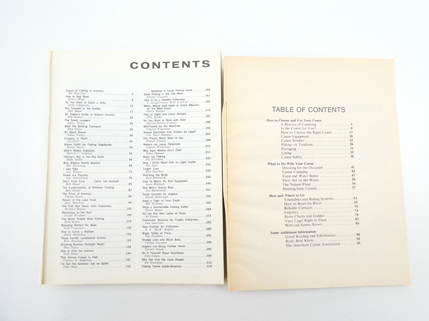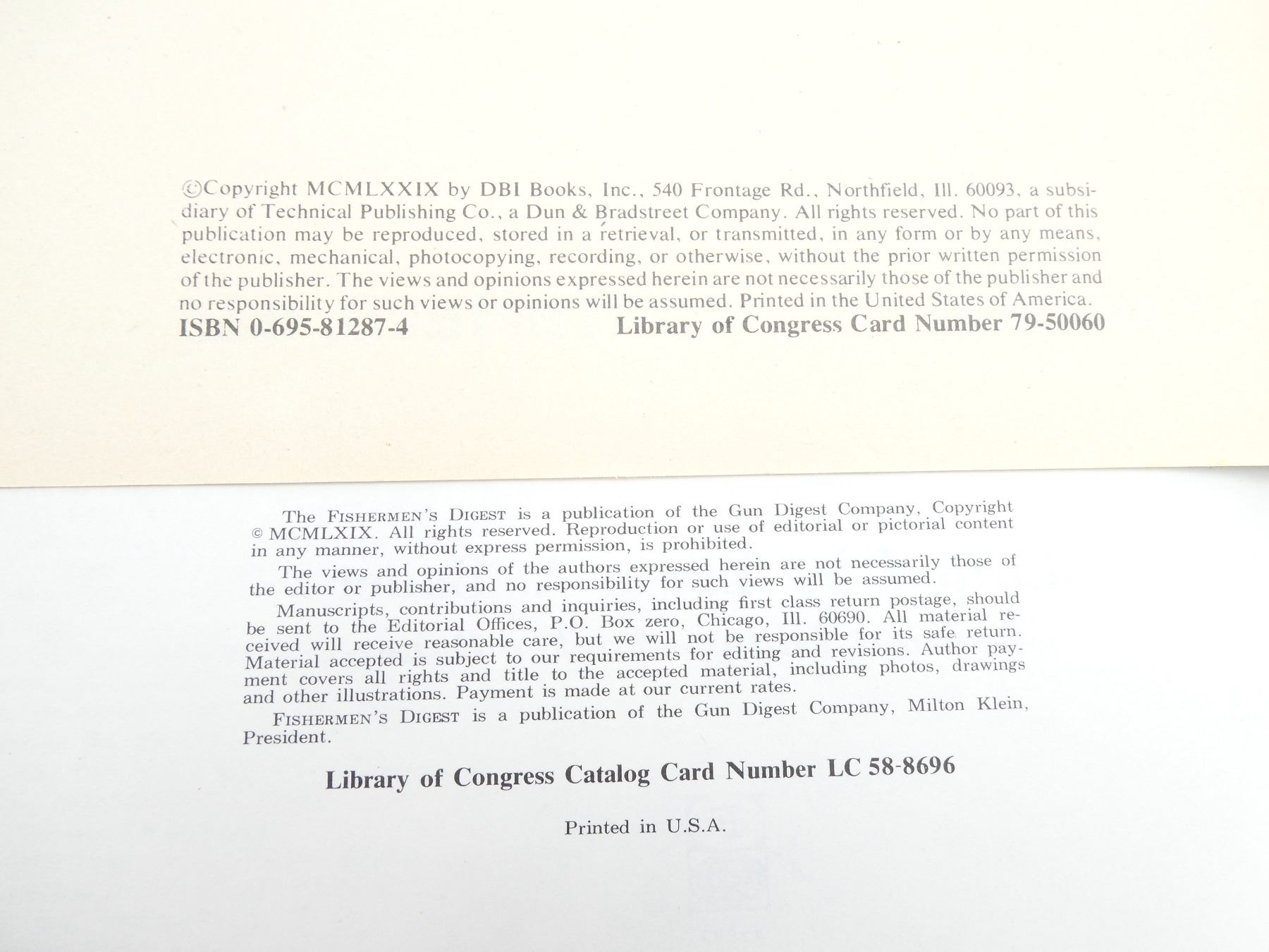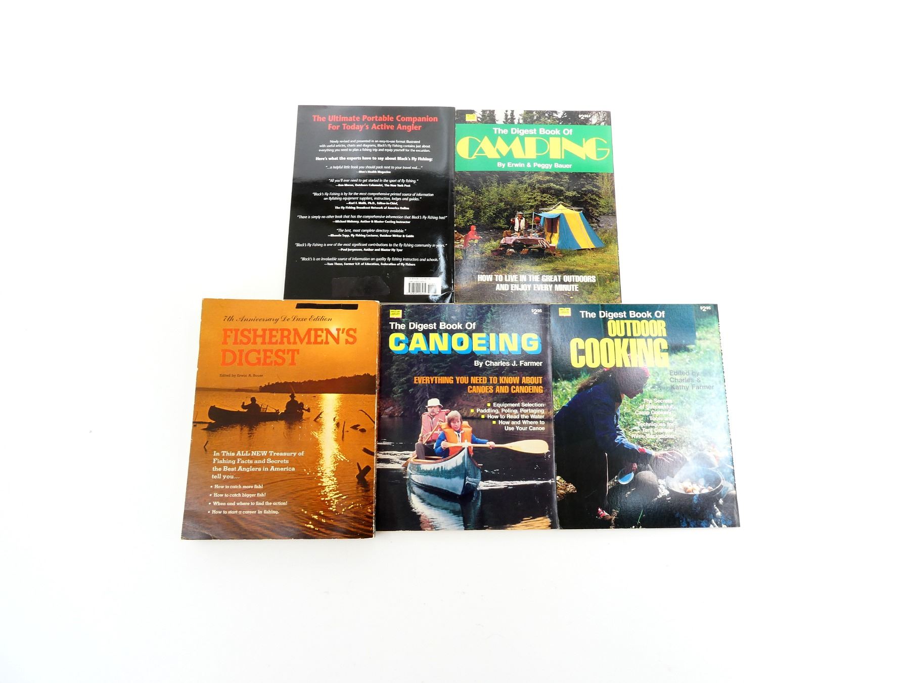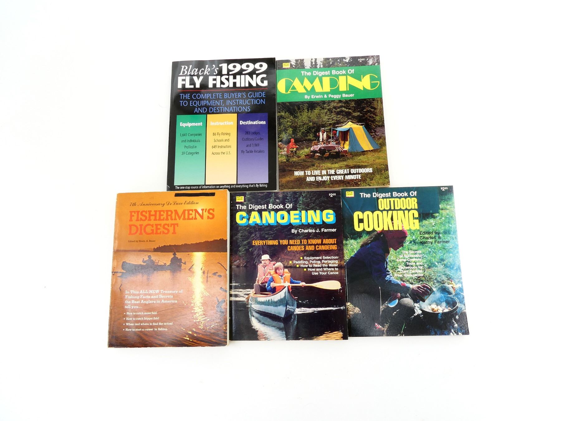 SOFT COVERS, LOT INCLUDES; (1) "FISHERMEN'S DIGEST" BOOK EDITED BY ERWIN A. BAUER, COPYRIGHT 1969, (1) "BLACK'S 1999 FLY SISHING" CATALOGUE, ISBN: 0-8092-2653-7, (1) "THE DIGEST BOOK OF CANOEING" BOOK BY CHARLES J. FARMER, ISBN: 0-695-81287-4, (1) "THE DIGEST BOOK OF OUTDOOR COOKING" BOOK BY CHARLES & KATHY FARMER, ISBN: 0-695-81285-8 & (1) "THE DIGEST BOOK OF CAMPING" BOOK BY ERWIN & PEGGY BAUER, ISBN: 0-695-81281-5. SEE PHOTOS.