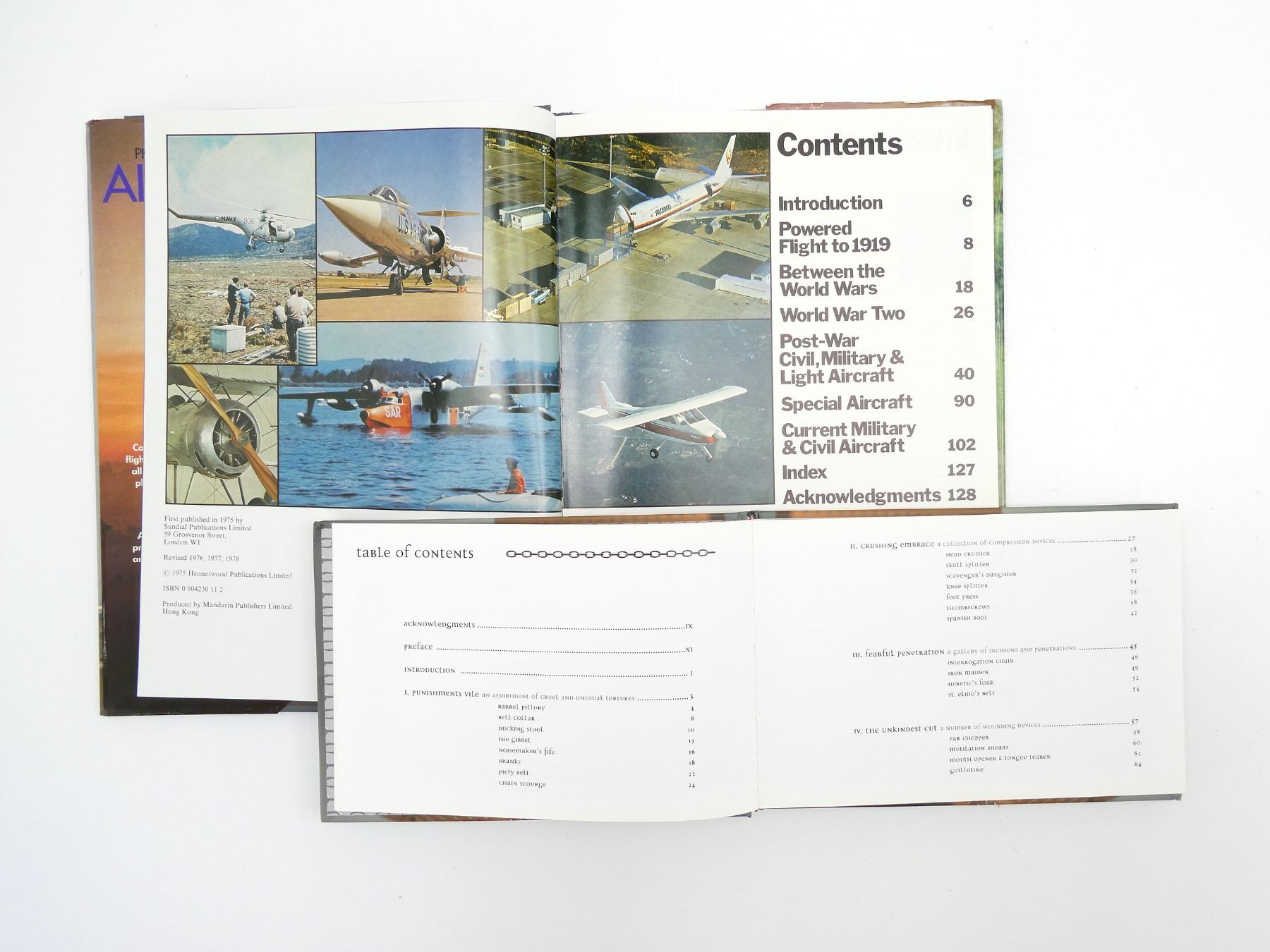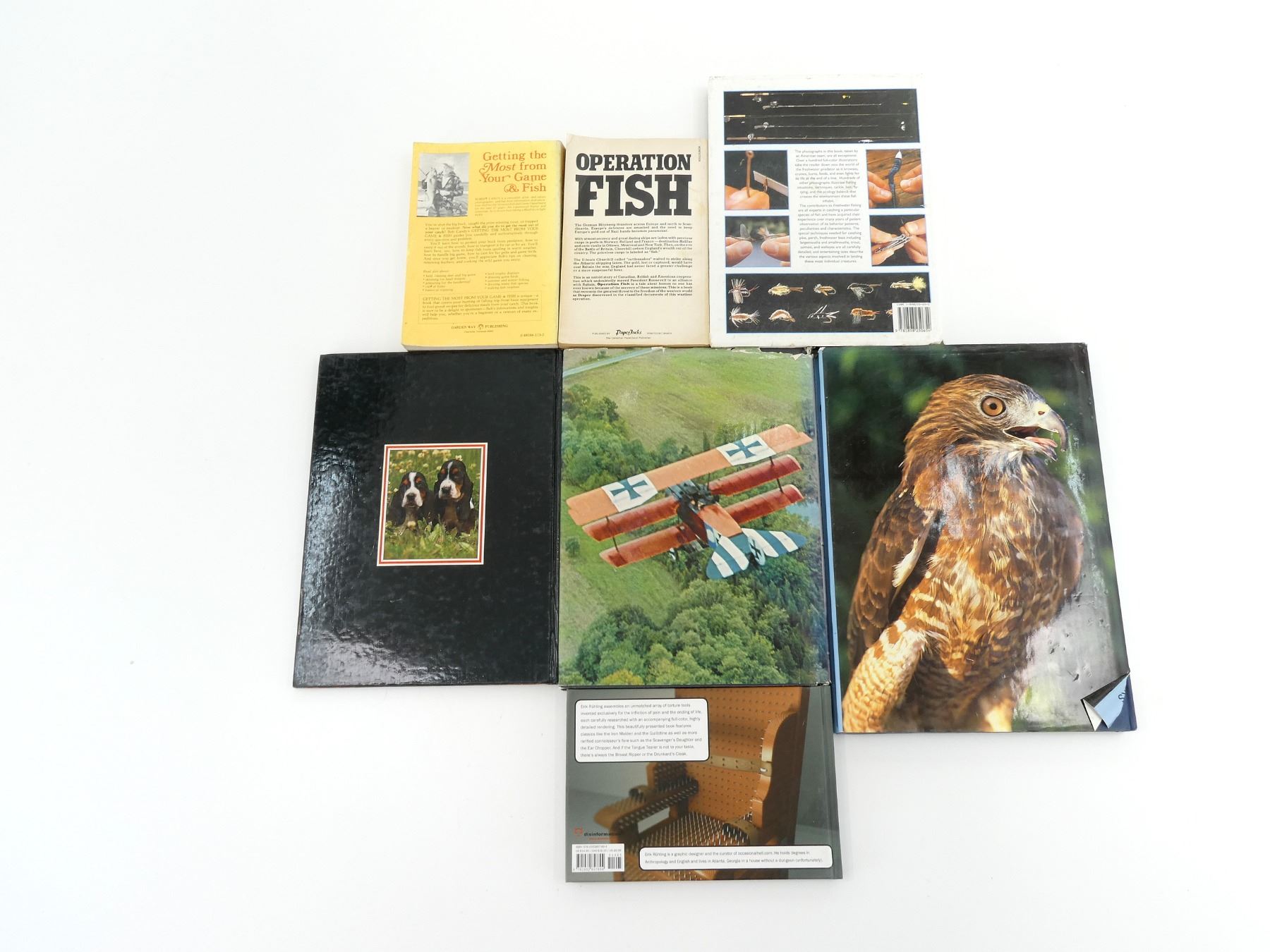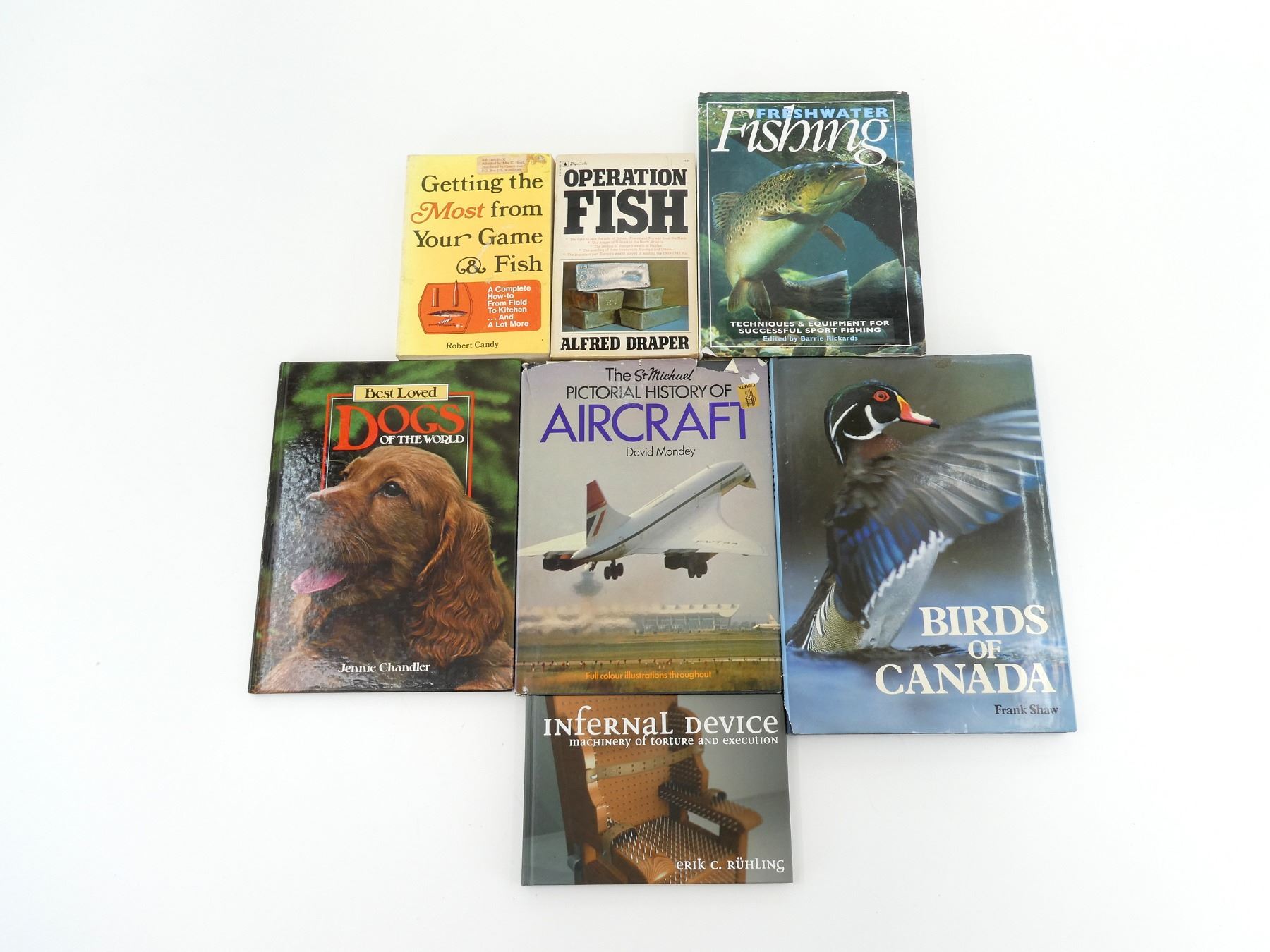 LOT INCLUDES; (1) "FRESHWATER FISHING" BOOK, EDITED BY BARRIE RICHARDS, HARD COVER WITH DUST COVER, ISBN 1-898250-65-0, (1) "OPERATING FISH" BOOK, BY ALFRED DRAPER, SOFT COVER, ISBN 0-7701-0134-8, (1) "GETTING THE MOST FROM YOUR GAME & FISH" BOOK, BY ROBERT CANDY, SOFT COVER, ISBN 0-88266-113-2, (1) "BIRDS OF CANADA" BOOK, BY FRANK SHAW, HARD COVER WITH DUST COVER, ISBN 0-86283-639-5, (1) "THE ST. MICHAEL PICTORAL HISTORY OF AIRCRAFT" BOOK, BY DAVID MONDEY, HARD COVER WITH DUST COVER, ISBN 0-904230-11-2, (1) "BEST LOVED DOGS OF THE WORLD" BOOK, BY JENNIE CHANDLER, HARD COVER, ISBN 0-89009-286-9, (1) "INFERNAL DEVICE, MACHINERY OF TORTURE AND EXECUTION" BOOK, BY ERIK C. RUHLING, HARD COVER, ISBN 978-1932857-89-4. SEE PHOTOS.