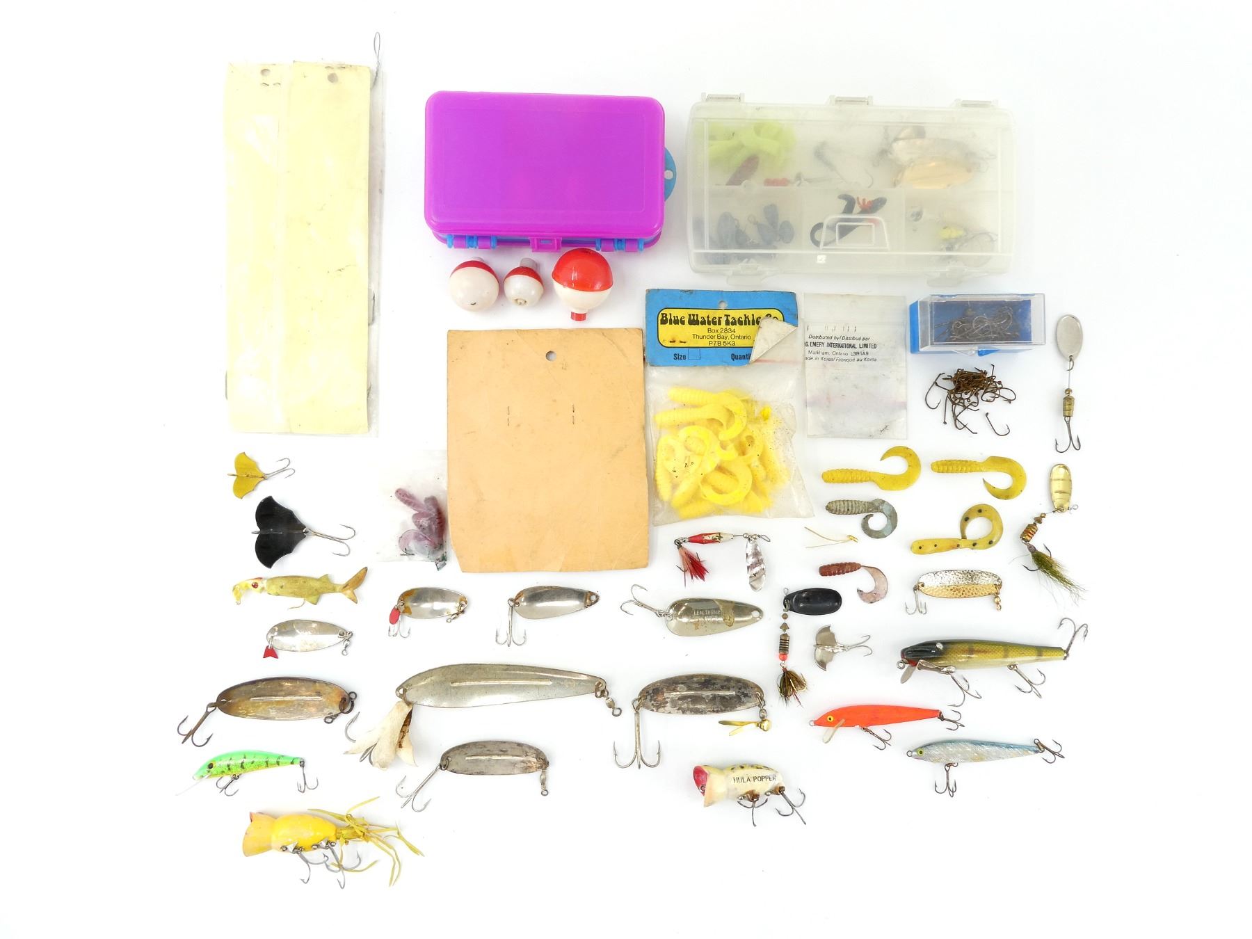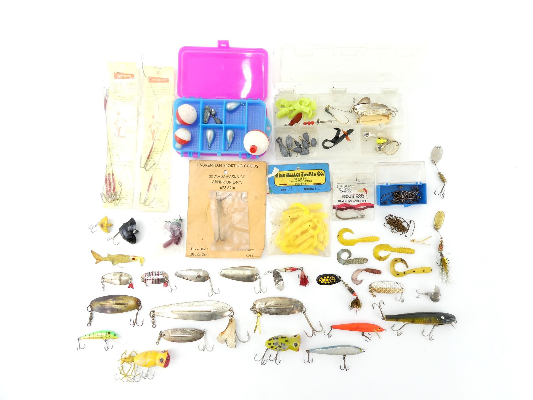 APPROX. (53) PIECES, INCLUDES; FISHING LURES, BOBBINS, ASSORTED SIZES OF HOOKS, RUBBER WORMS, CONTAINER WITH SOME WEIGHTS, CONTAINER WITH JIGS / WEIGHTS, ETC., VARIOUS SIZES / COLOURS / MFGS, SOME APPEAR NOS, SOME SHOW WEAR & TEAR. SEE PHOTOS.