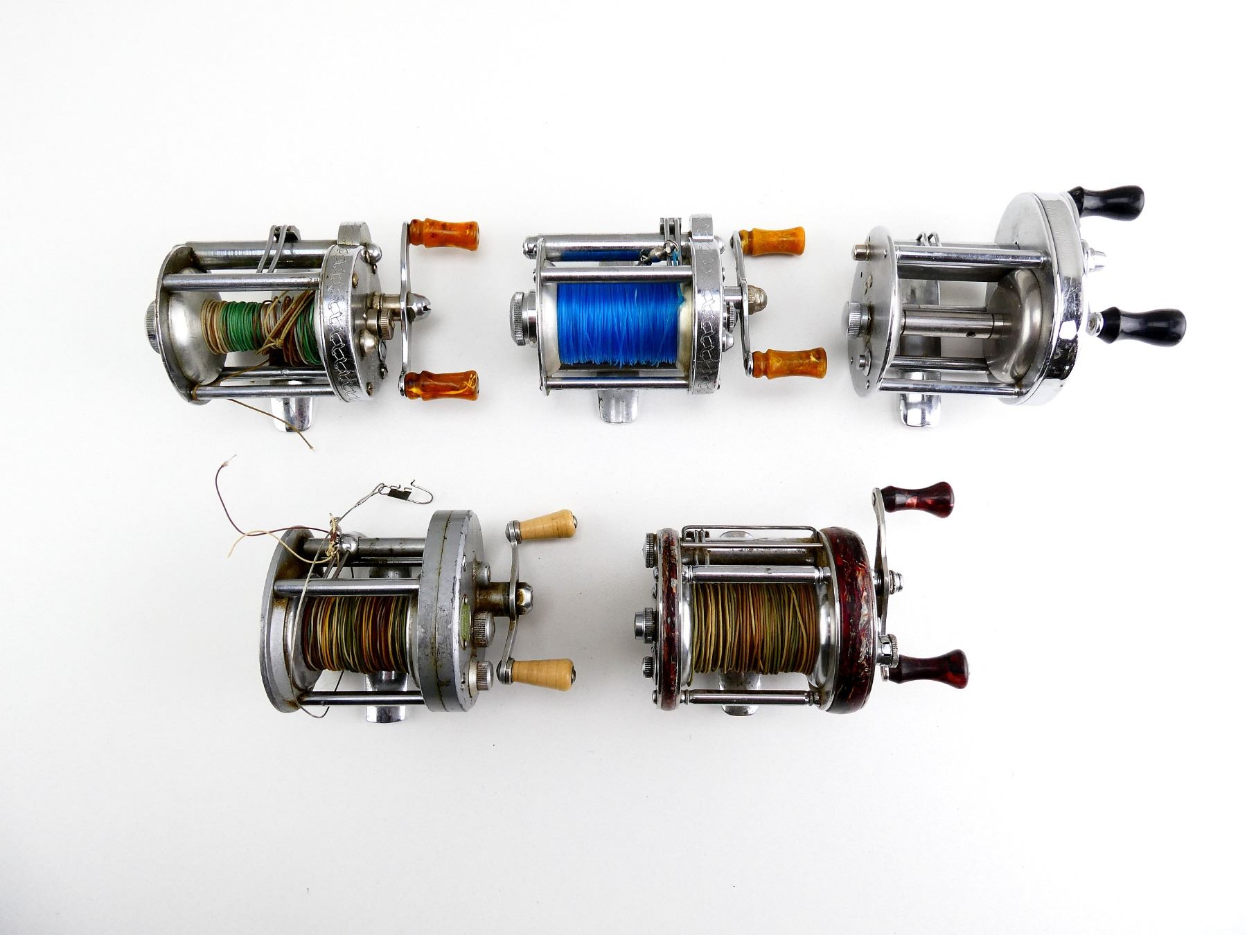 LOT INCLUDES; (5) FISHING REELS, VARIOUS MAKERS, UNTESTED. SEE PHOTOS.
