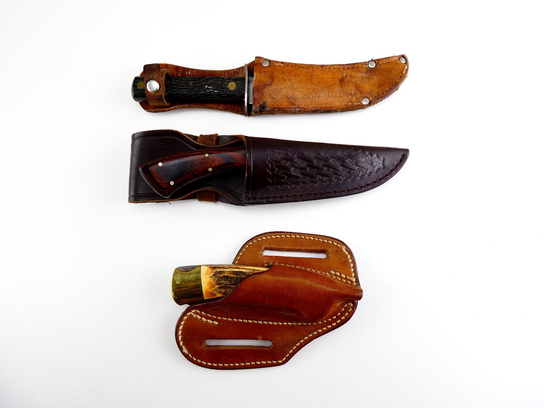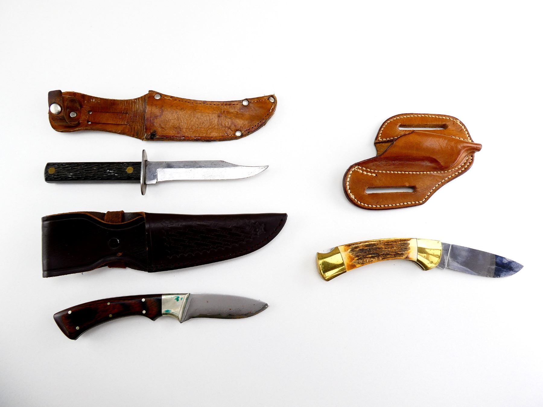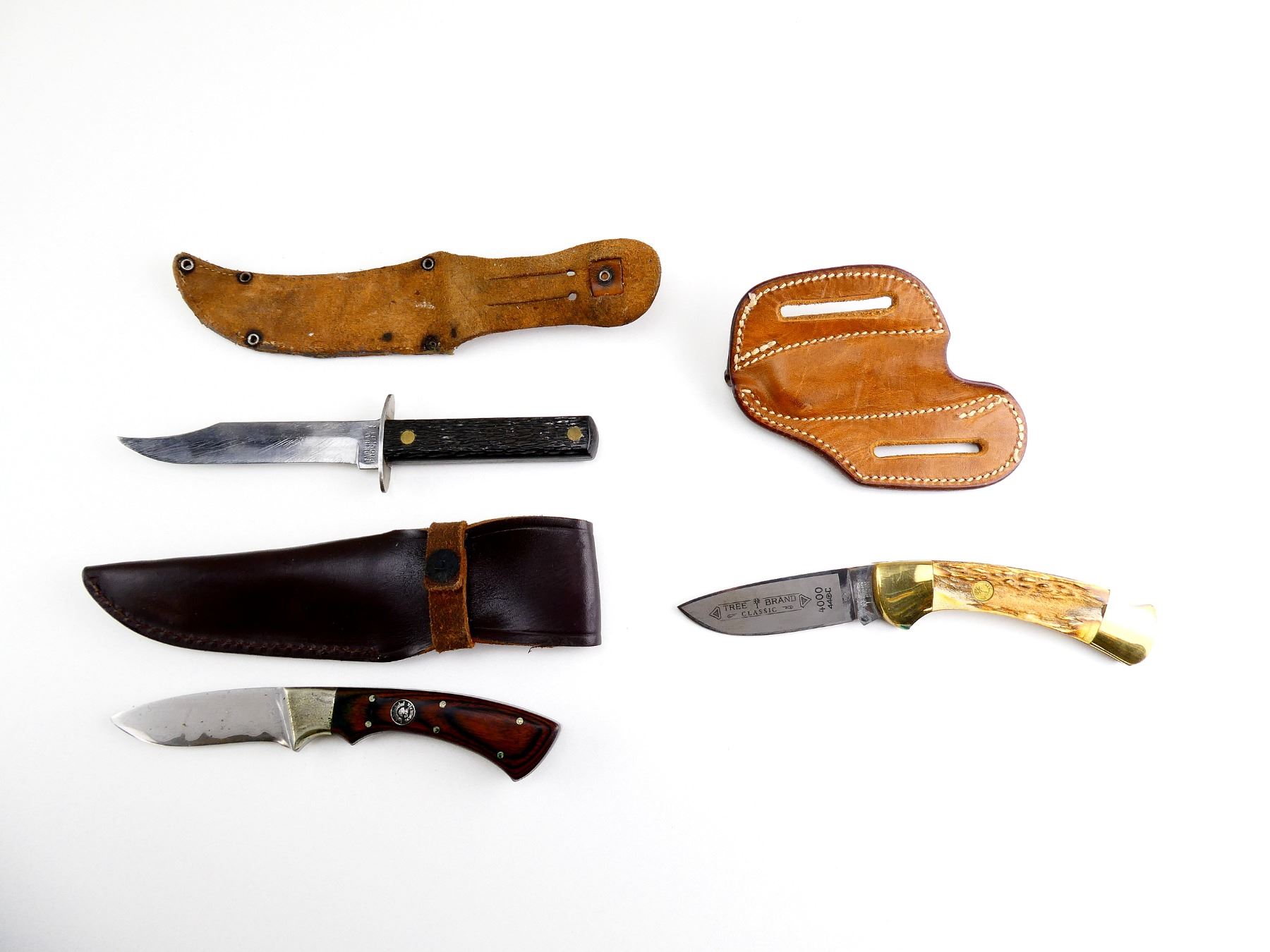 LOT INCLUDES; (2) STEEL FIXED BLADE & (1) STEEL FOLDING BLADE KNIVES, ASSORTED CONSTRUCTION GRIPS, VARIOUS MARKINGS, LEATHER SHEATHS, BLADES APPROX. 3"-4.75" & OAL APPROX. 7.5"-8.5". SEE PHOTOS.