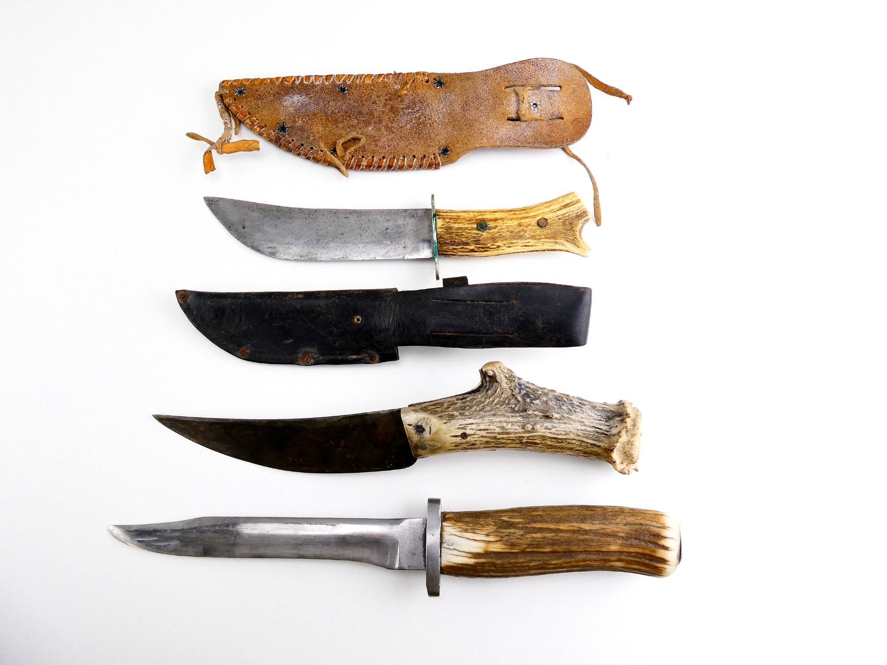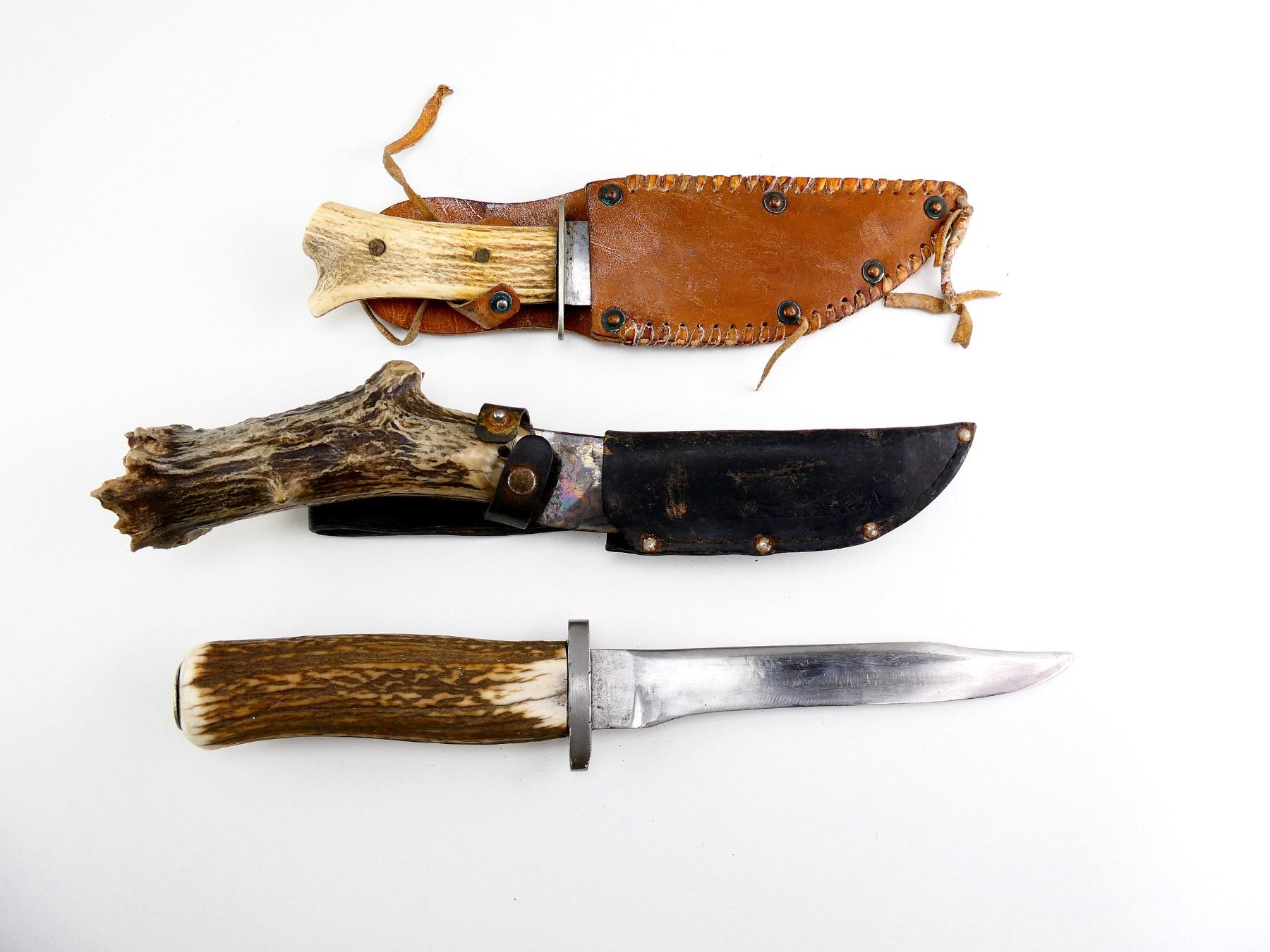 LOT INCLUDES; (3) STEEL FIXED BLADE KNIVES, BONE / ANTLER TYPE GRIP, UNMARKED, TWO WITH LEATHER SHEATHS, BLADES APPROX. 6"-7.25" & OAL APPROX. 10"-13". SEE PHOTOS.